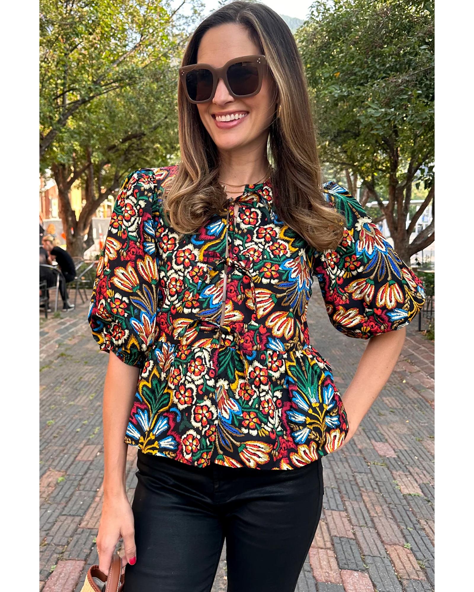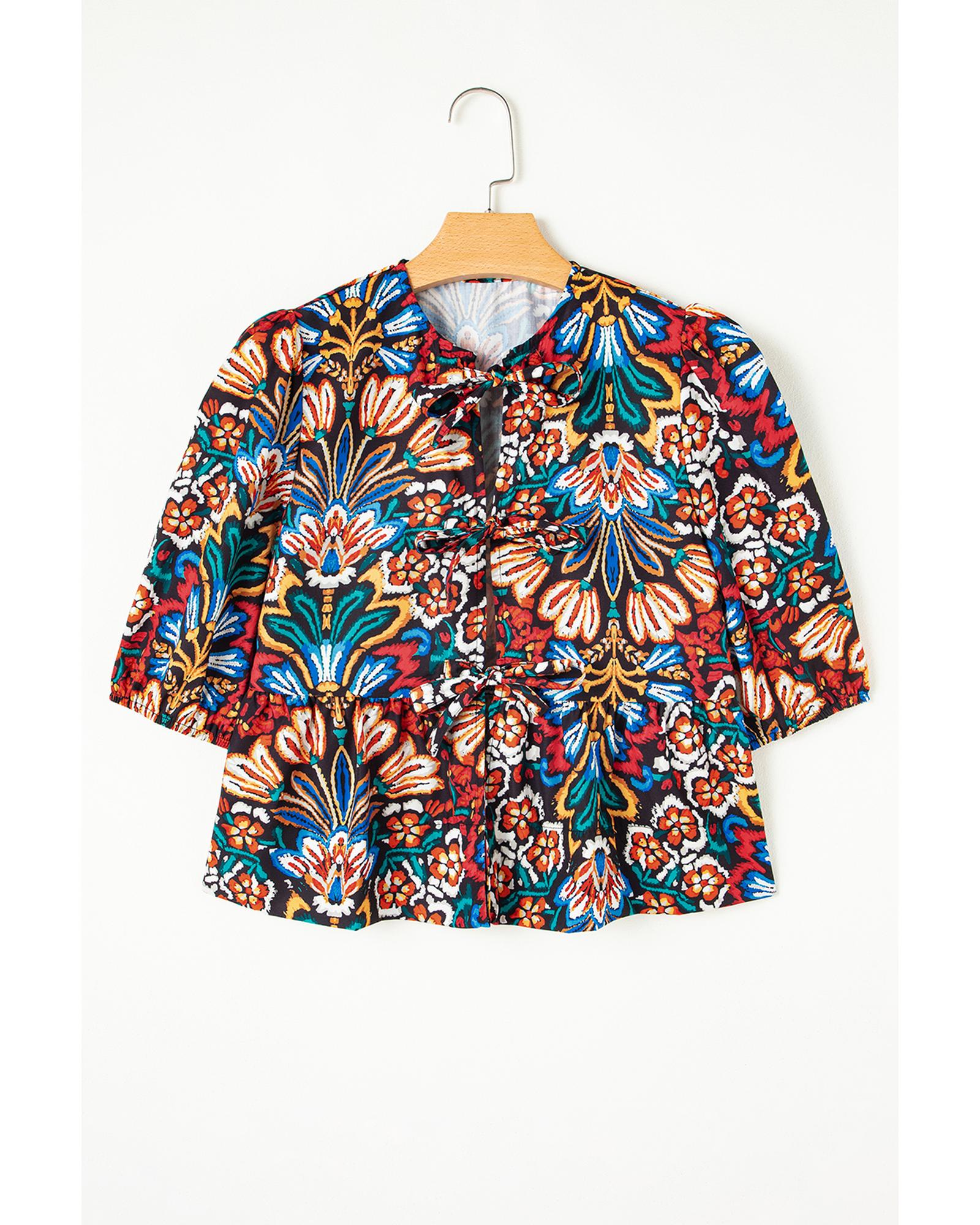 Black Tropical Print Bubble Sleeve Knot Front Blouse – L
