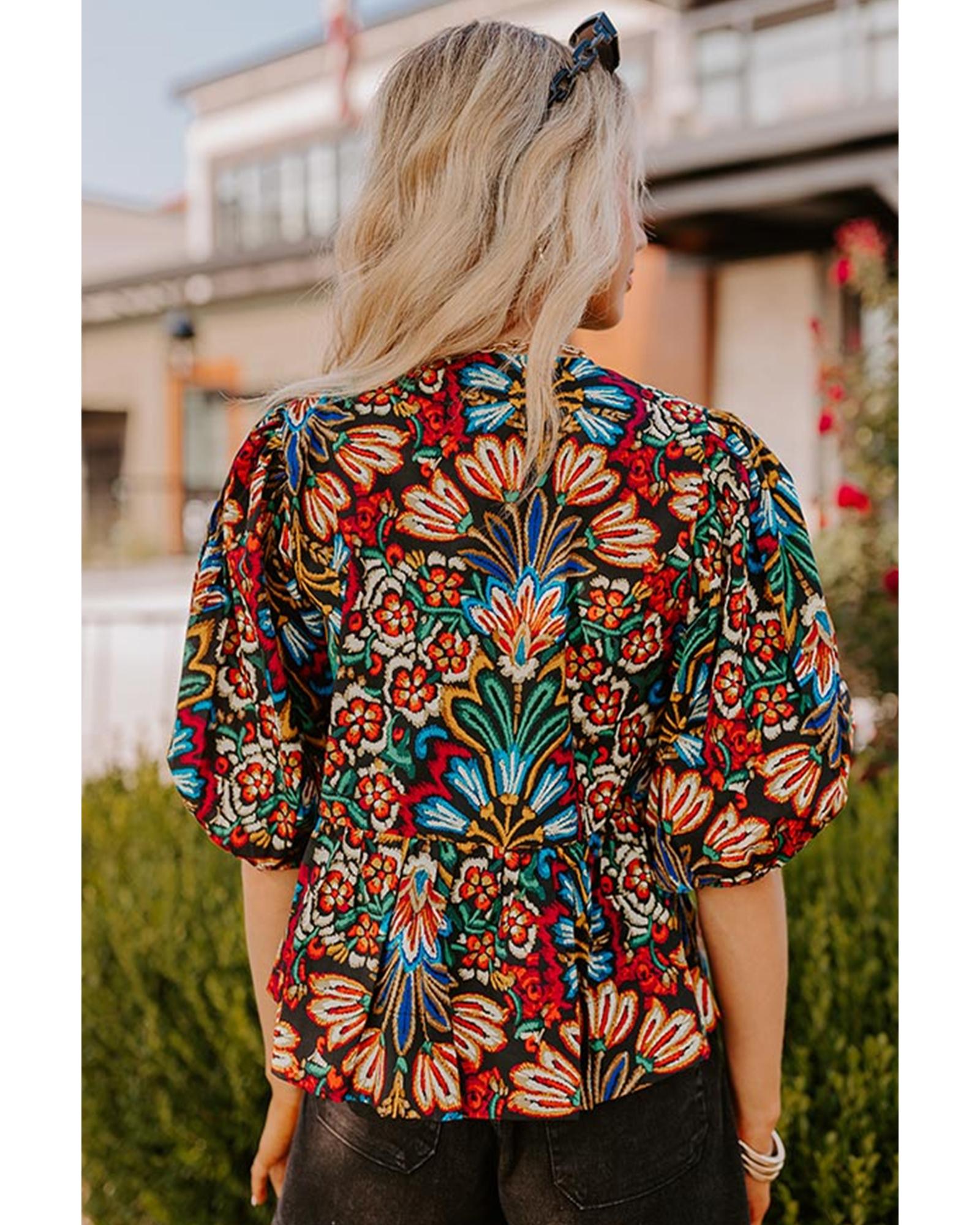 Black Tropical Print Bubble Sleeve Knot Front Blouse – S