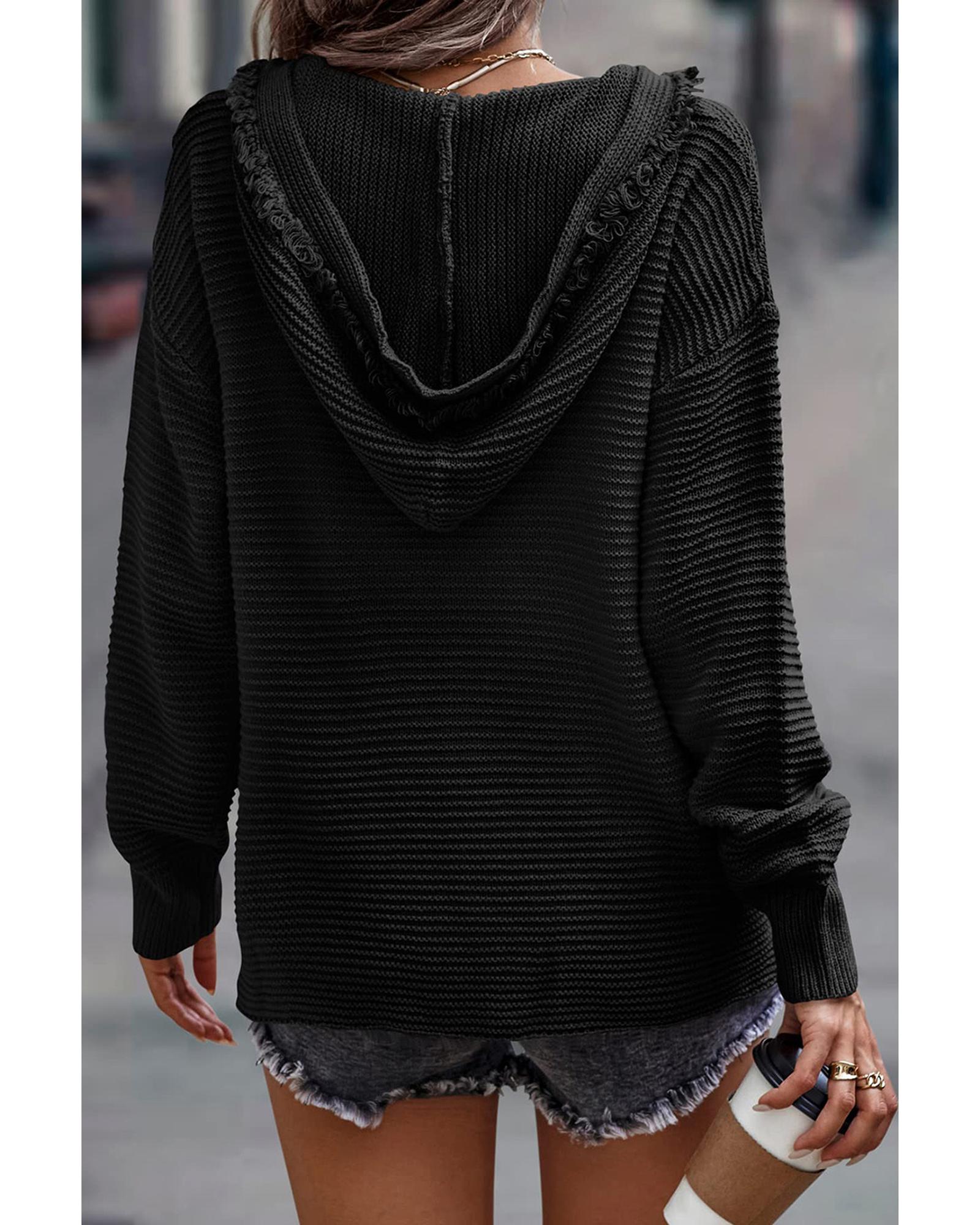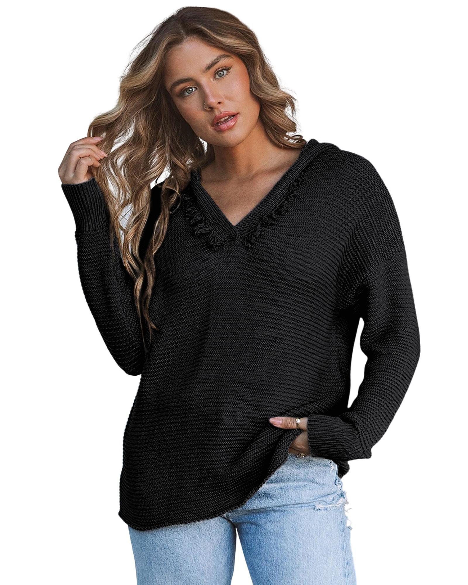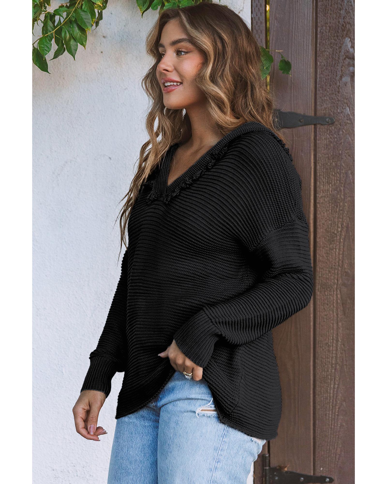 Black V Neck Ribbed Drop Shoulder Hooded Sweater – M