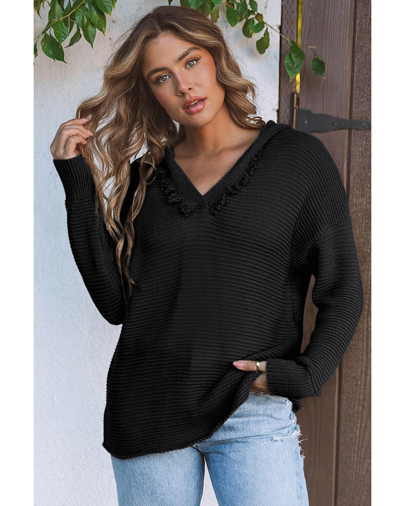 Black V Neck Ribbed Drop Shoulder Hooded Sweater – S