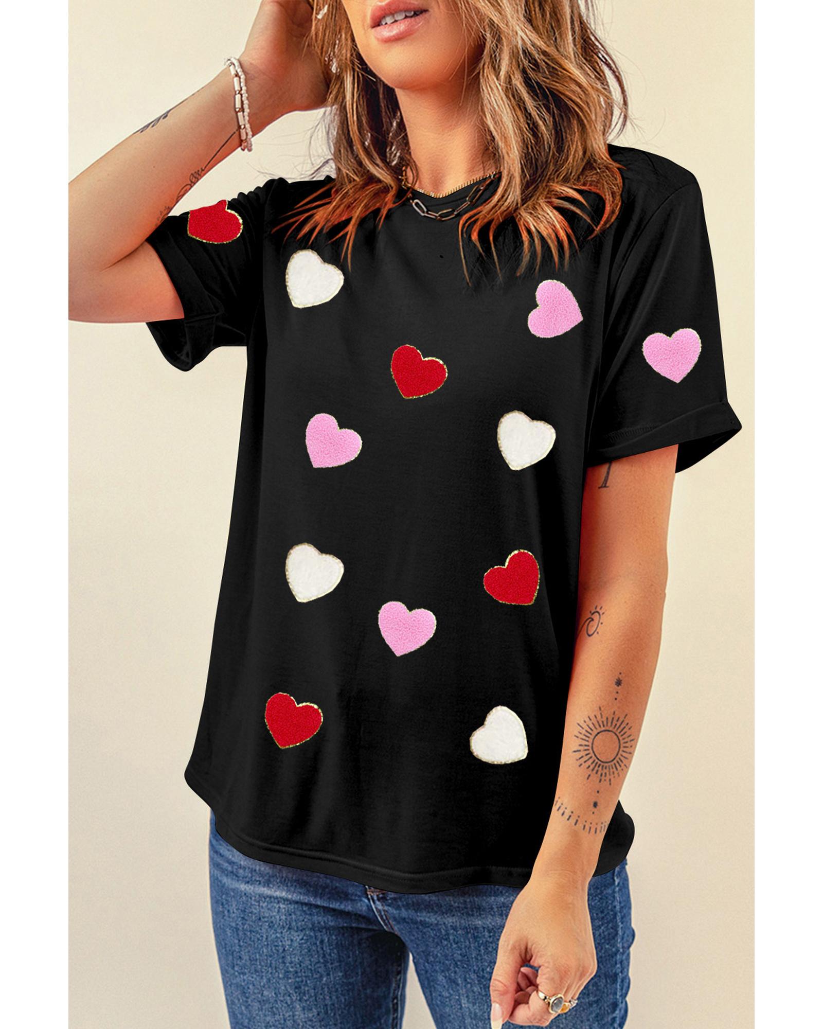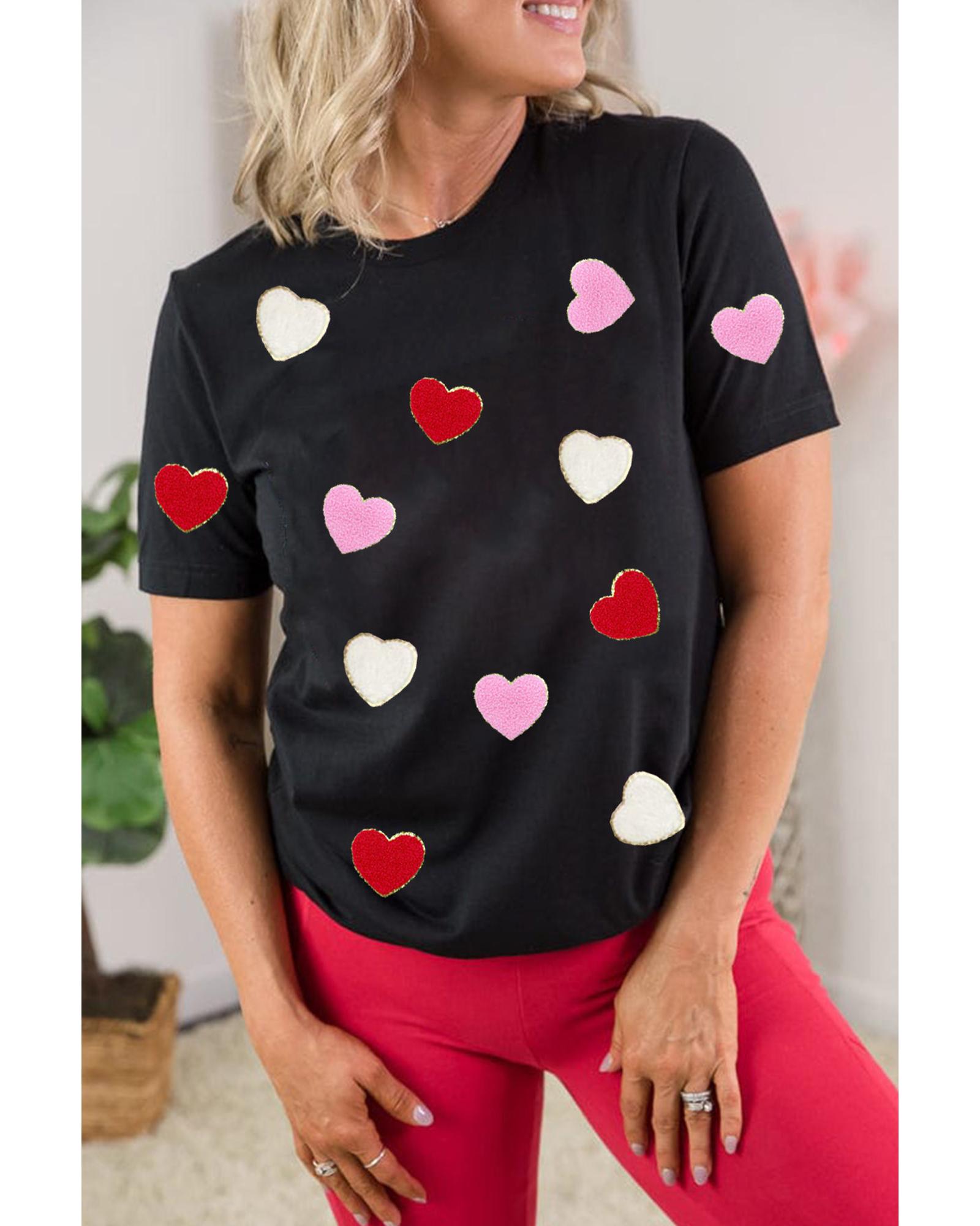 Black Valentines Chenille Heart Patched Pattern Crewneck Tee – M