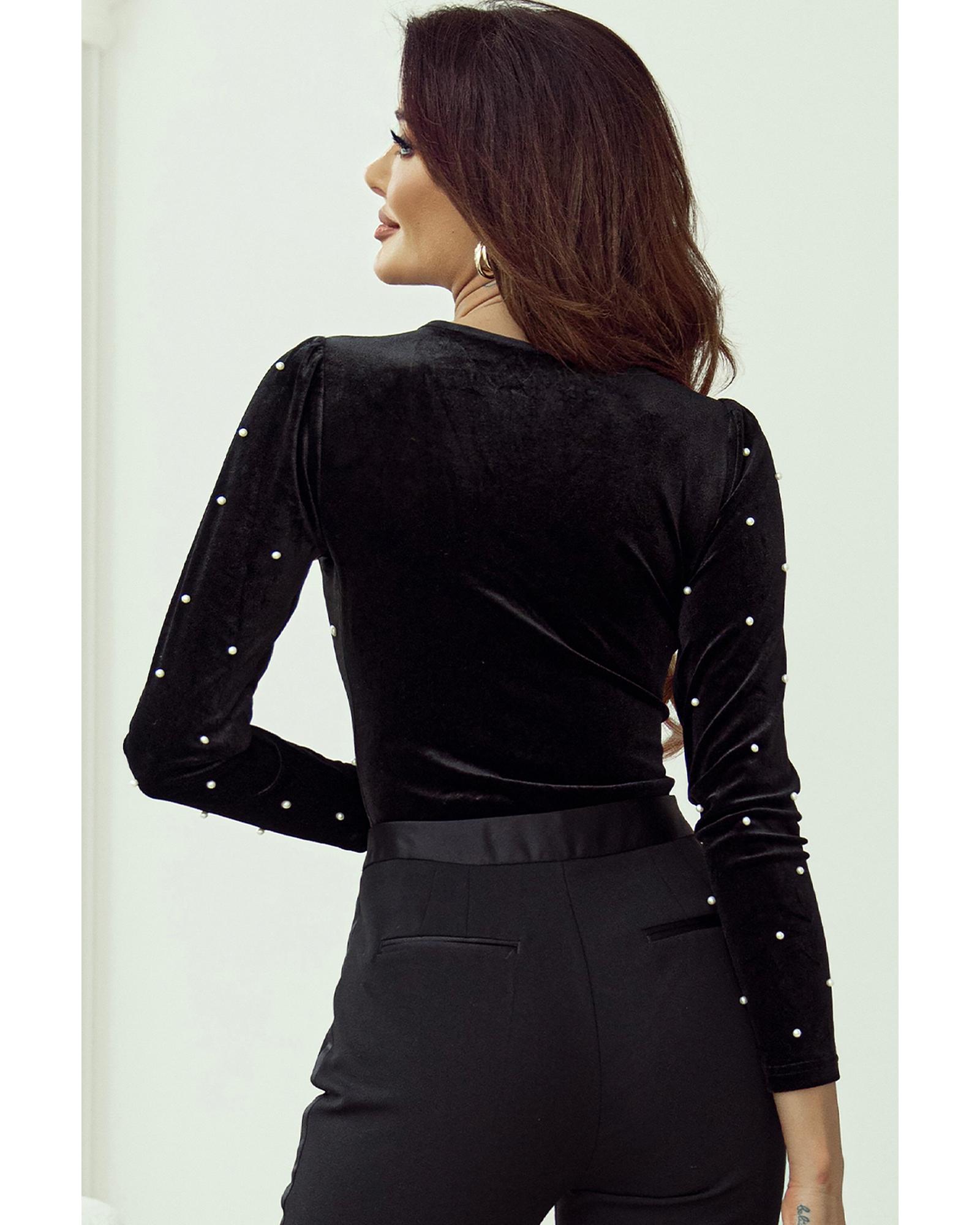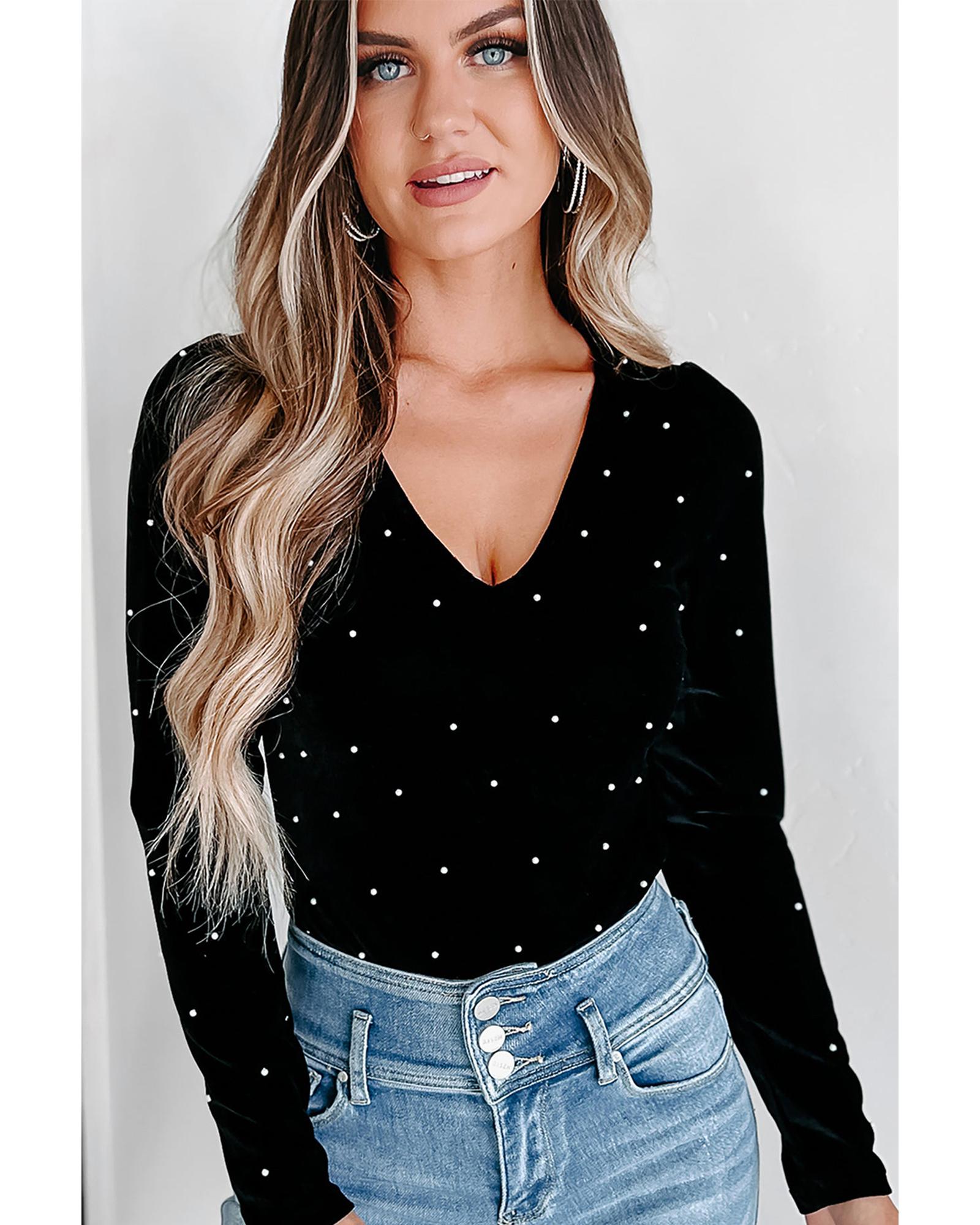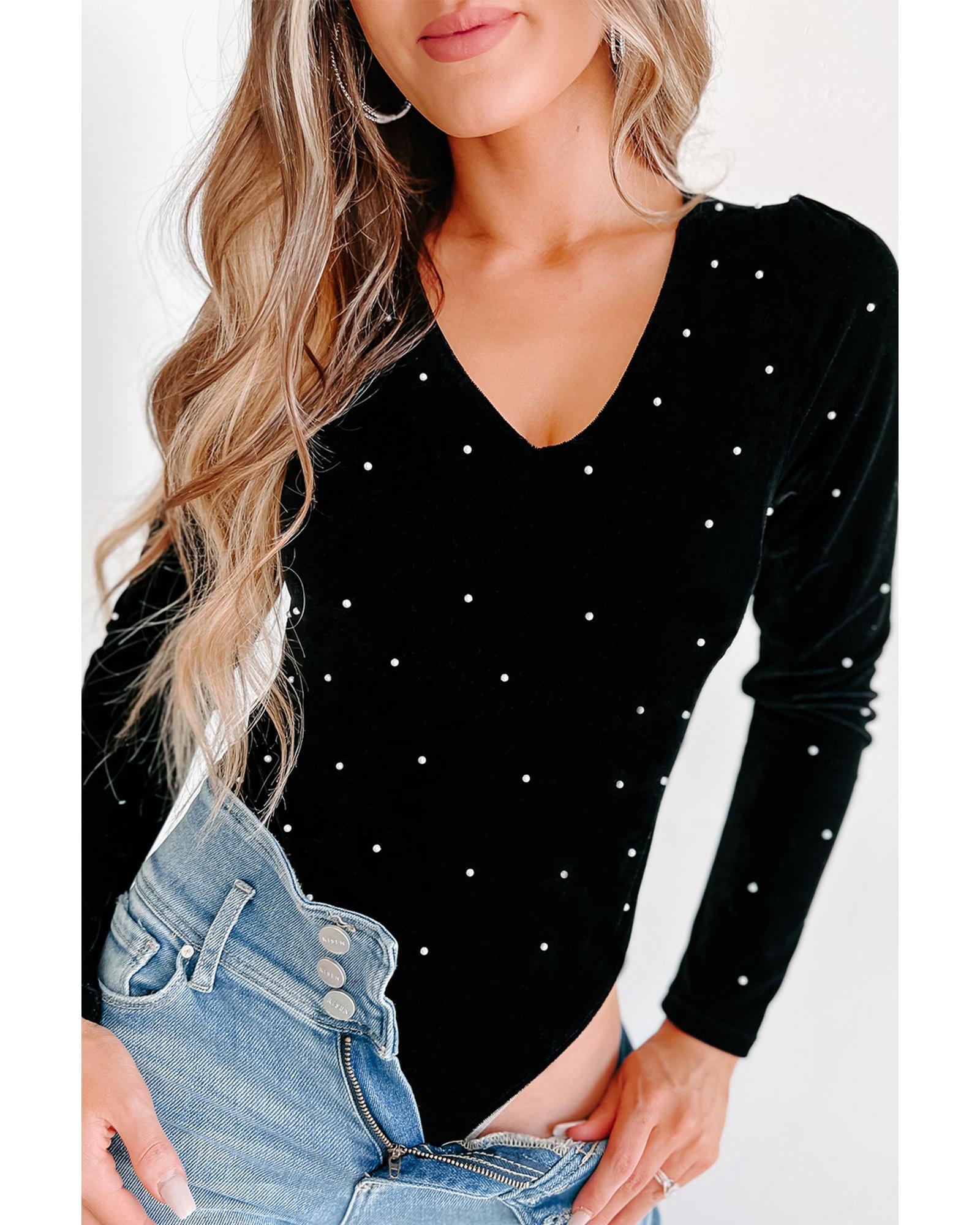 Black Velvet Beaded Long Sleeve V Neck Bodysuit – L
