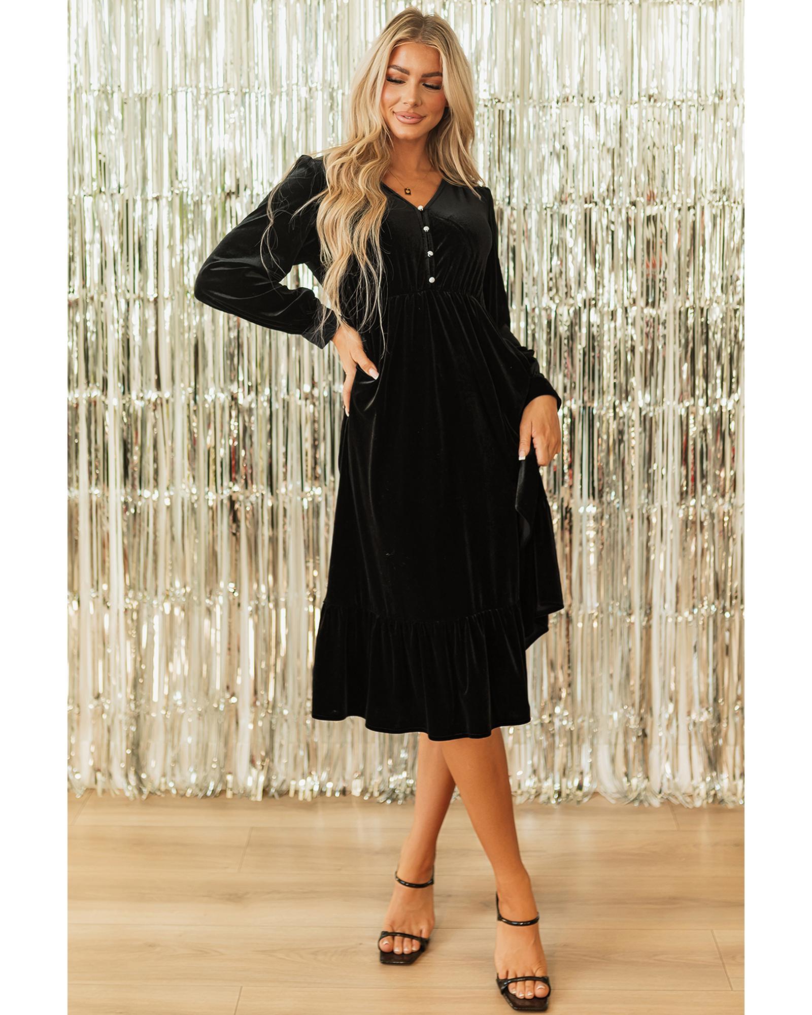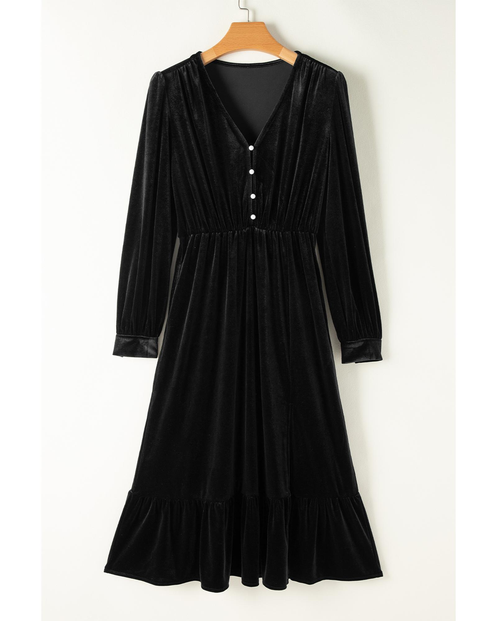 Black Velvet Buttoned Puff Sleeve V Neck Split Midi Dress – XL