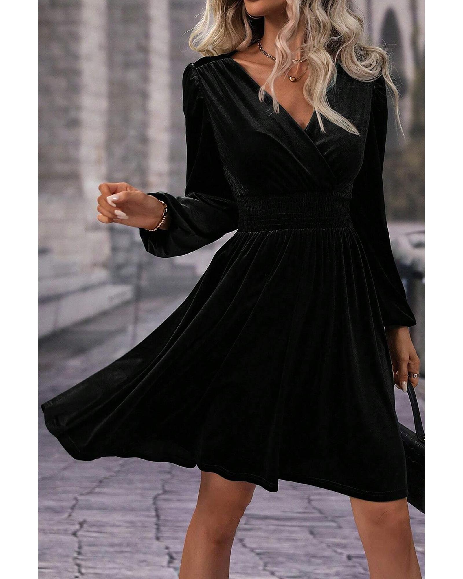 Black Velvet Long Sleeve Surplice High Waist Mini Dress – S