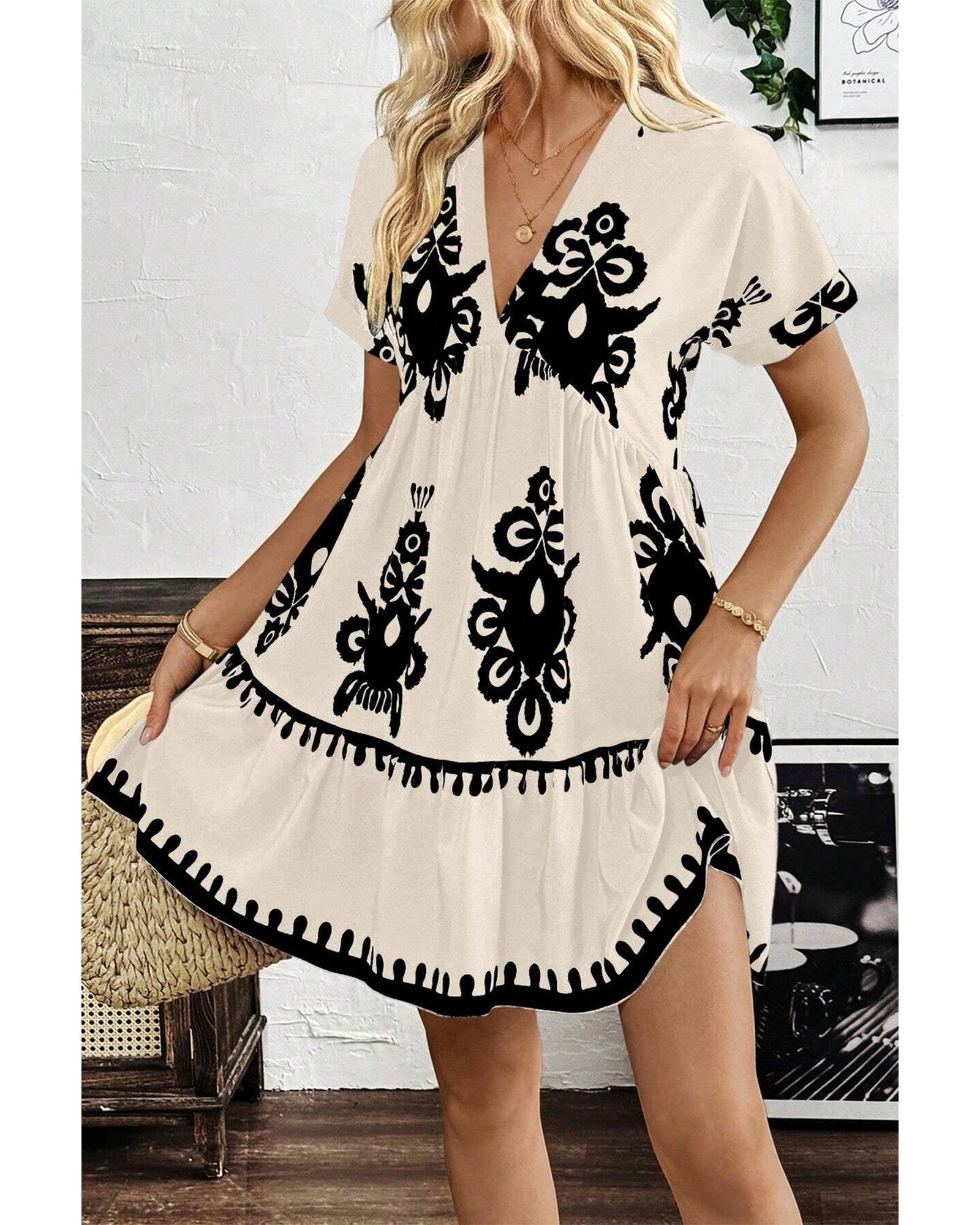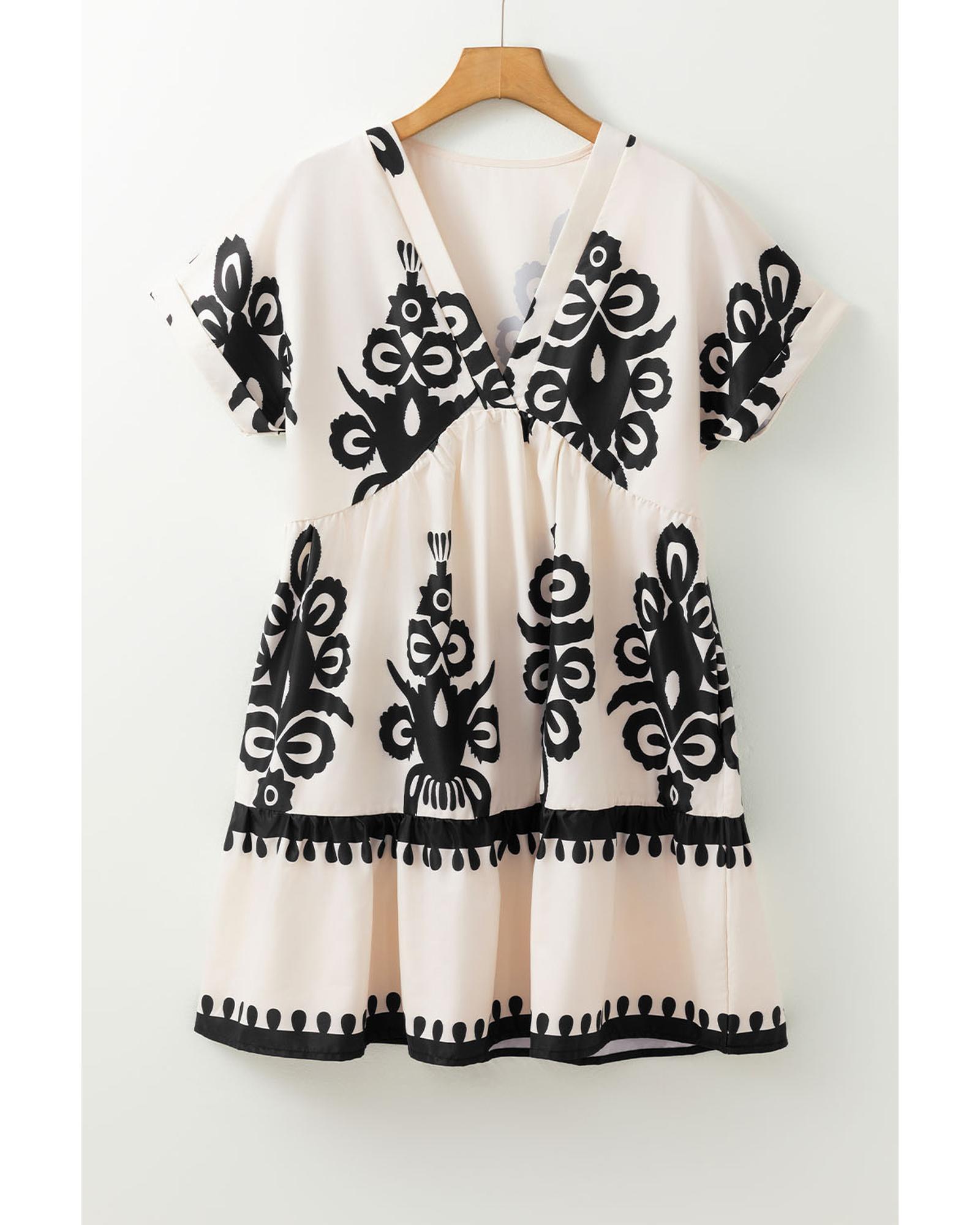 Black Vintage Print V Neck High Waist Short Sleeve Dress – XL