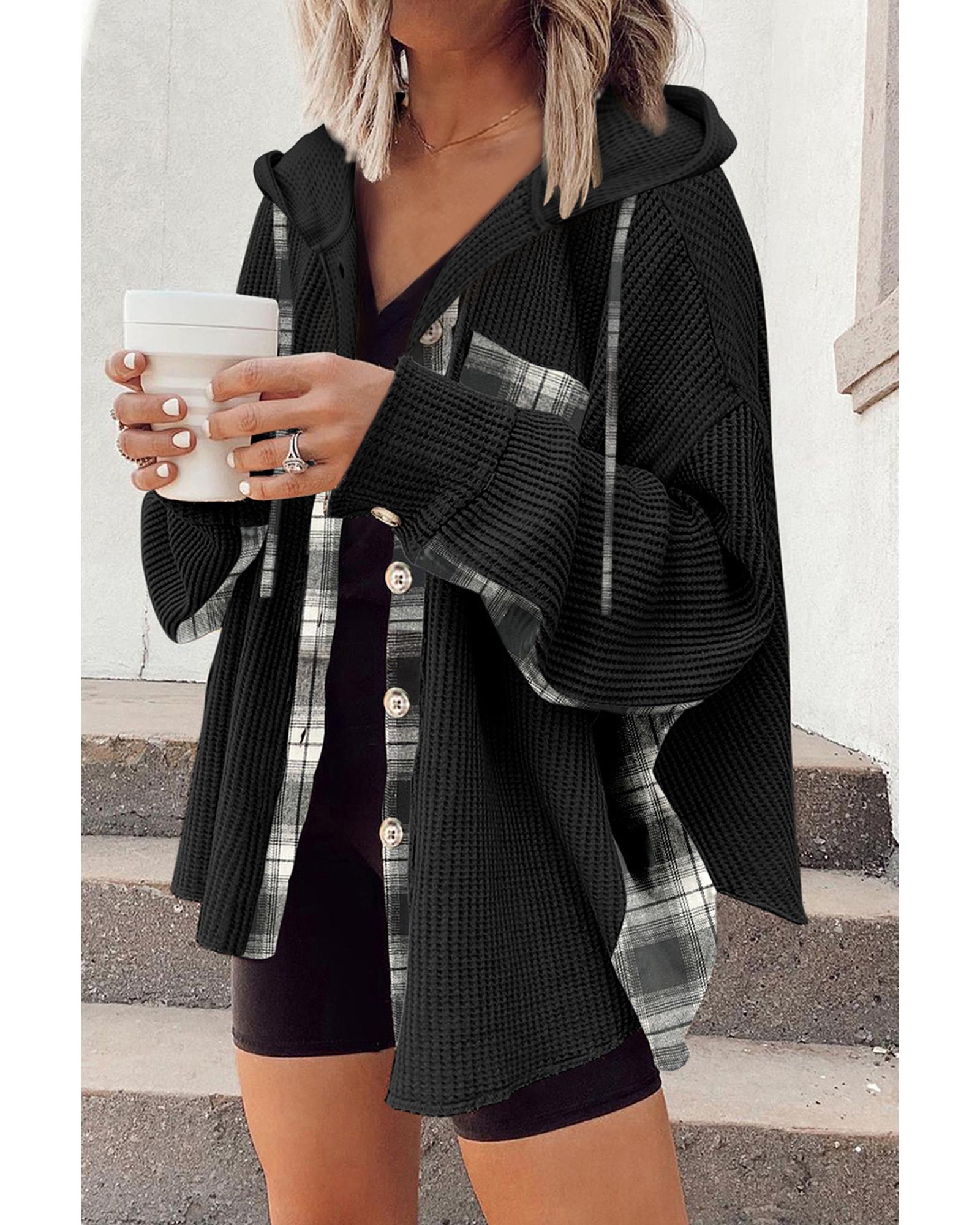 Black Waffle Knit Plaid Patchwork Drawstring Hooded Shacket – L