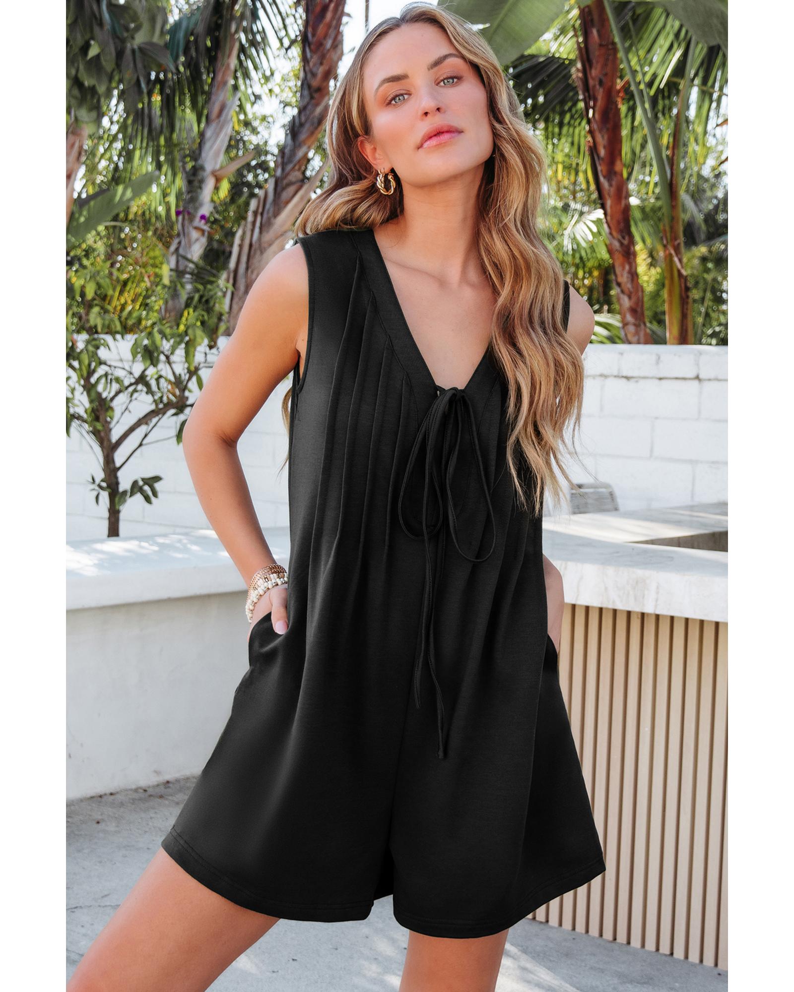 Black white Tie V Neck Pintuck Sleeveless Loose Romper – 2XL