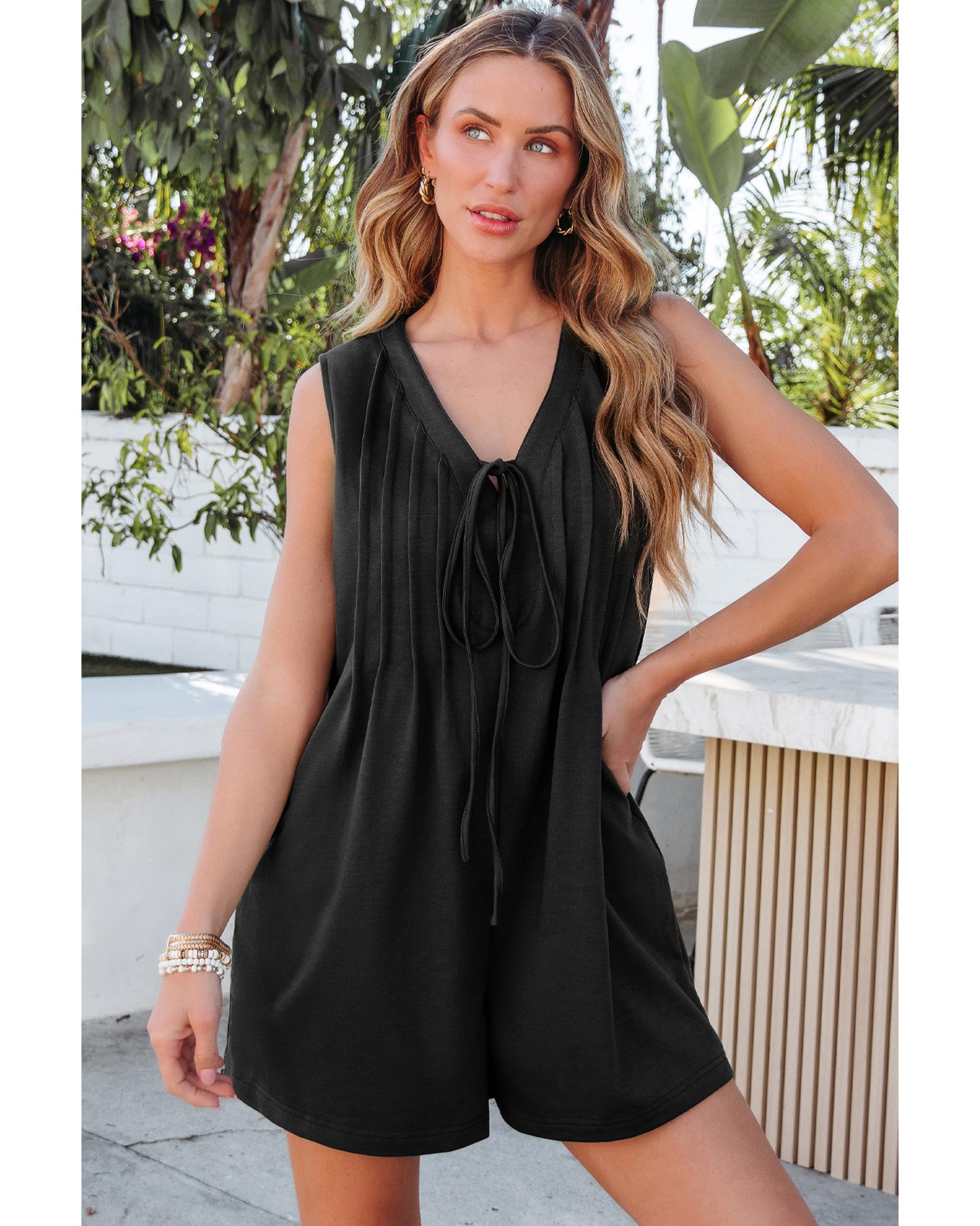 Black white Tie V Neck Pintuck Sleeveless Loose Romper – L