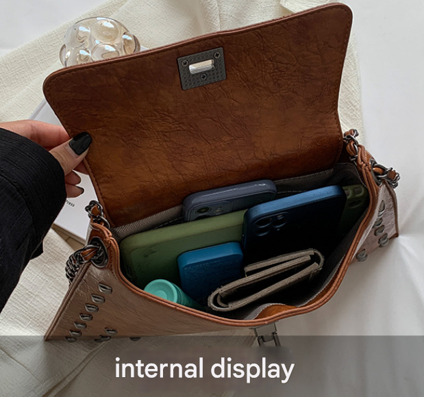 - Retro Design: Envelope-style bag with studded decorations for a chic, vintage look.