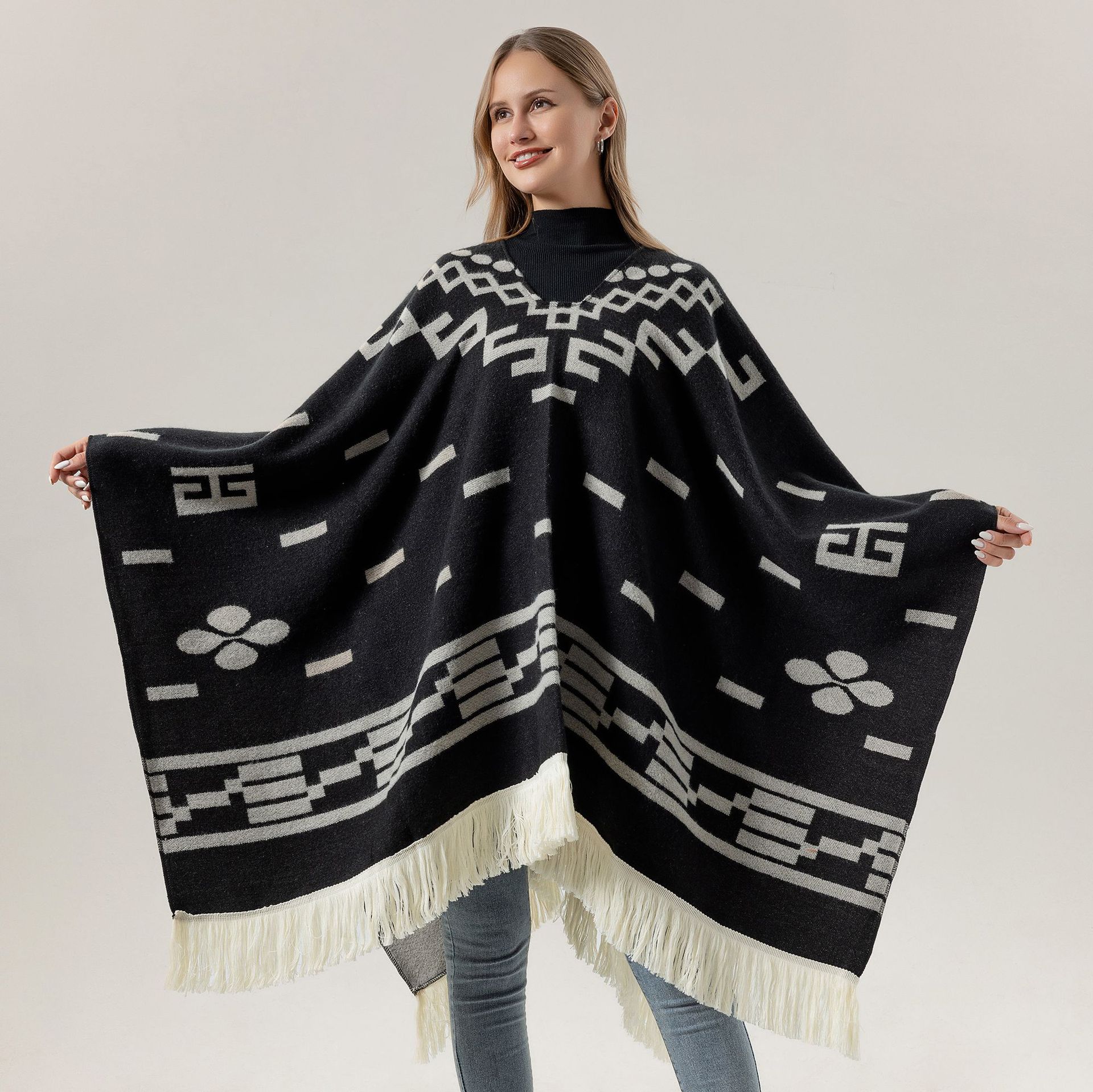 Black Women’s Versatile Faux Cashmere Poncho Cape Shawl with Geometric Pattern & Fringe Trim – One Size