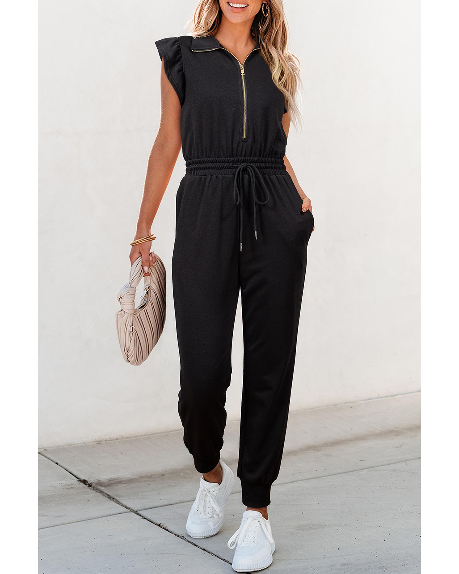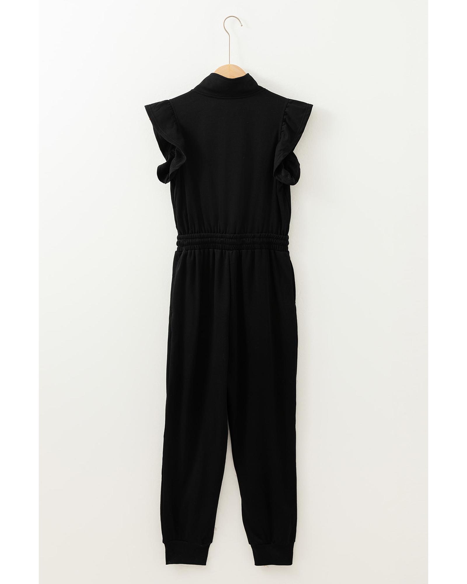 Black Zipper Flutter Sleeve Drawstring High Waist Jumpsuit – M
