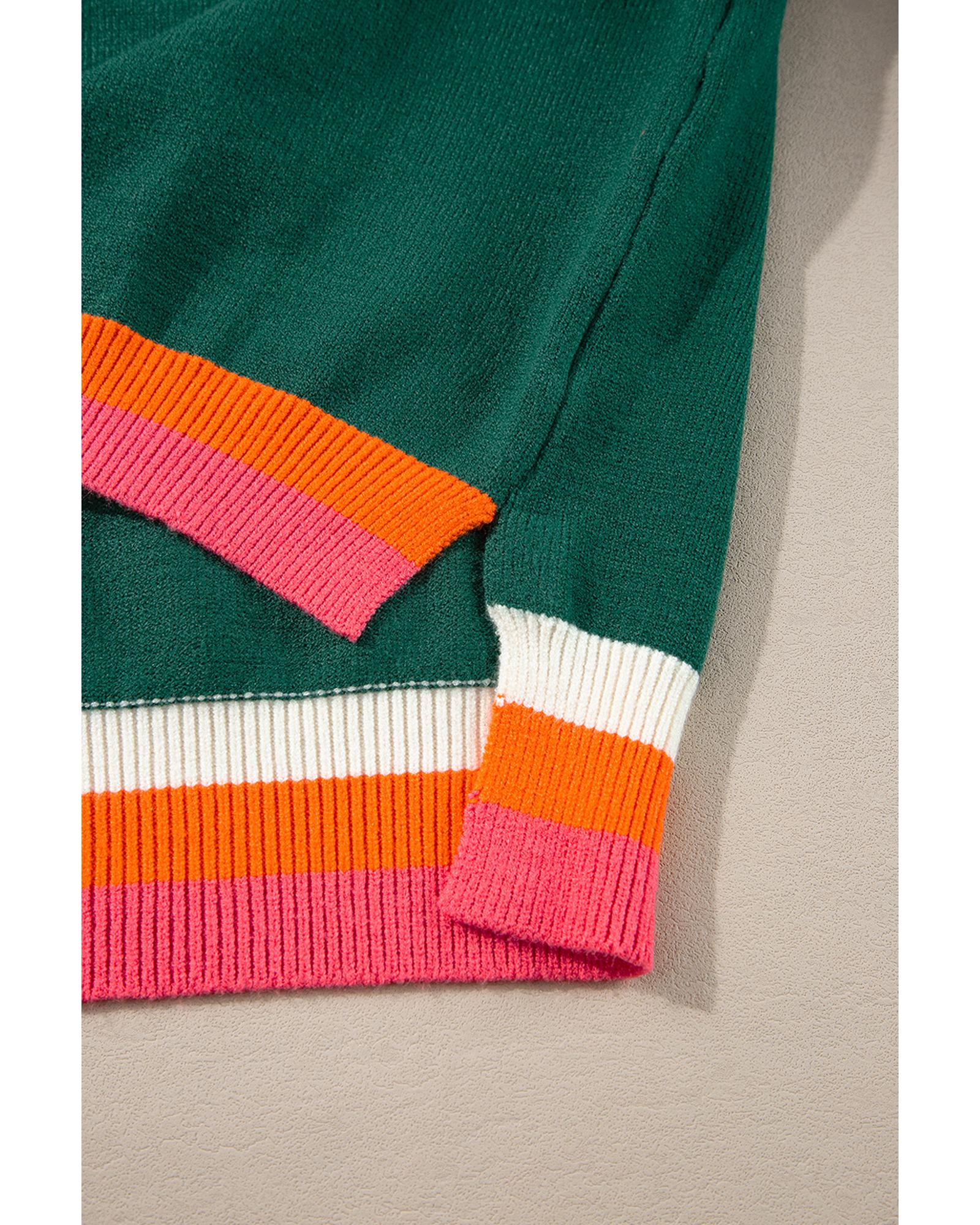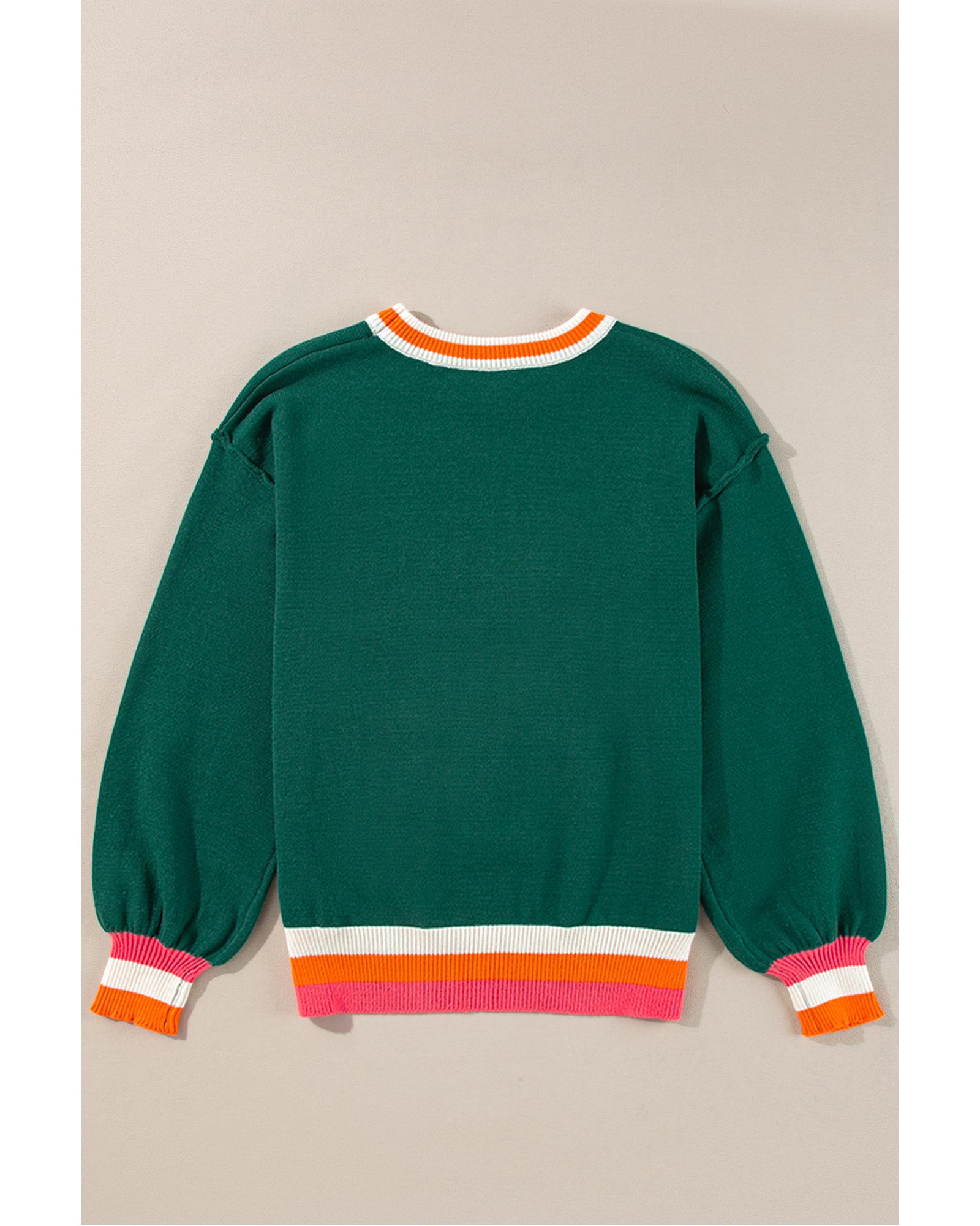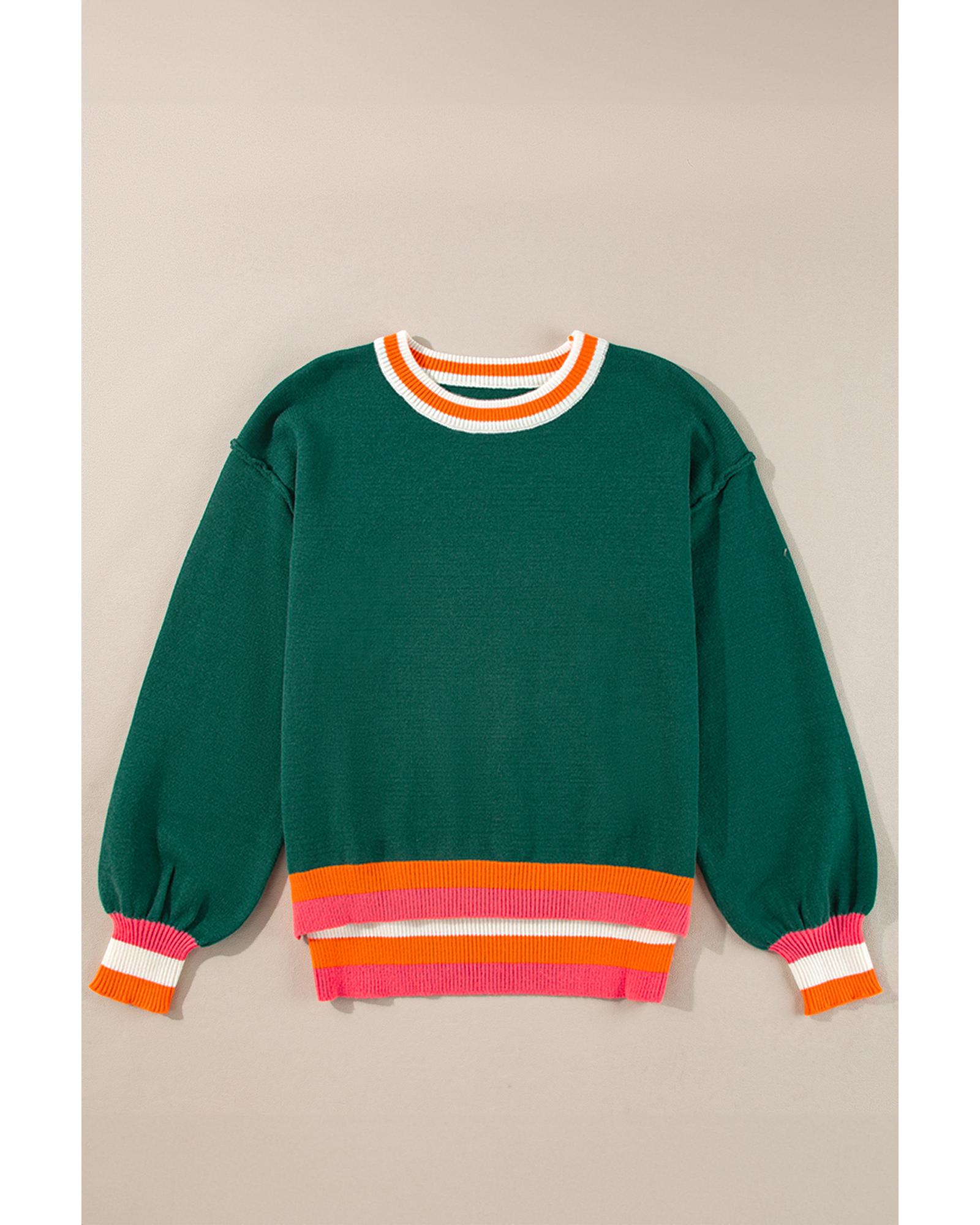 Blackish Green Colorblock Striped Trim Drop Shoulder Sweater – XL