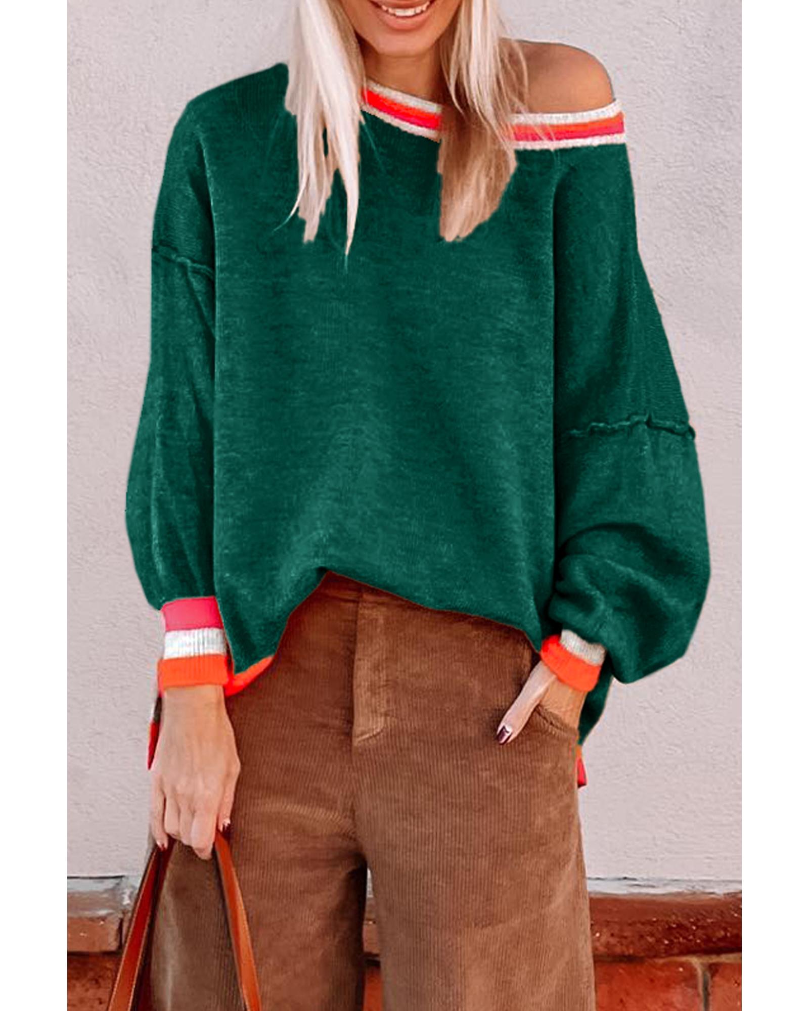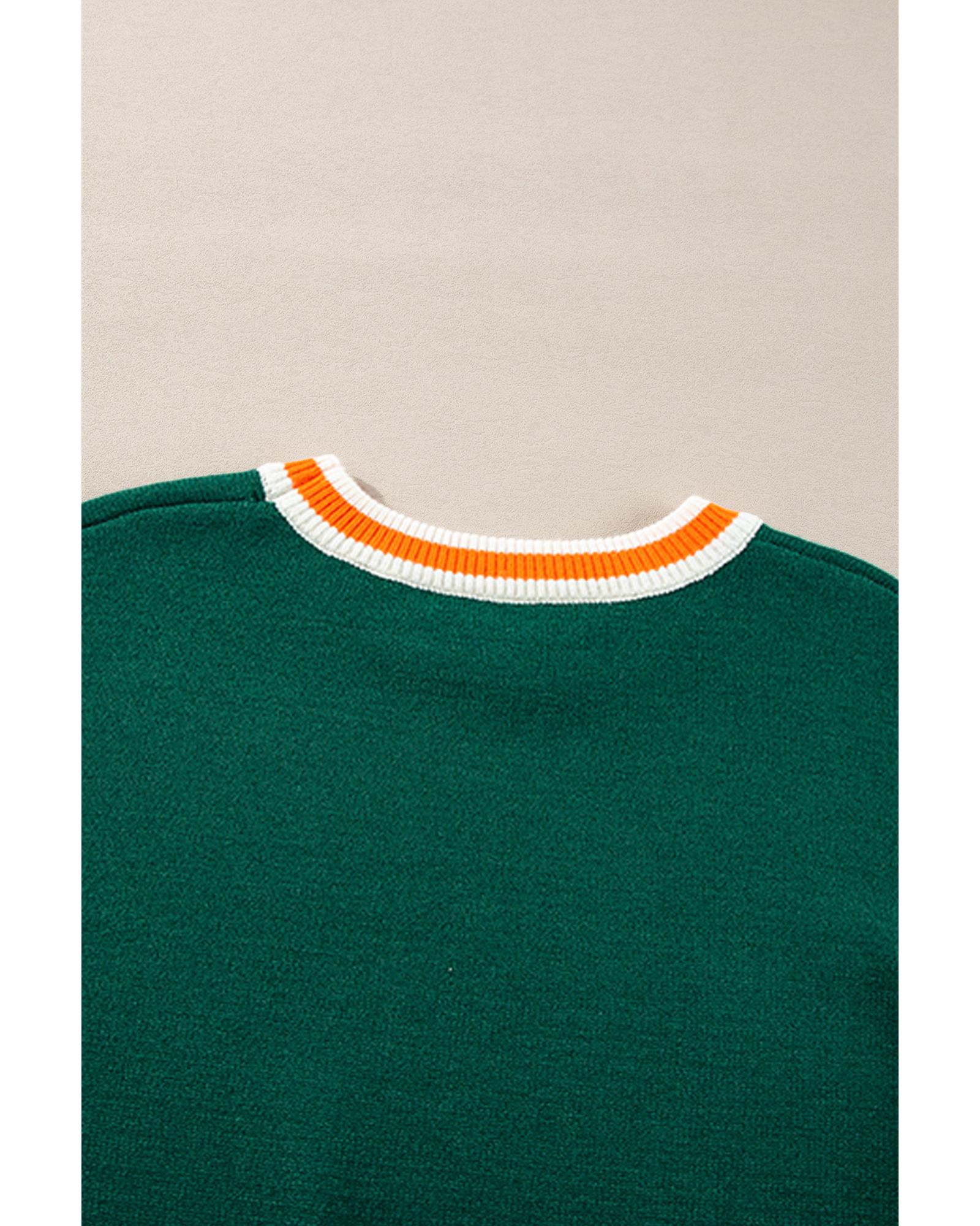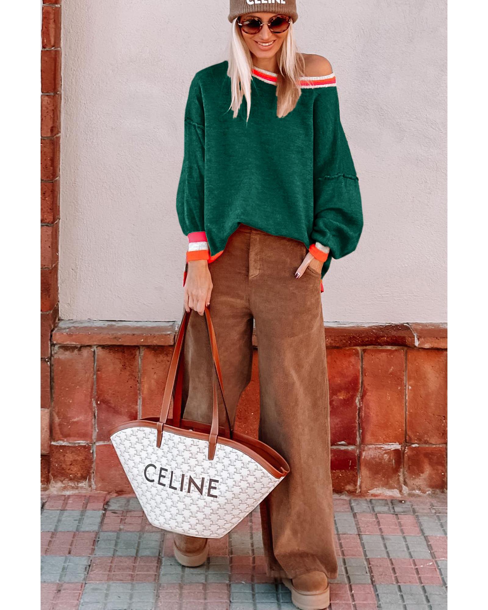 Blackish Green Colorblock Striped Trim Drop Shoulder Sweater – XL