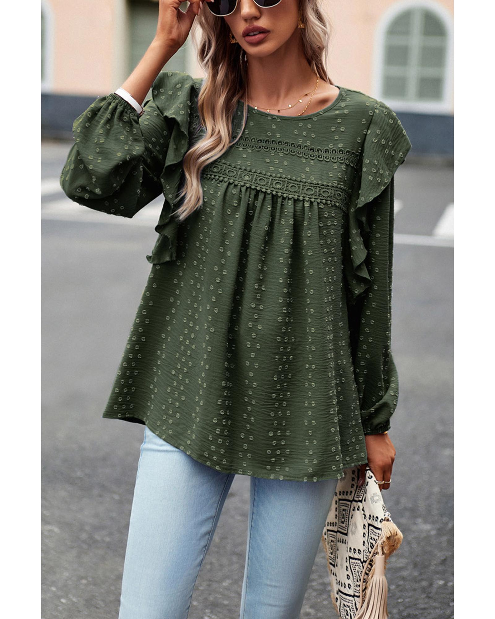 Blackish Green Lace Eyelet Ruffle Shoulder Long Sleeve Blouse – M