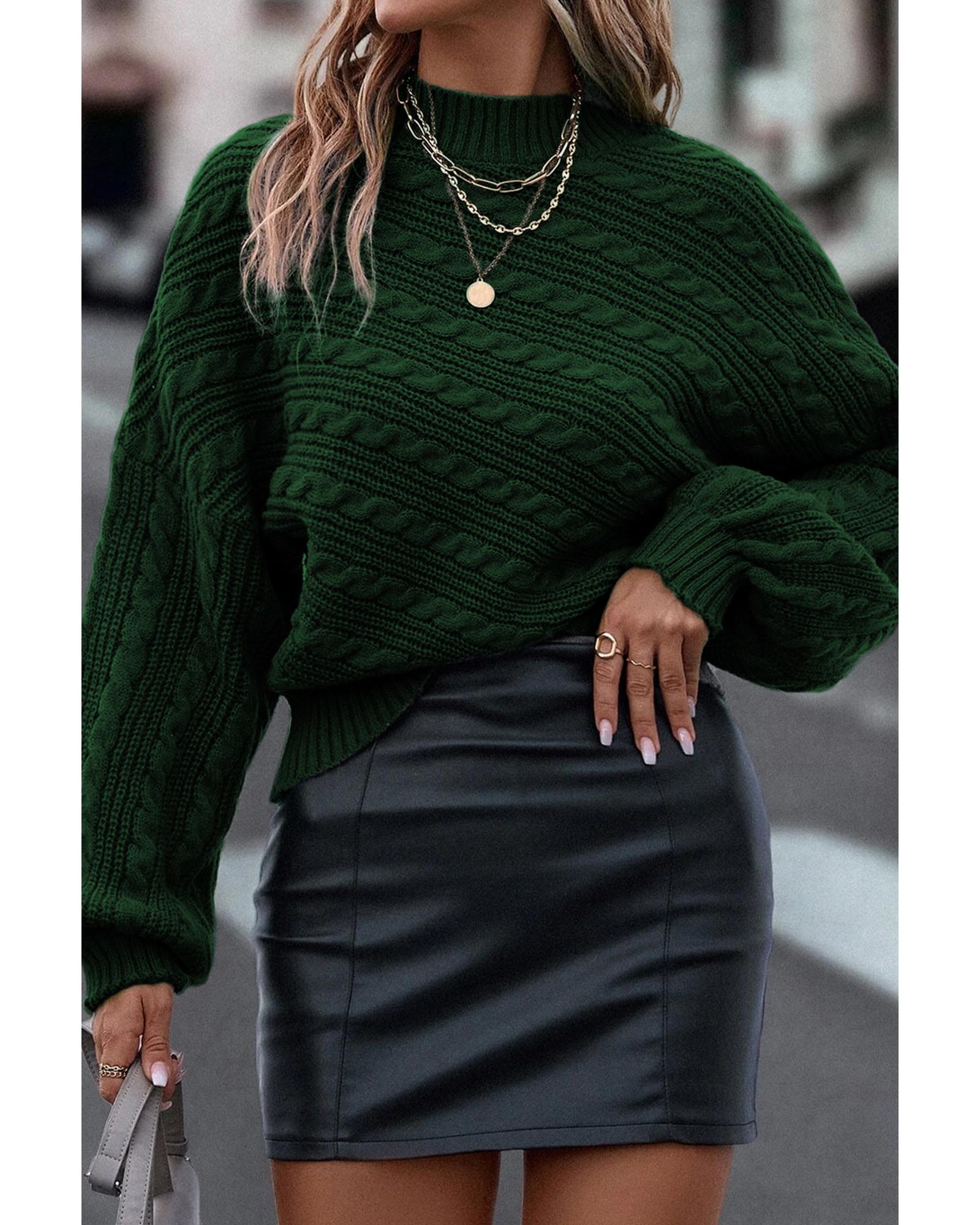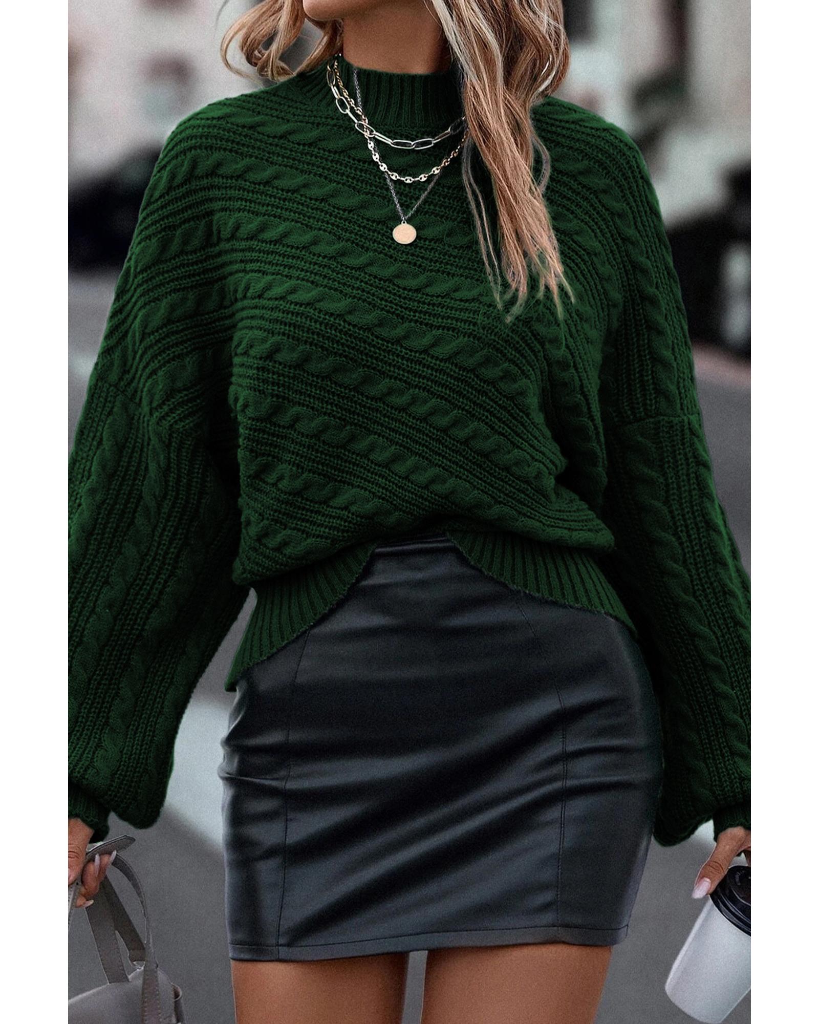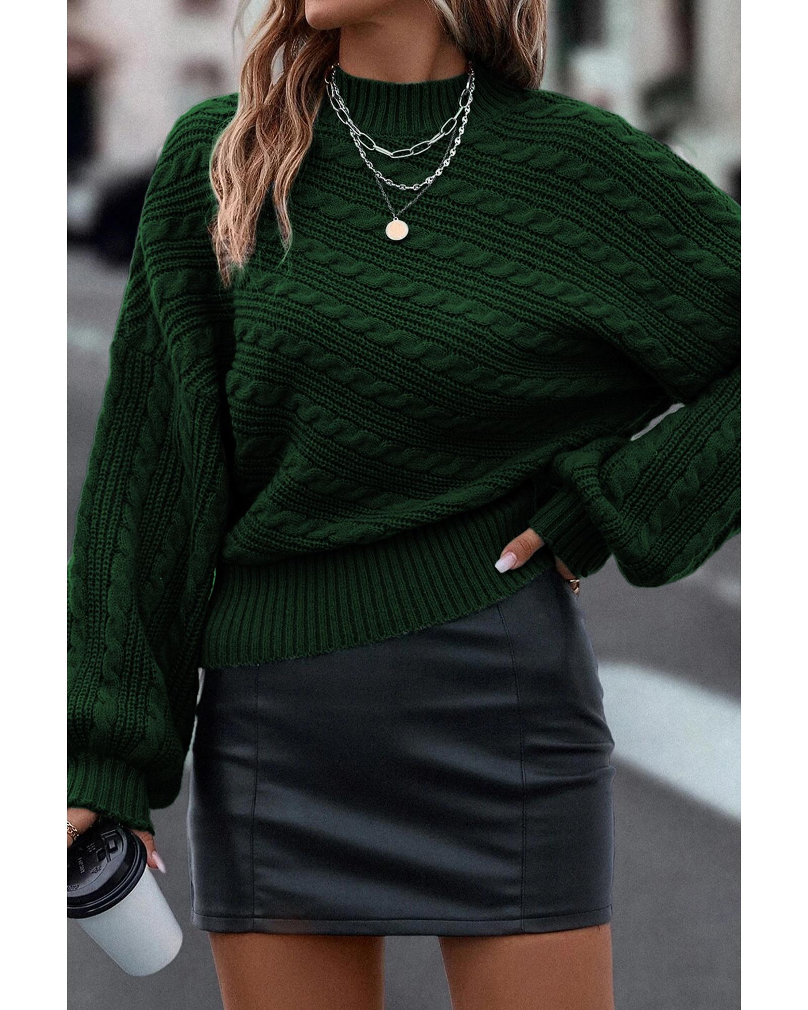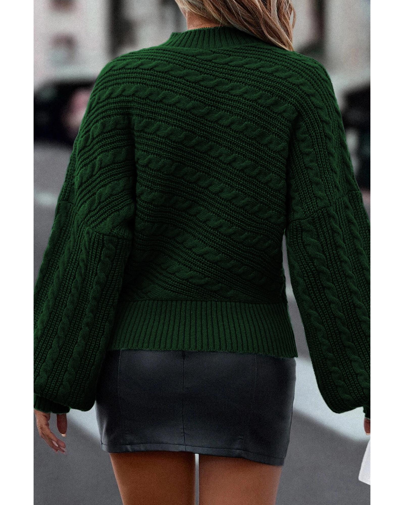 Blackish Green Mock Neck Lantern Sleeve Cable Knit Sweater – L