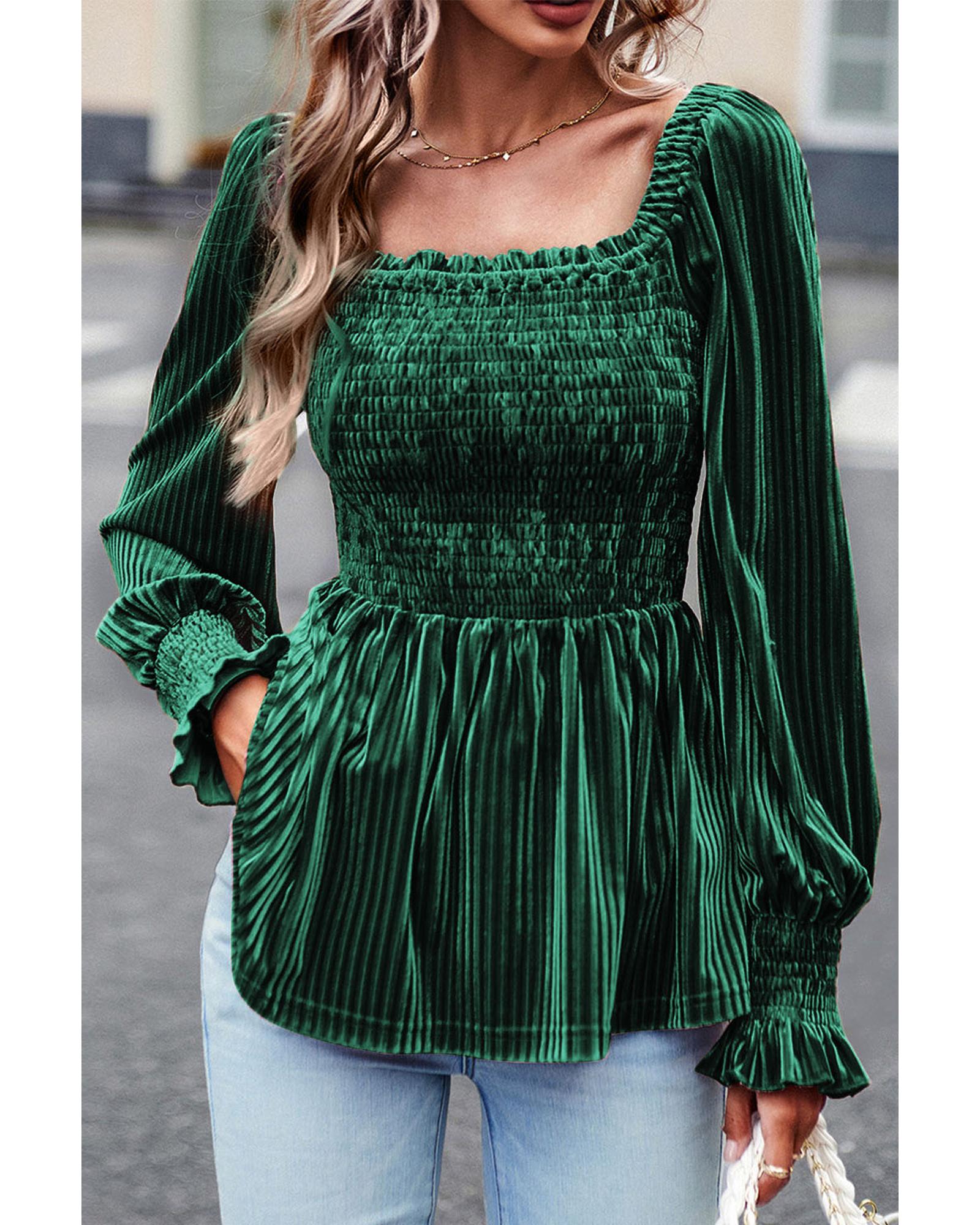 Blackish Green Smocked Ribbed Velvet Babydoll Top – L