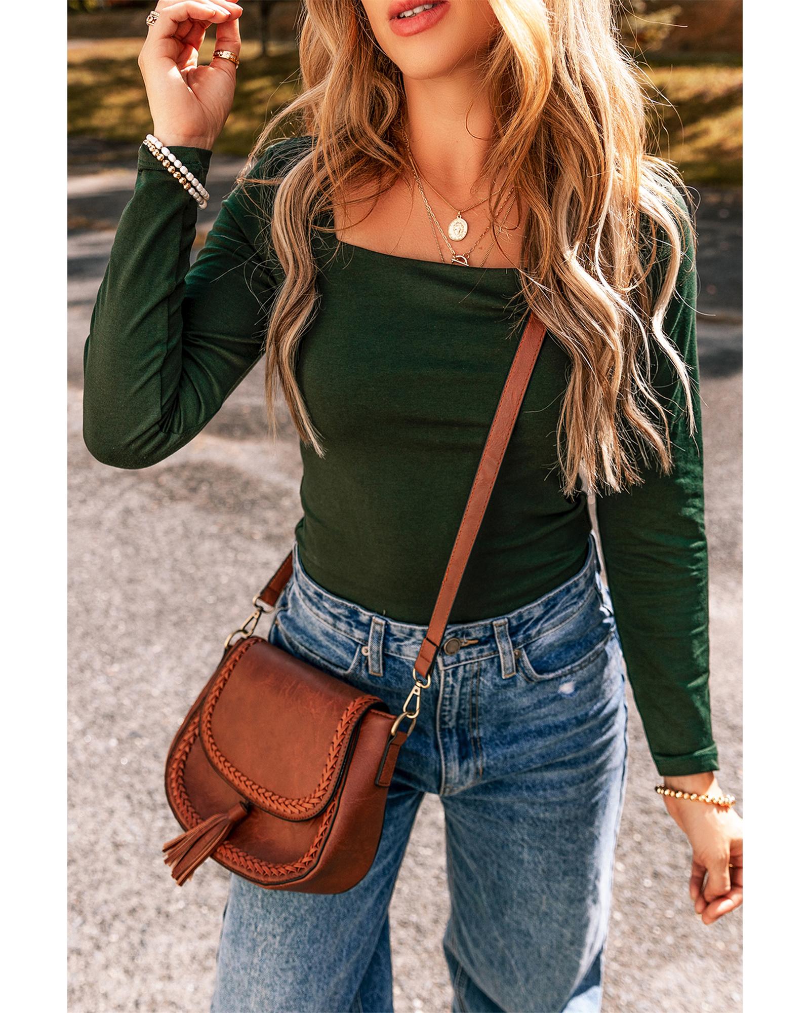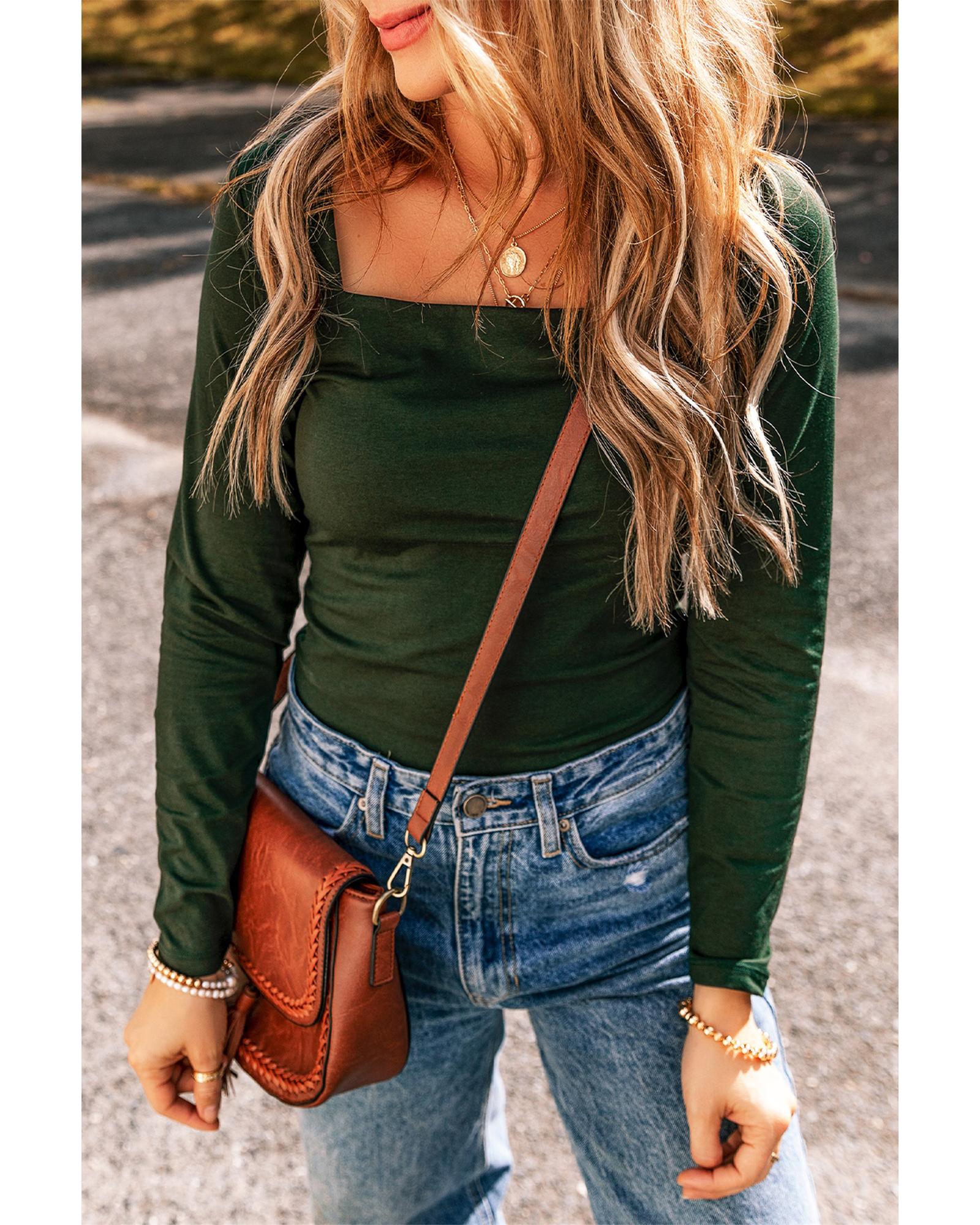 Blackish Green Solid Color Square Neck Long Sleeve Slim Fit Bodysuit – L