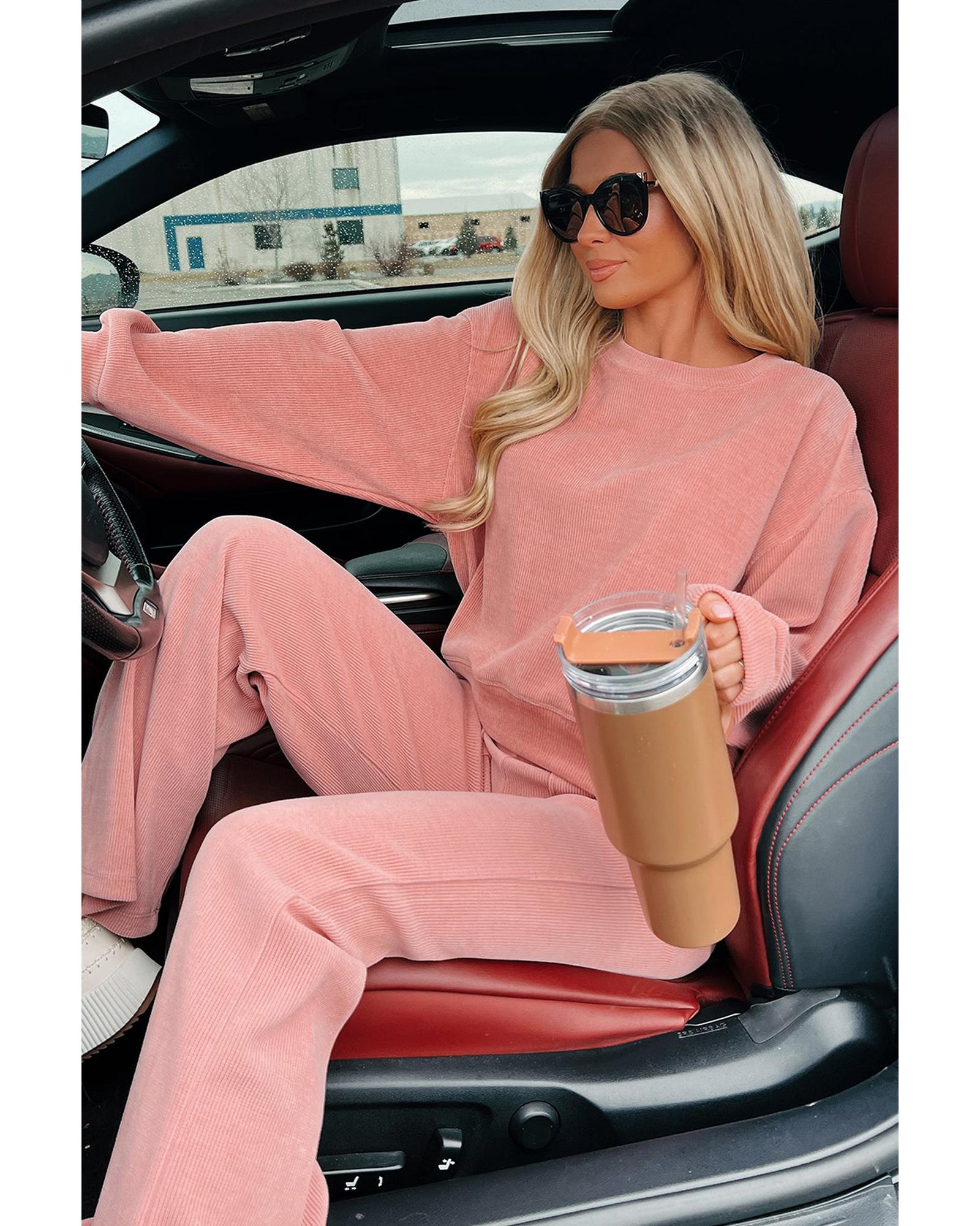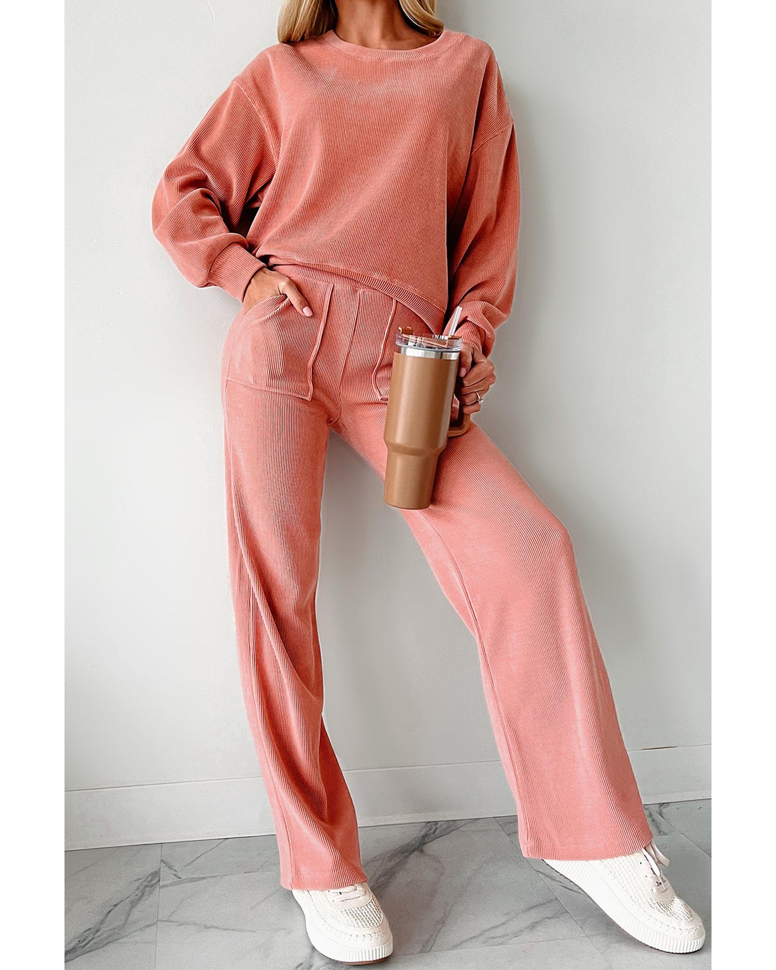 Blossom Ribbed Knit Drop Shoulder Pocketed Two Piece Lounge Set – L