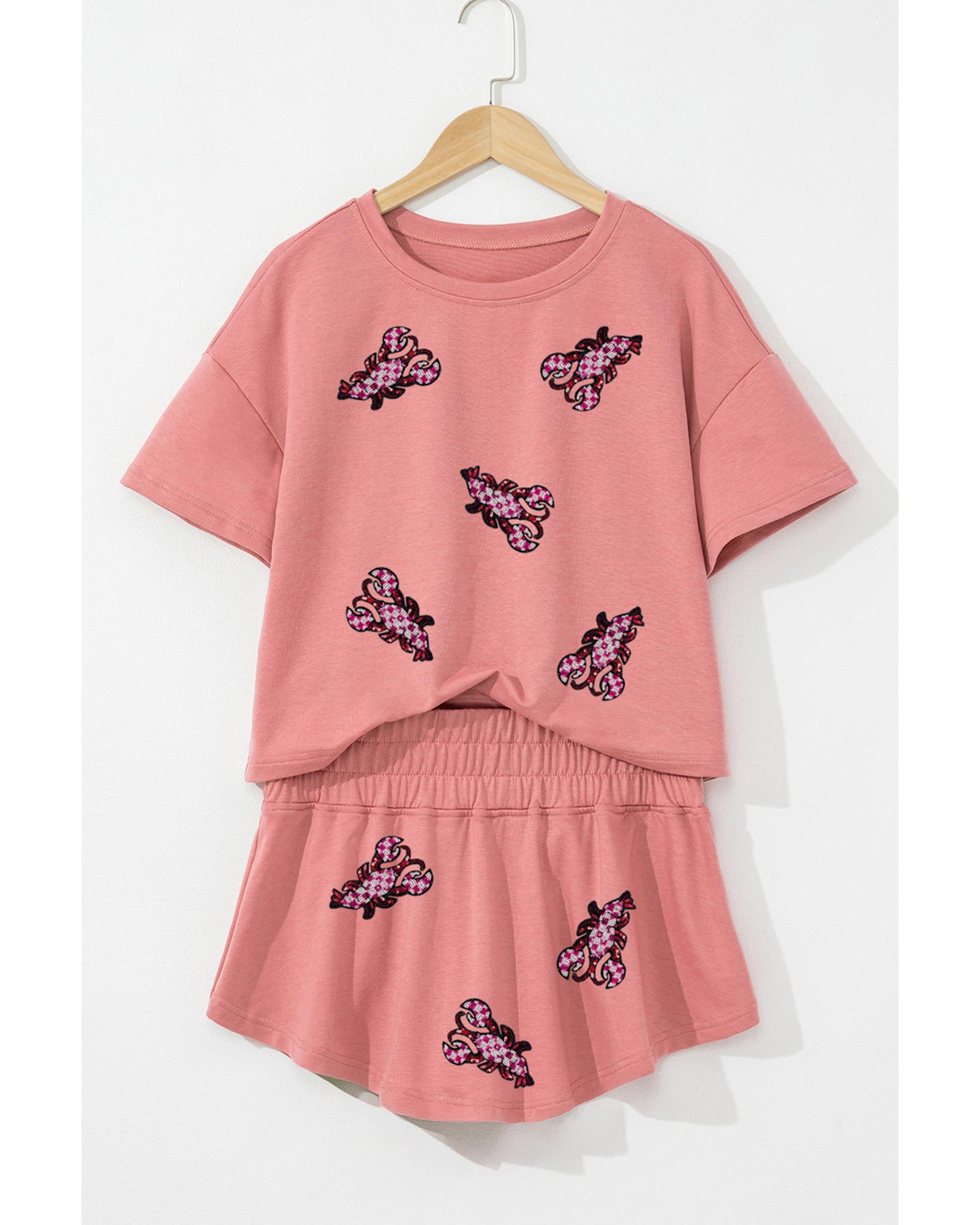 Blossom Sequined Lobster Patched Crop Tee and High Waist Short Set – S