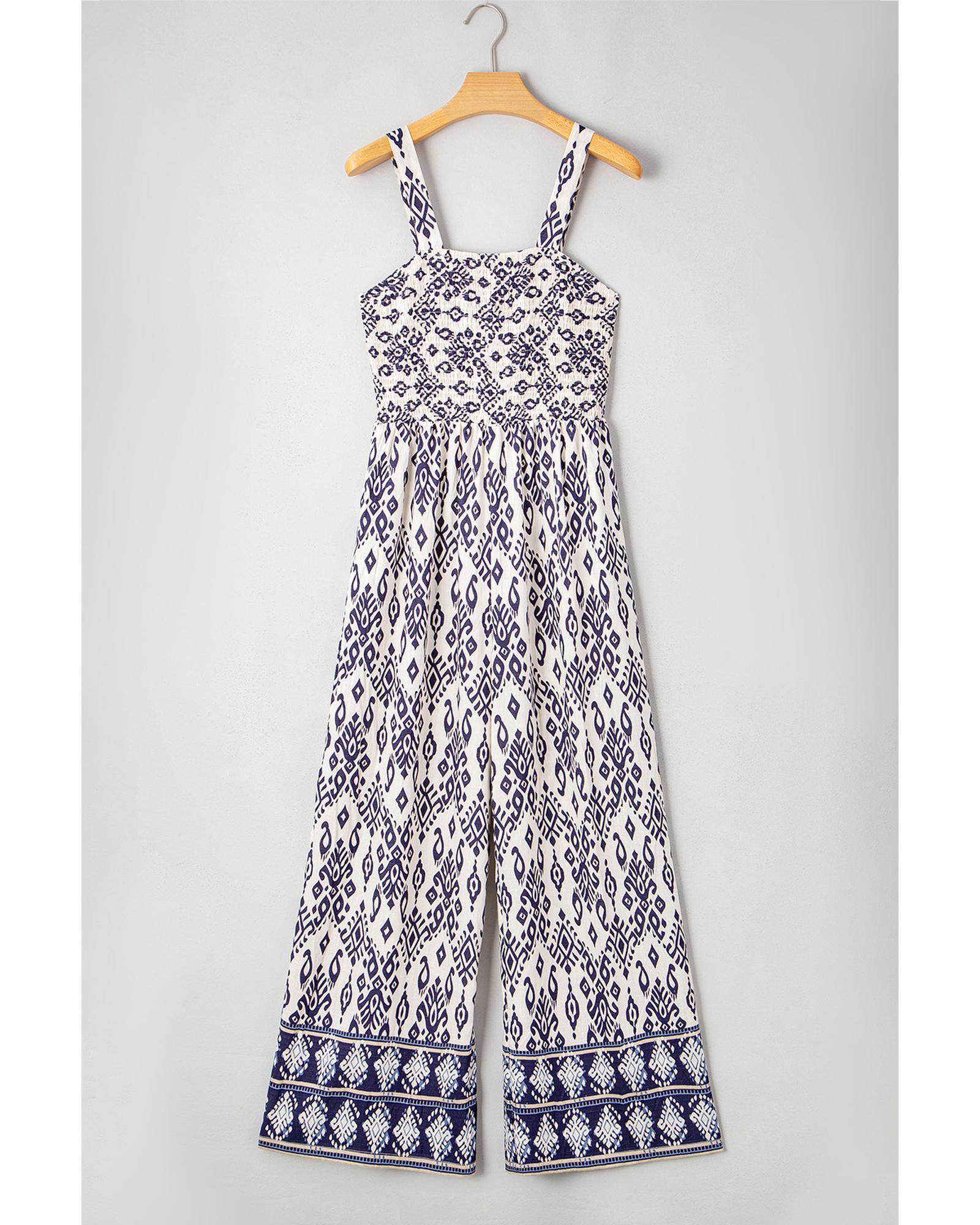 Blue Boho Geometric Print Shirred High Waist Wide Leg Jumpsuit - L