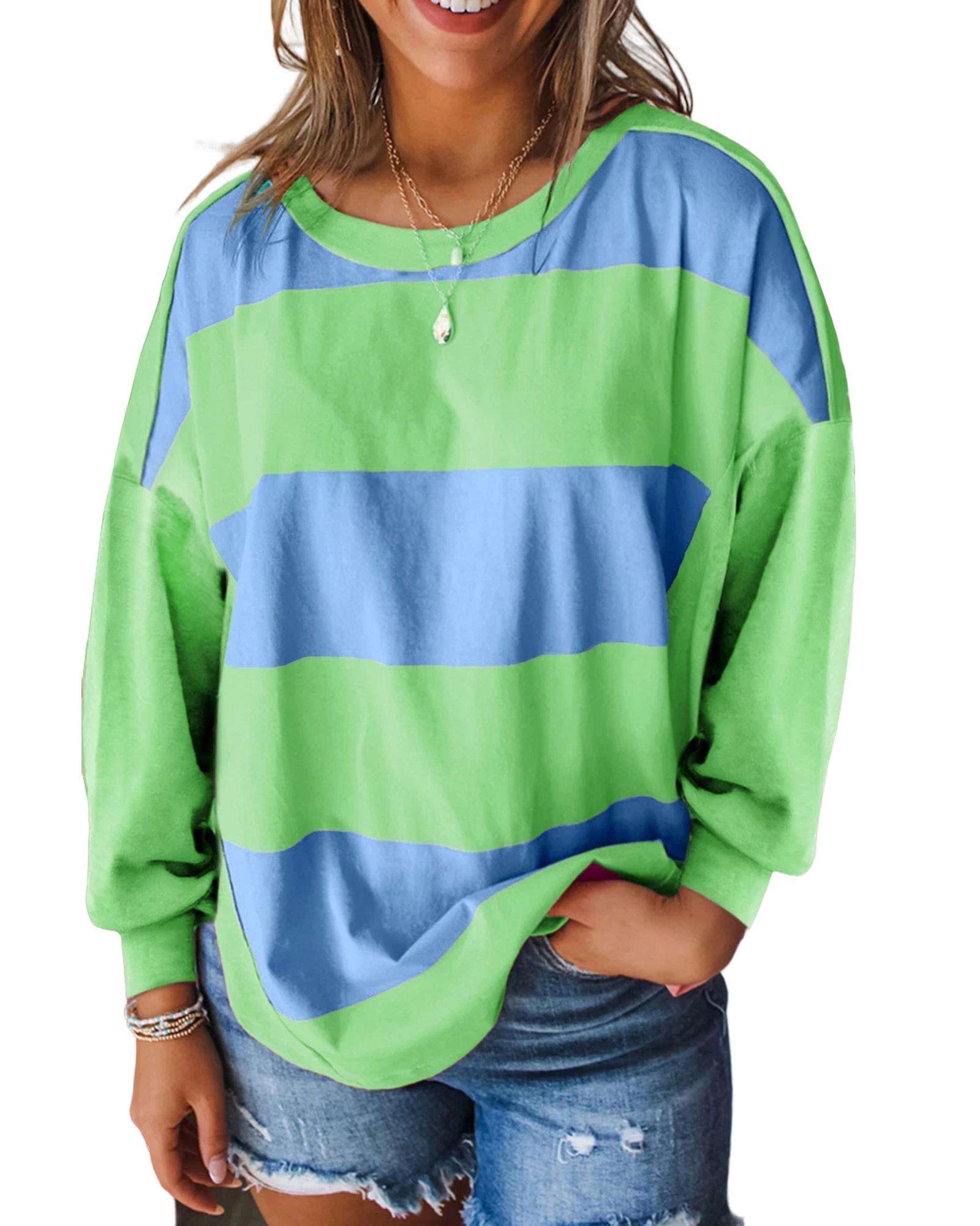 Blue Colorblock Striped Drop Shoulder Loose Top – S