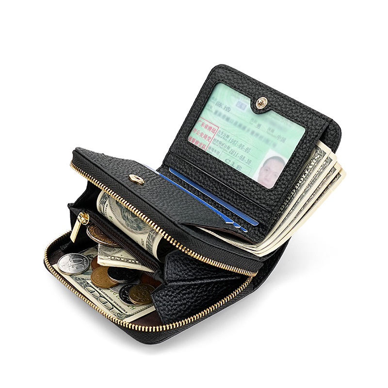 • Secure Zipper Closure: Features a smooth, reliable zipper closure for the main coin/change compartment, keeping your coins and valuables secure. A snap closure secures the card section.