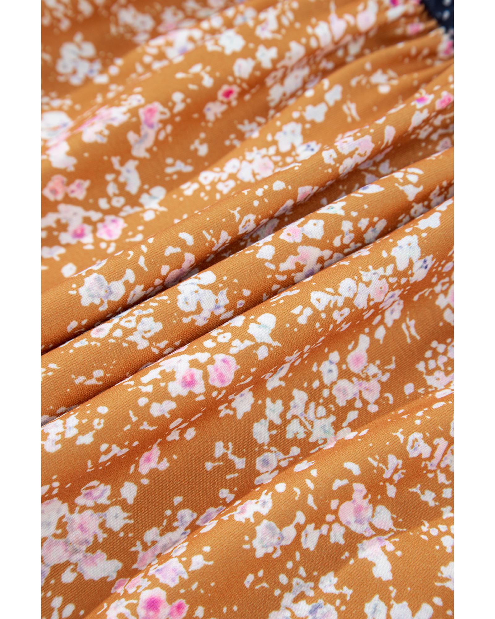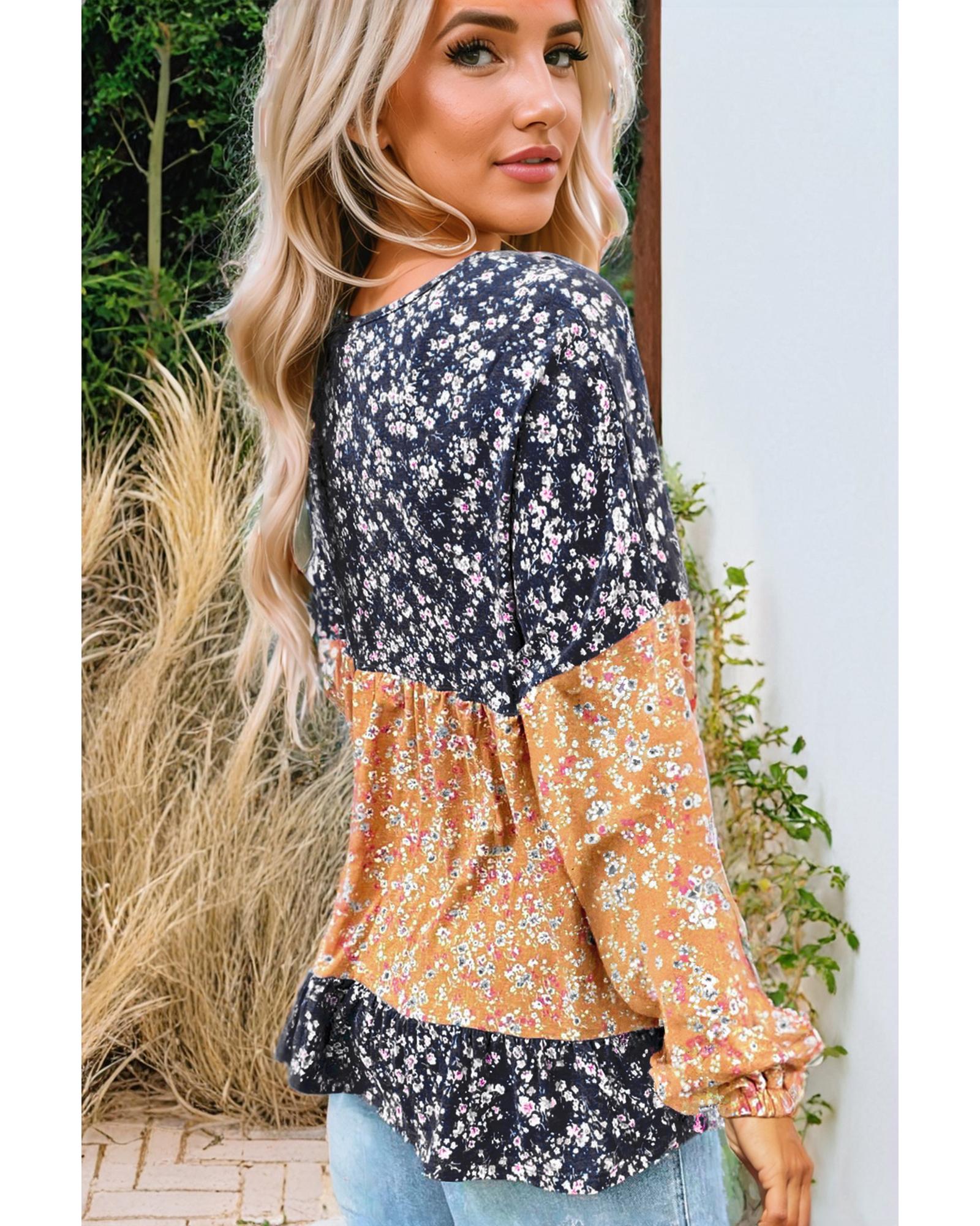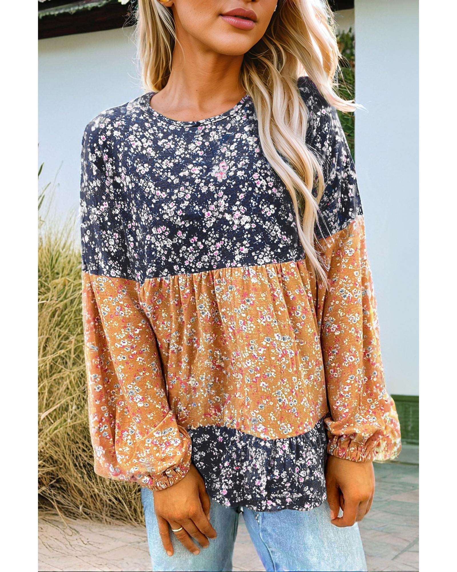 Blue Floral Color Block Patchwork Ruffled Hem Round Neck Blouse – L