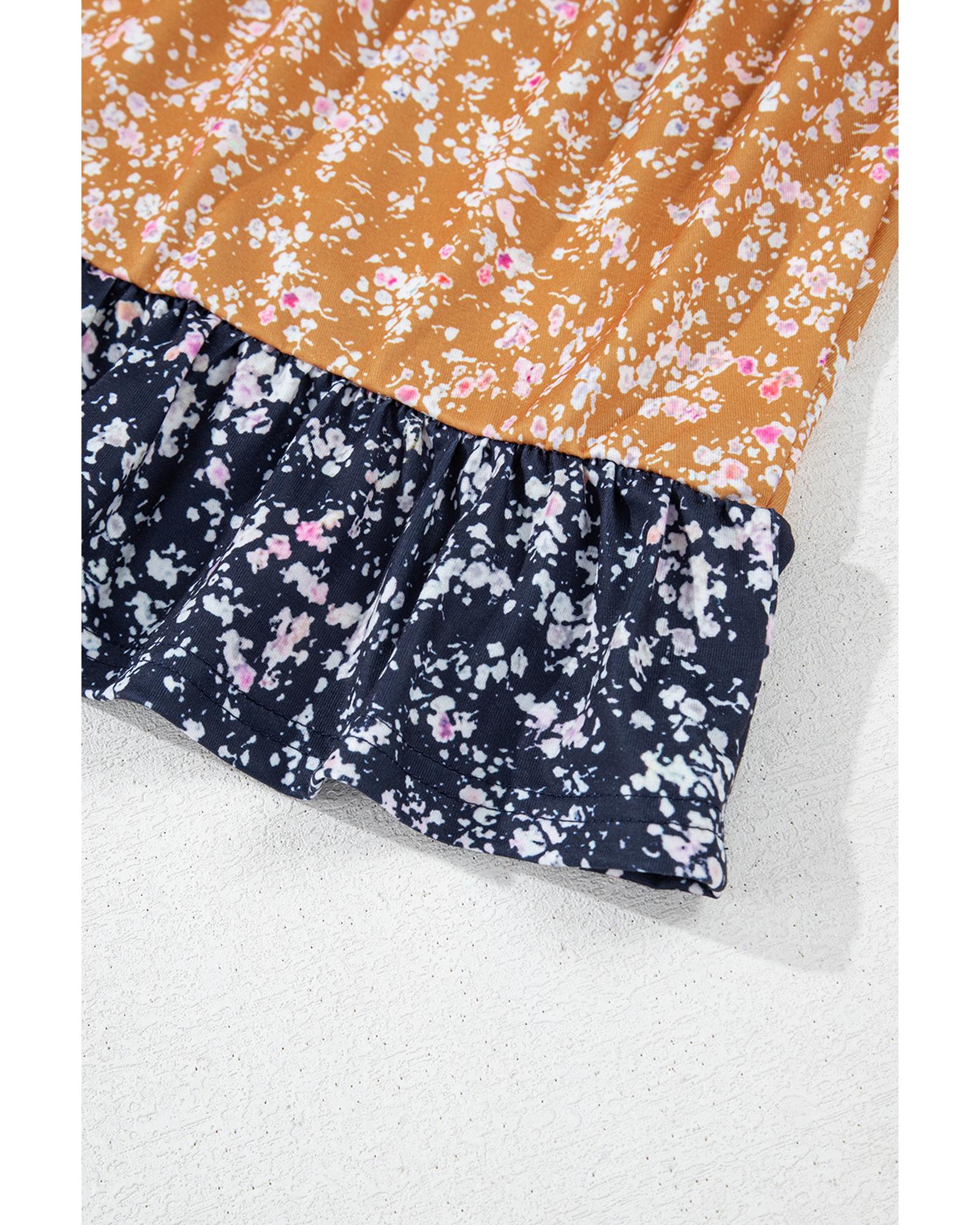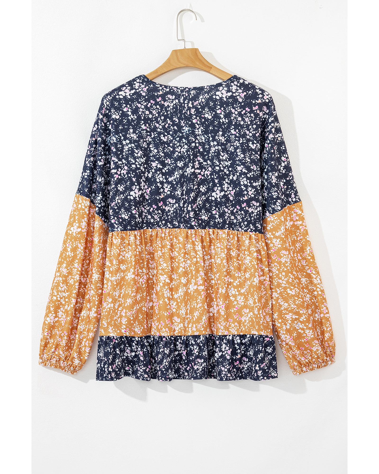 Blue Floral Color Block Patchwork Ruffled Hem Round Neck Blouse – M
