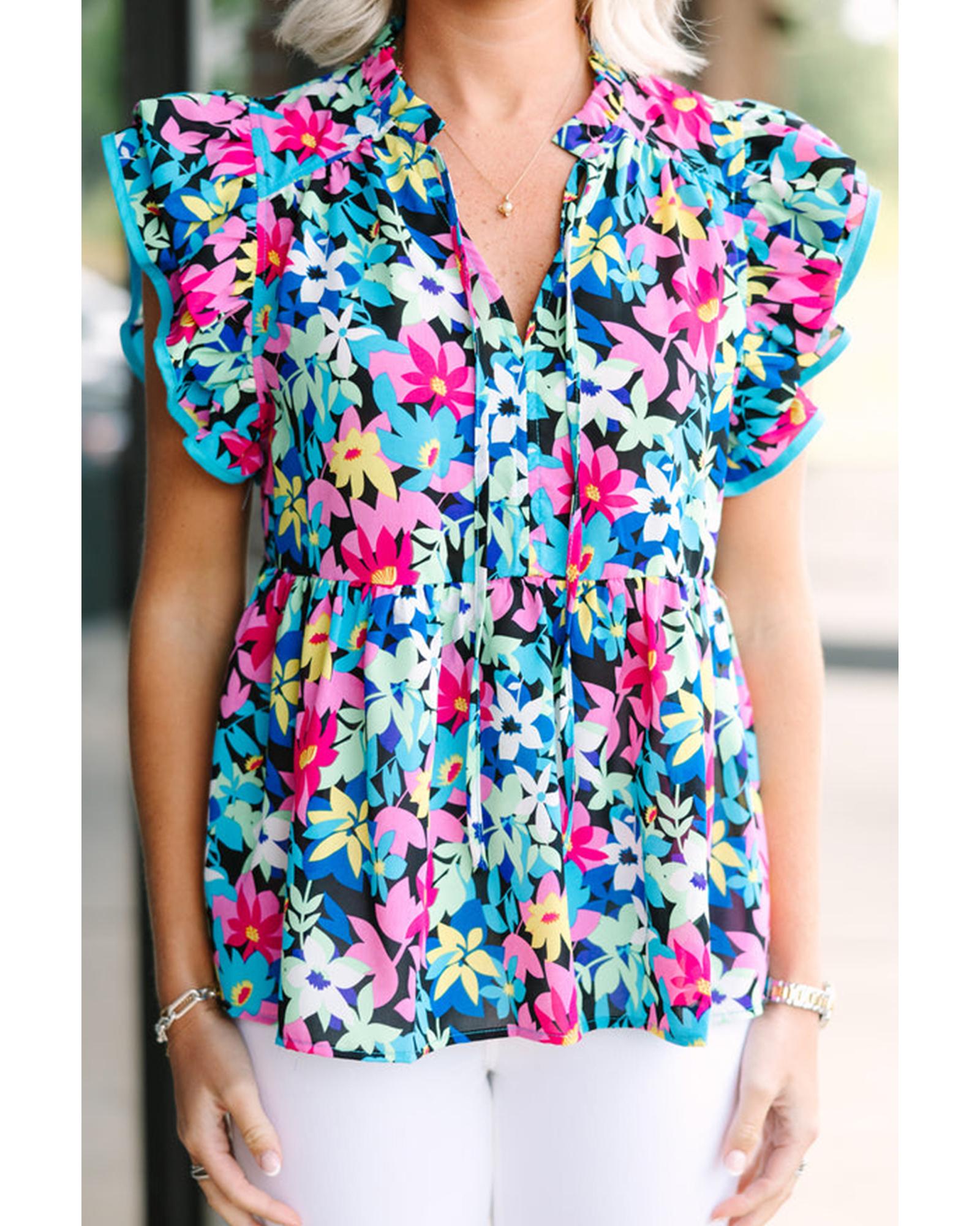 Blue Floral Flutter Sleeve Tied Notched Neck Plus Size Blouse – 1X