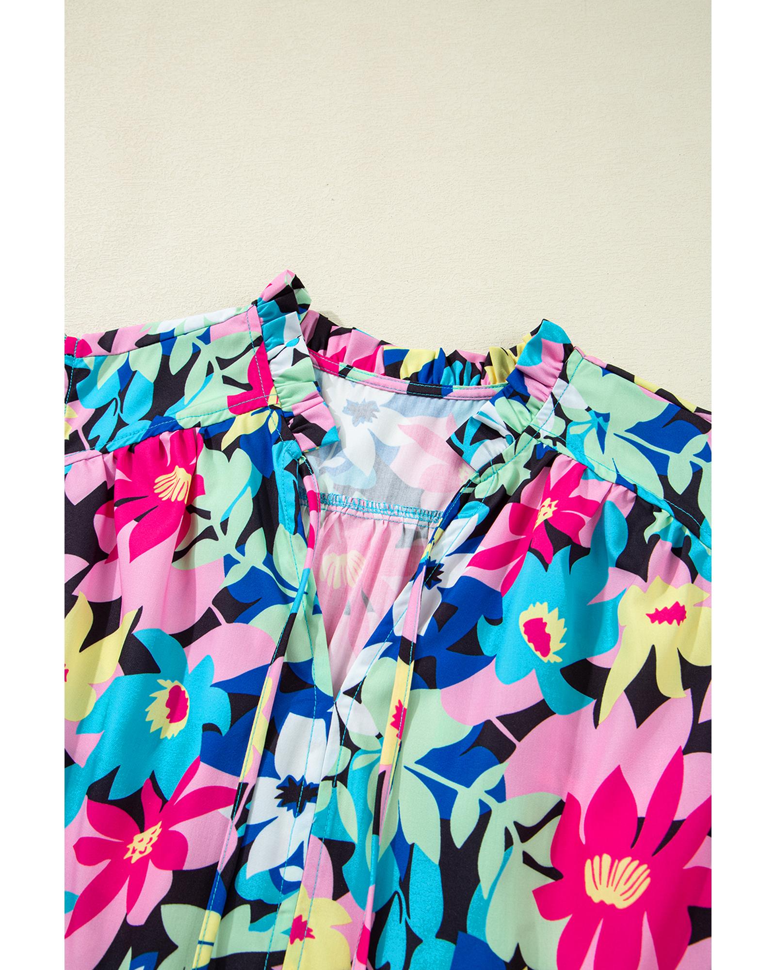 Blue Floral Flutter Sleeve Tied Notched Neck Plus Size Blouse - 1X