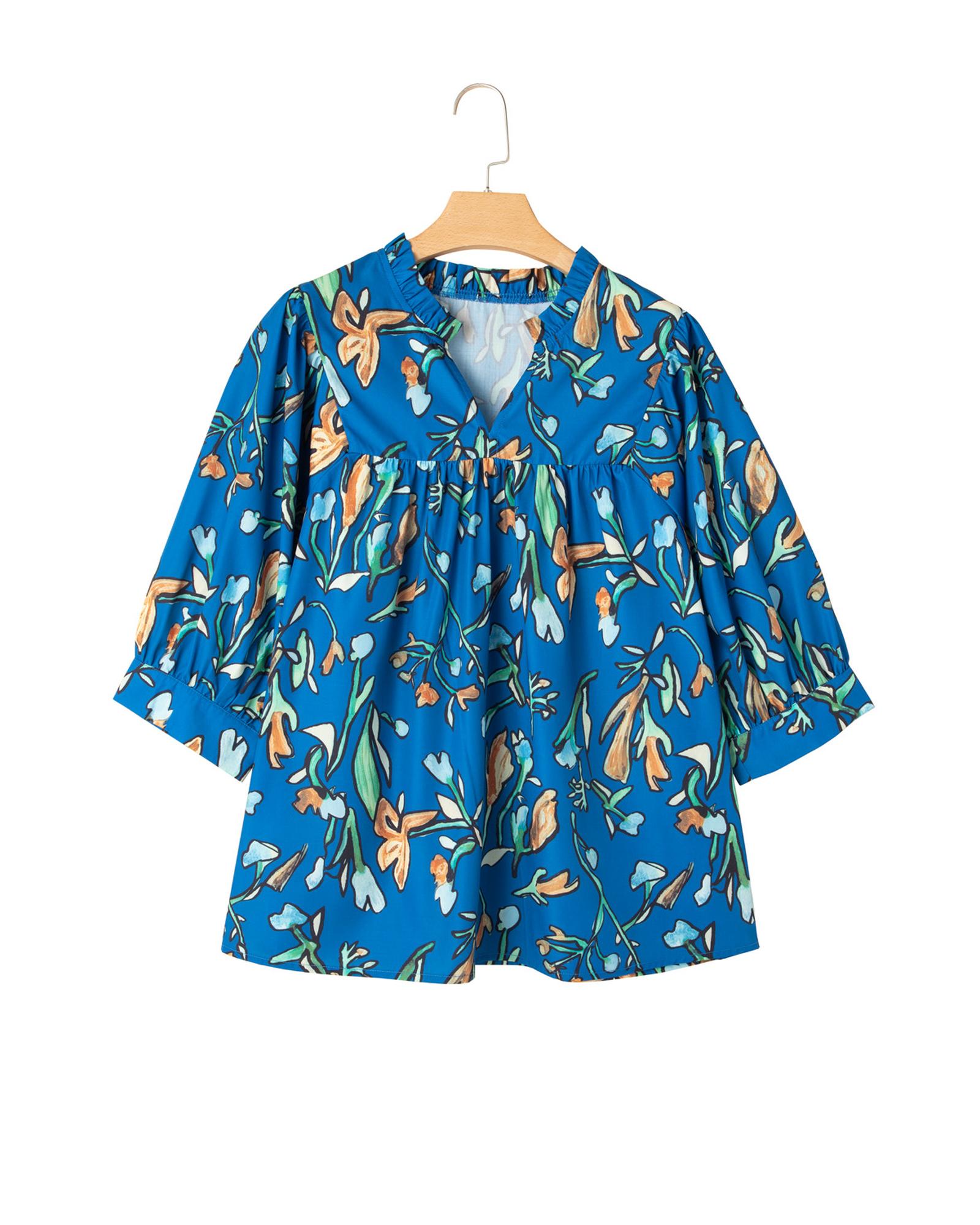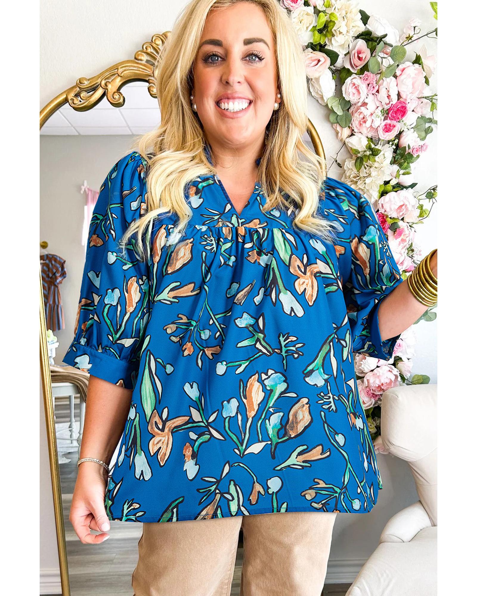 Blue Floral Notched V Neck Half Sleeve Plus Size Blouse – 3X