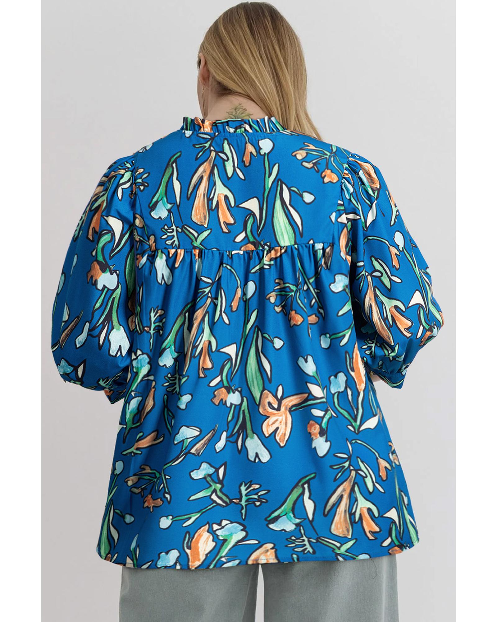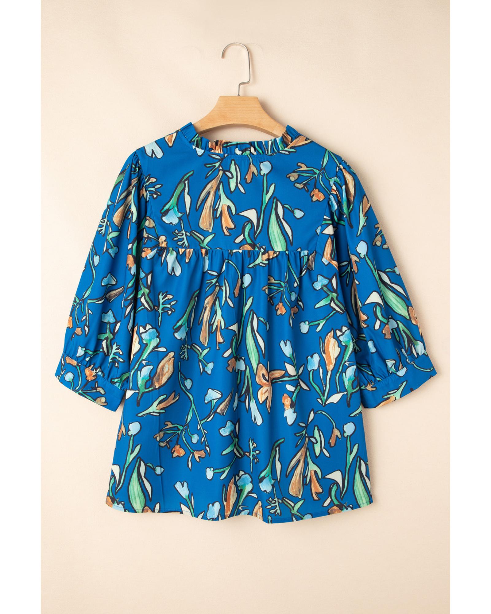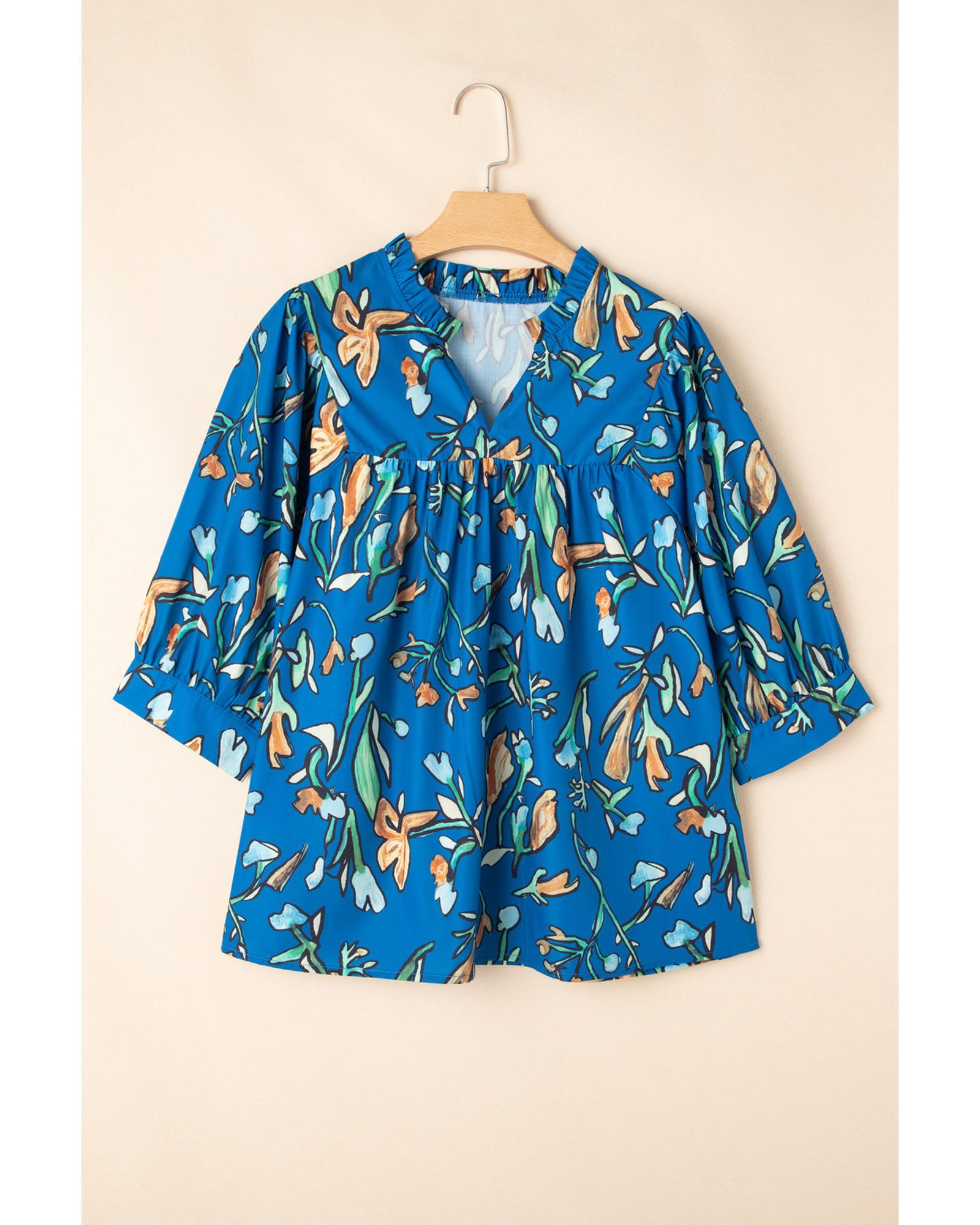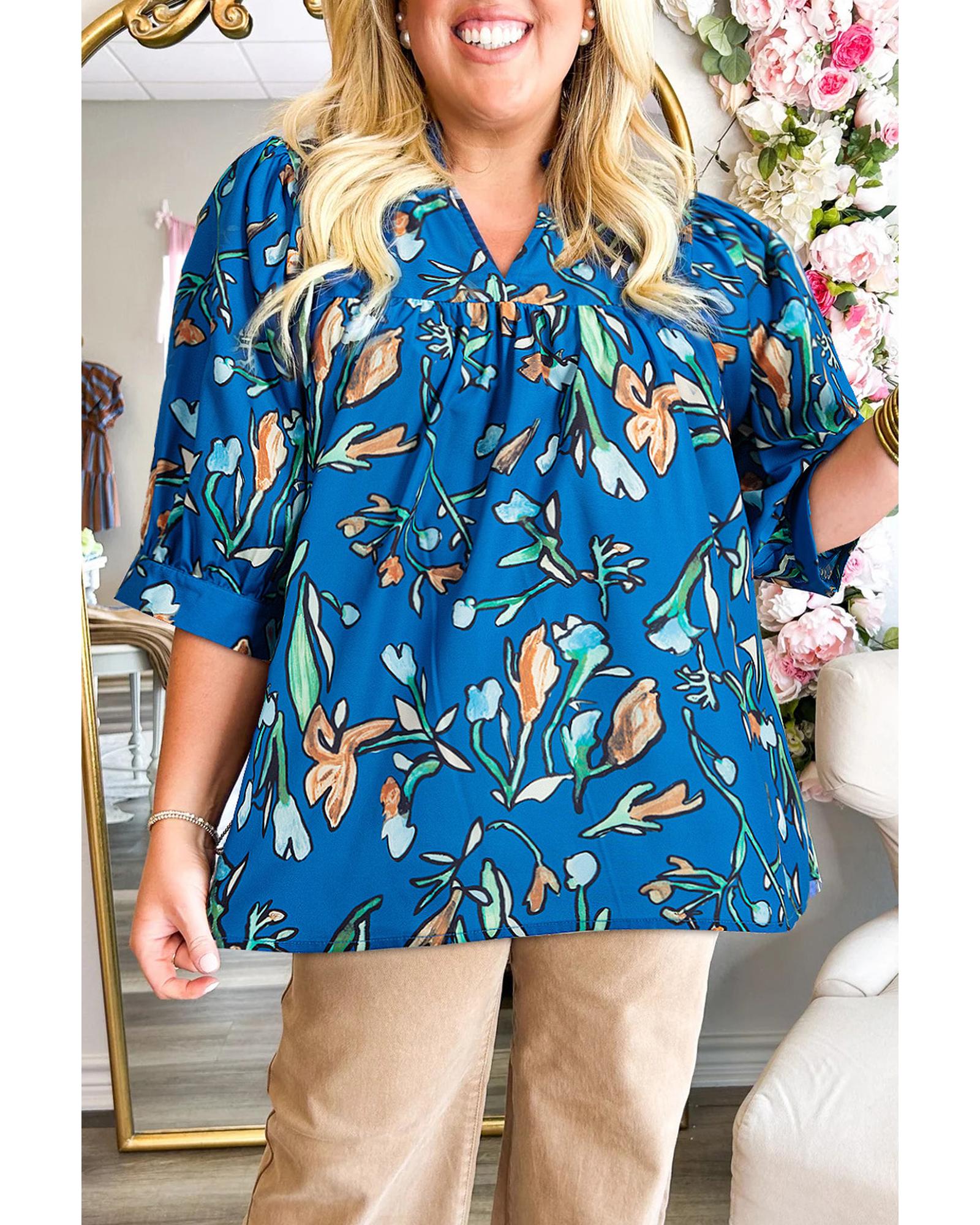 Blue Floral Notched V Neck Half Sleeve Plus Size Blouse – 4X