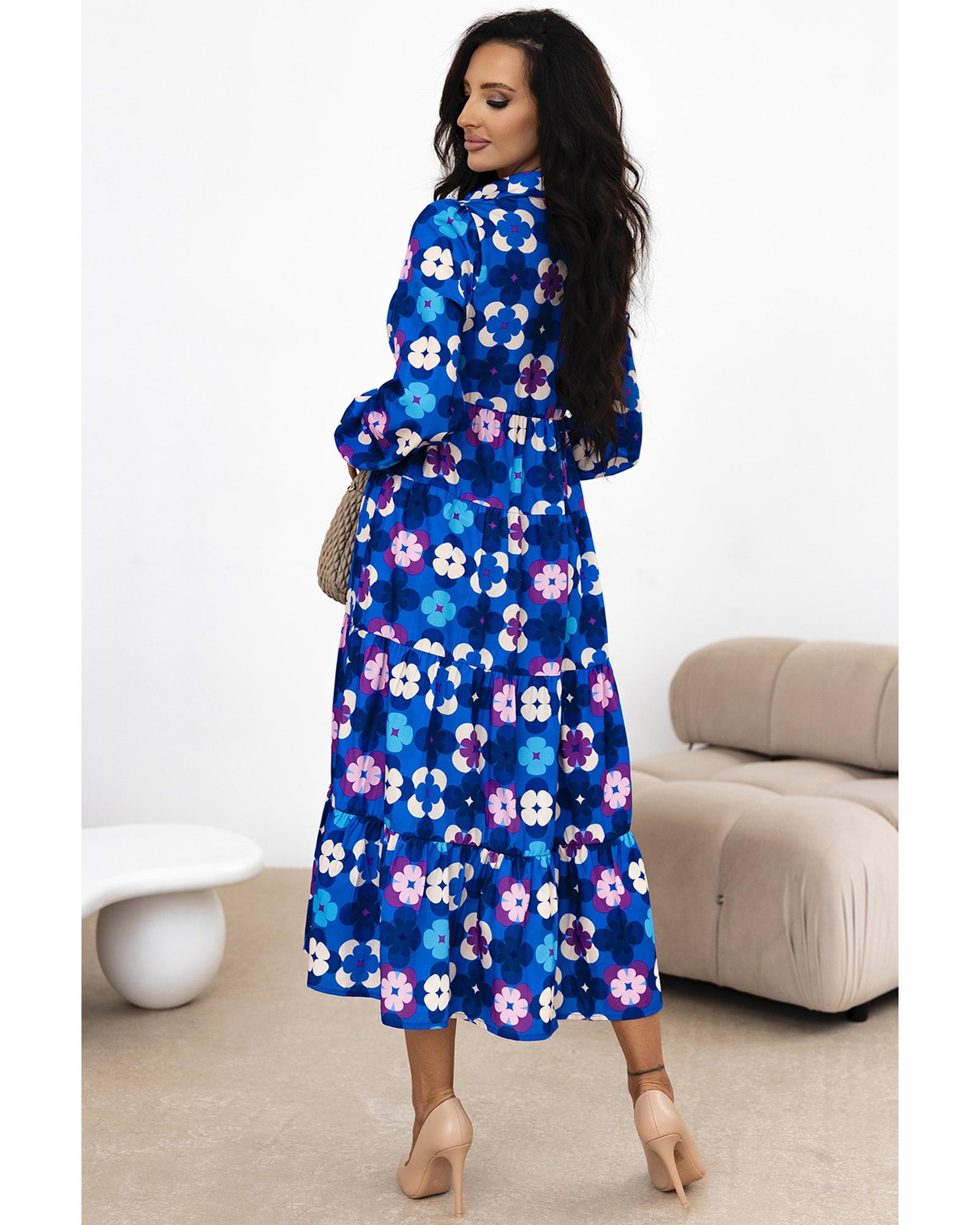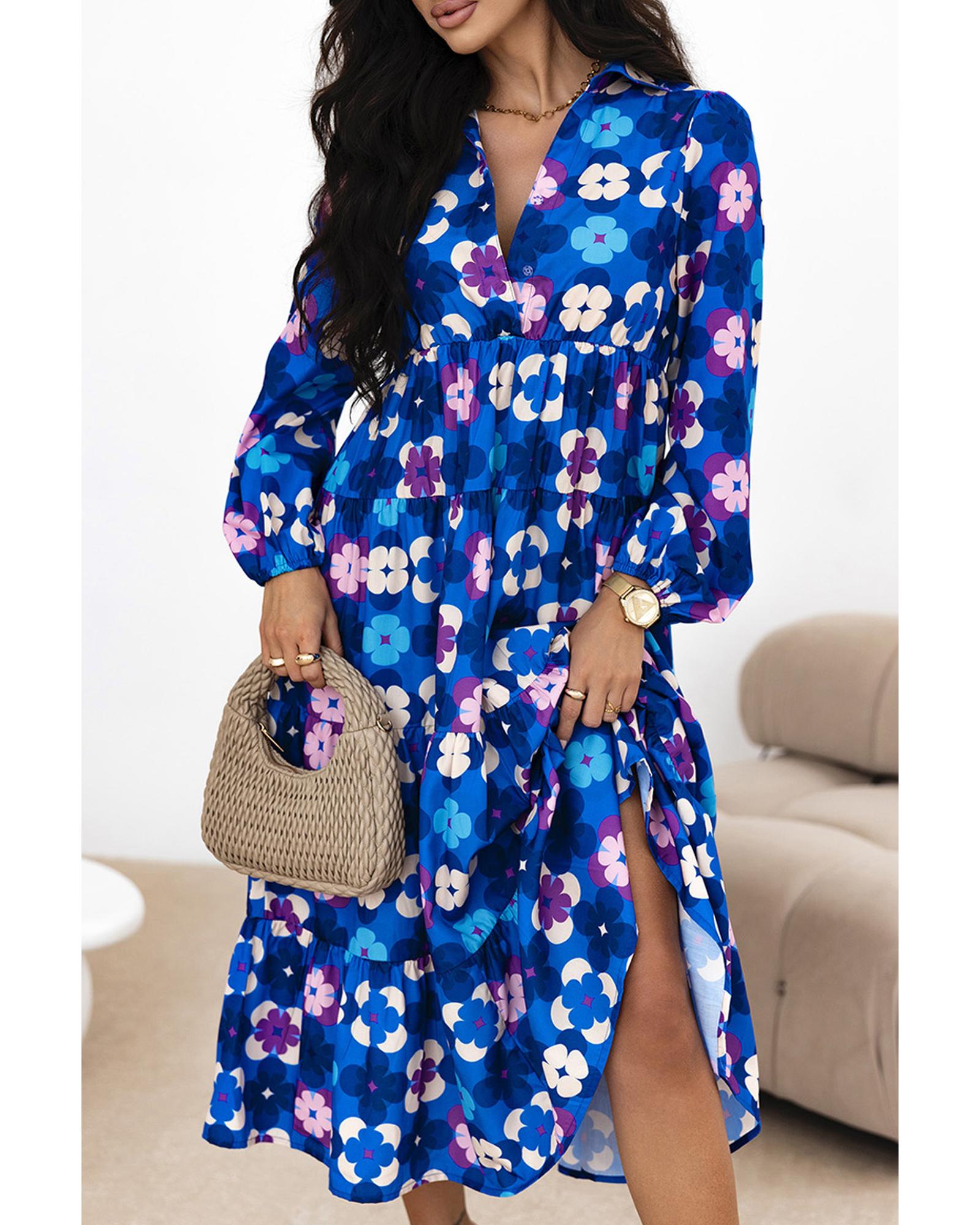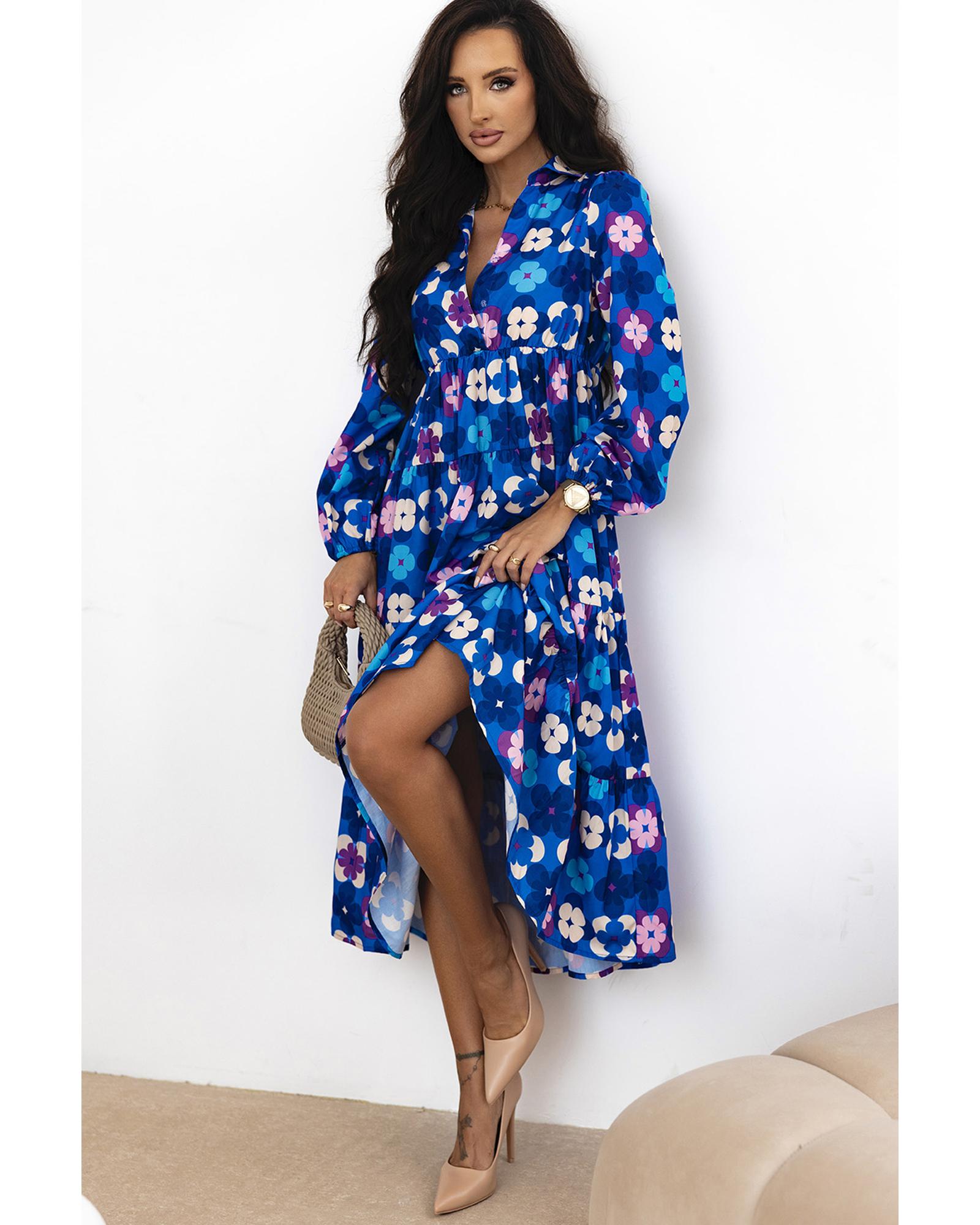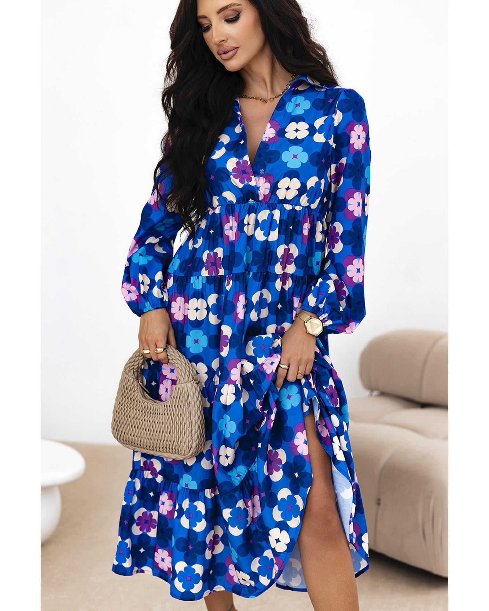Blue Floral Peasant Sleeve Tiered Ruffle Midi Dress – M