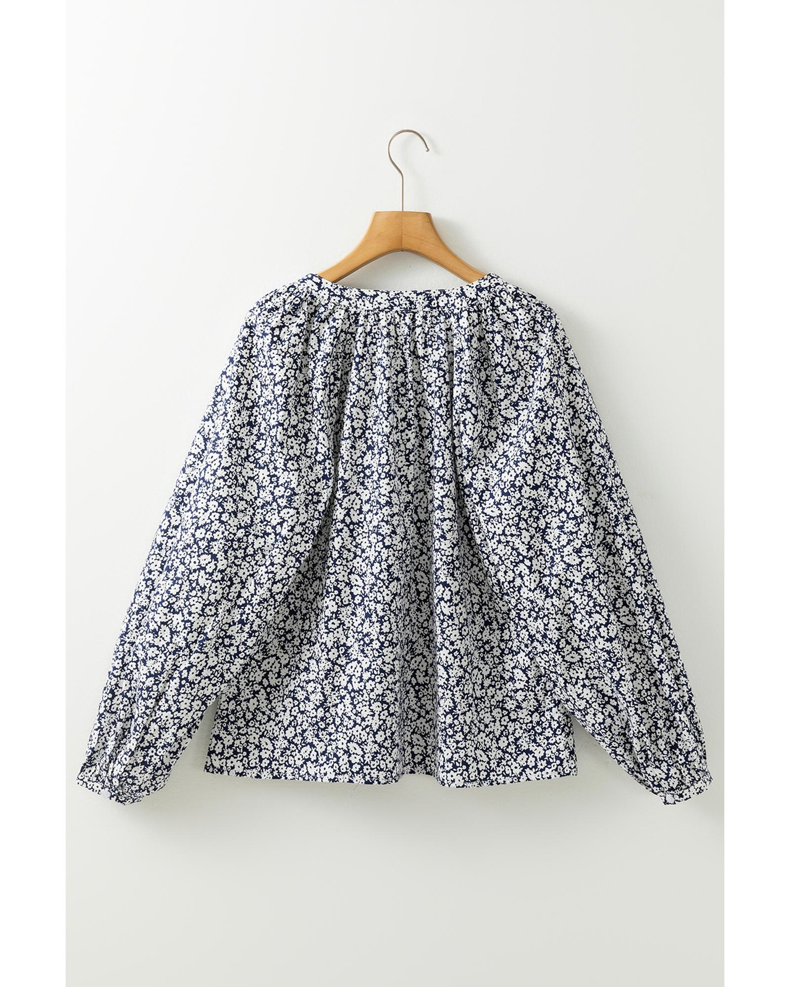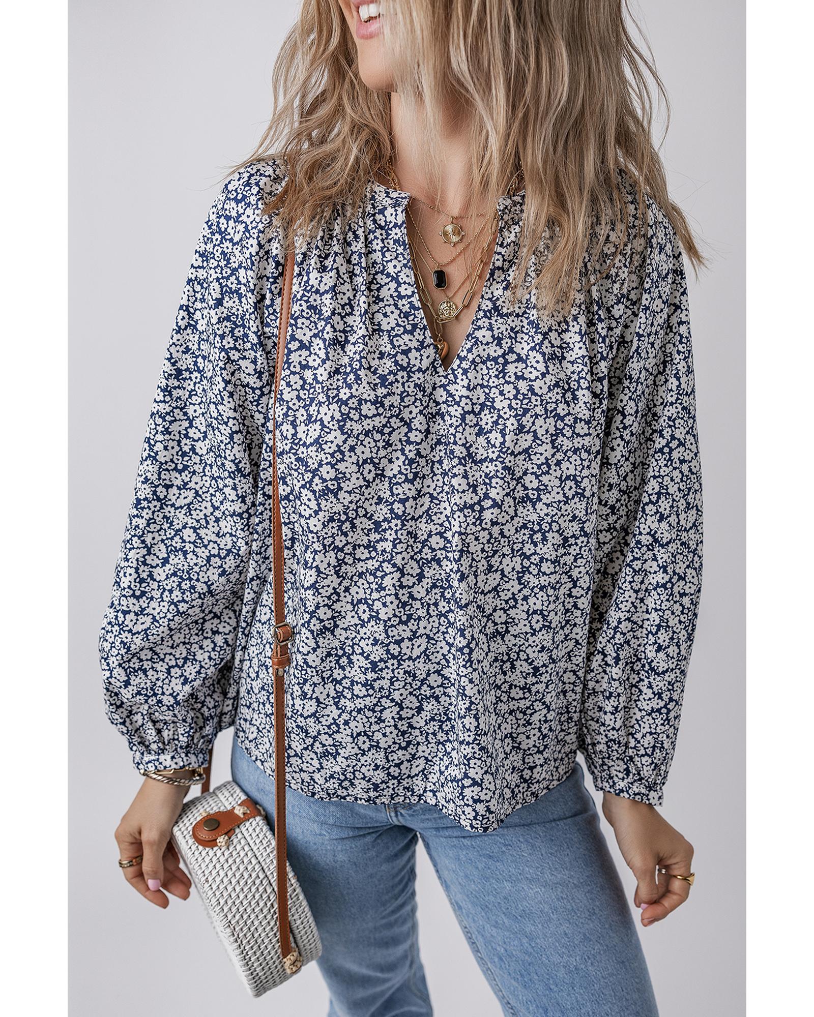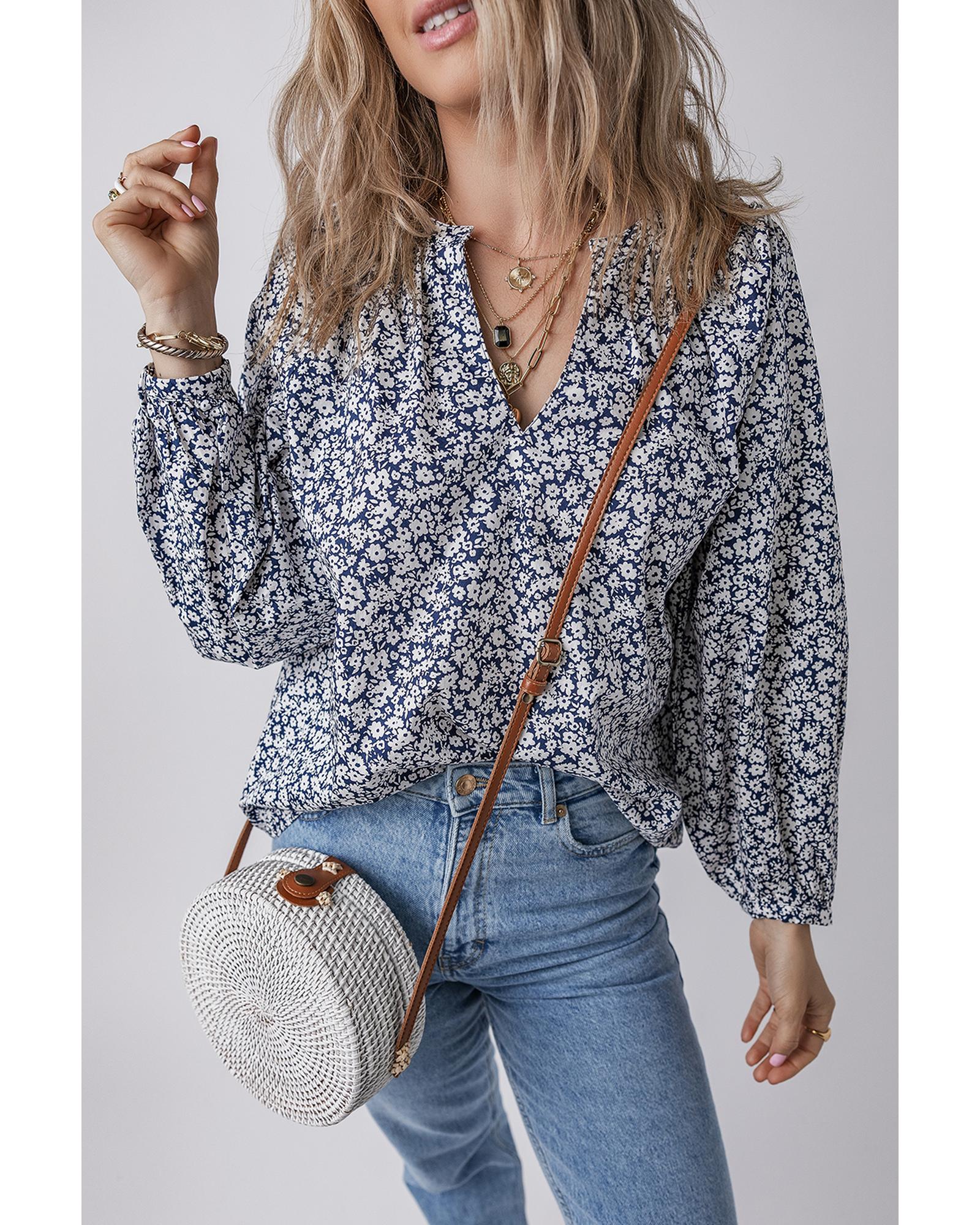 Blue Floral Print Notched V Neck Puff Sleeve Blouse – L