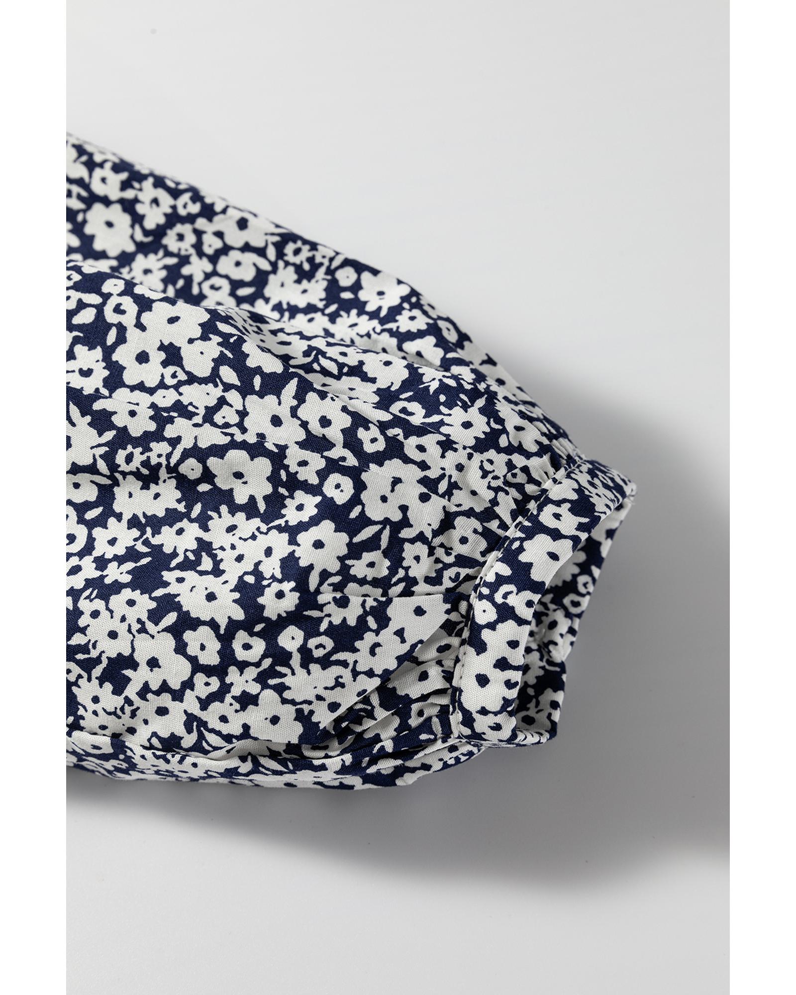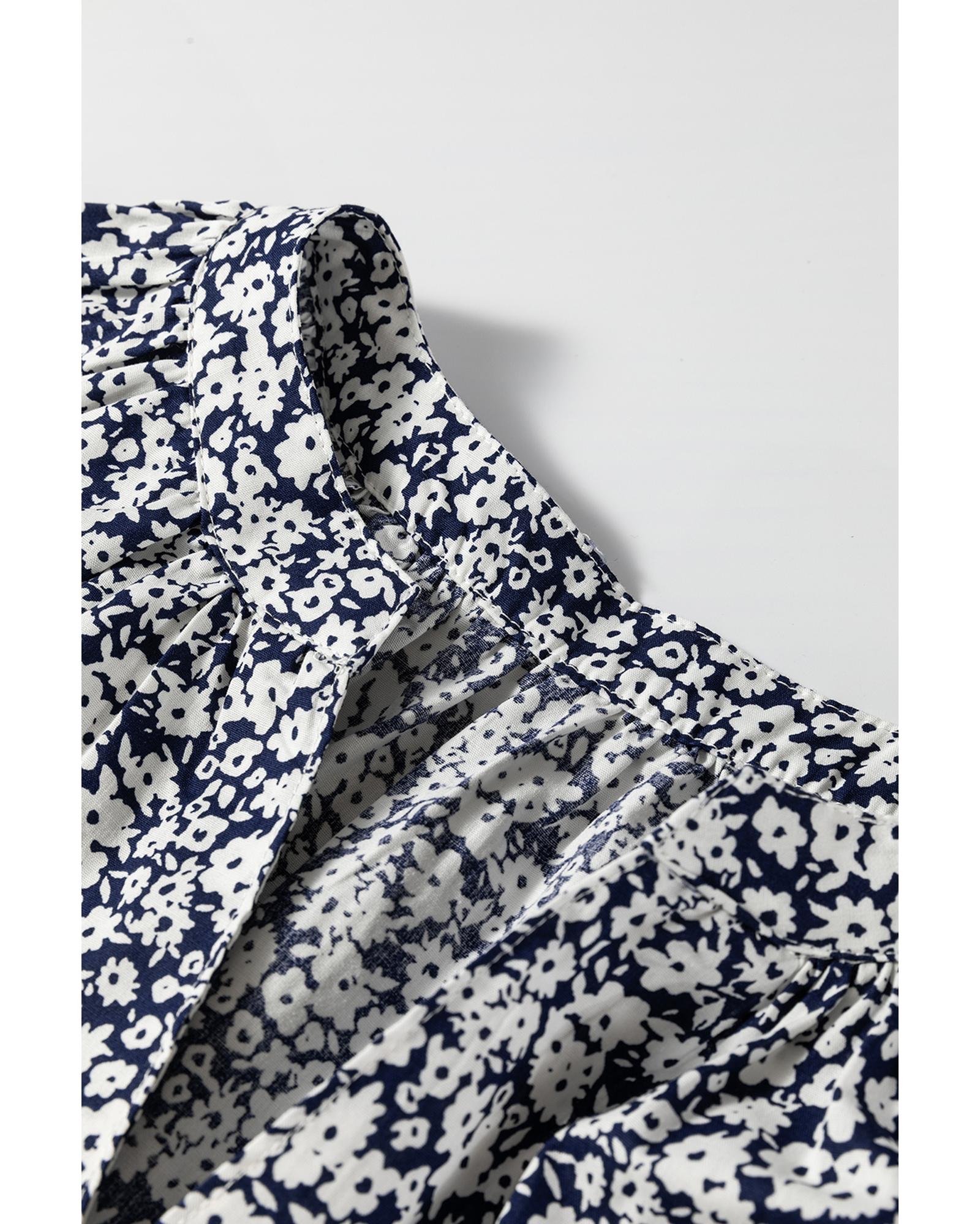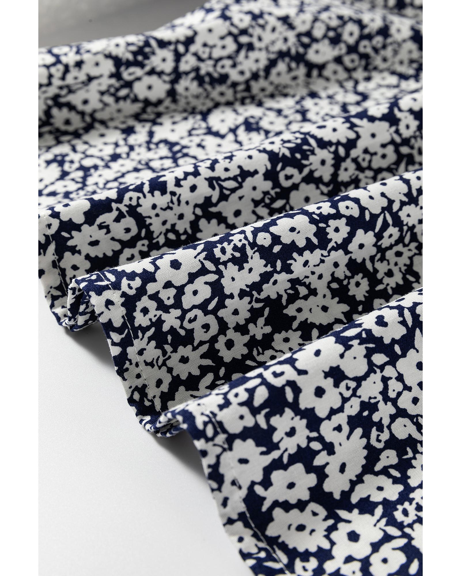 Blue Floral Print Notched V Neck Puff Sleeve Blouse – L