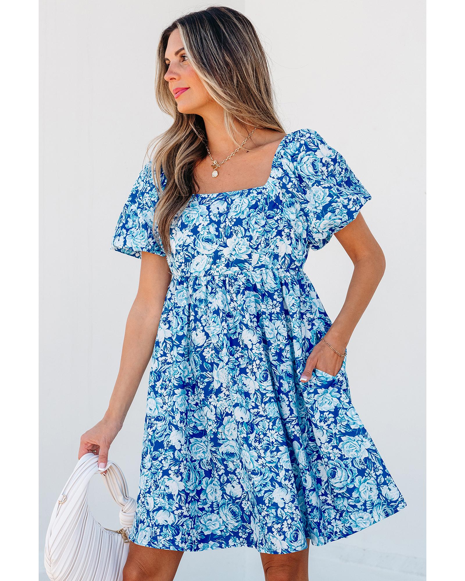 Blue Floral Puff Sleeve Babydoll Mini Dress – L