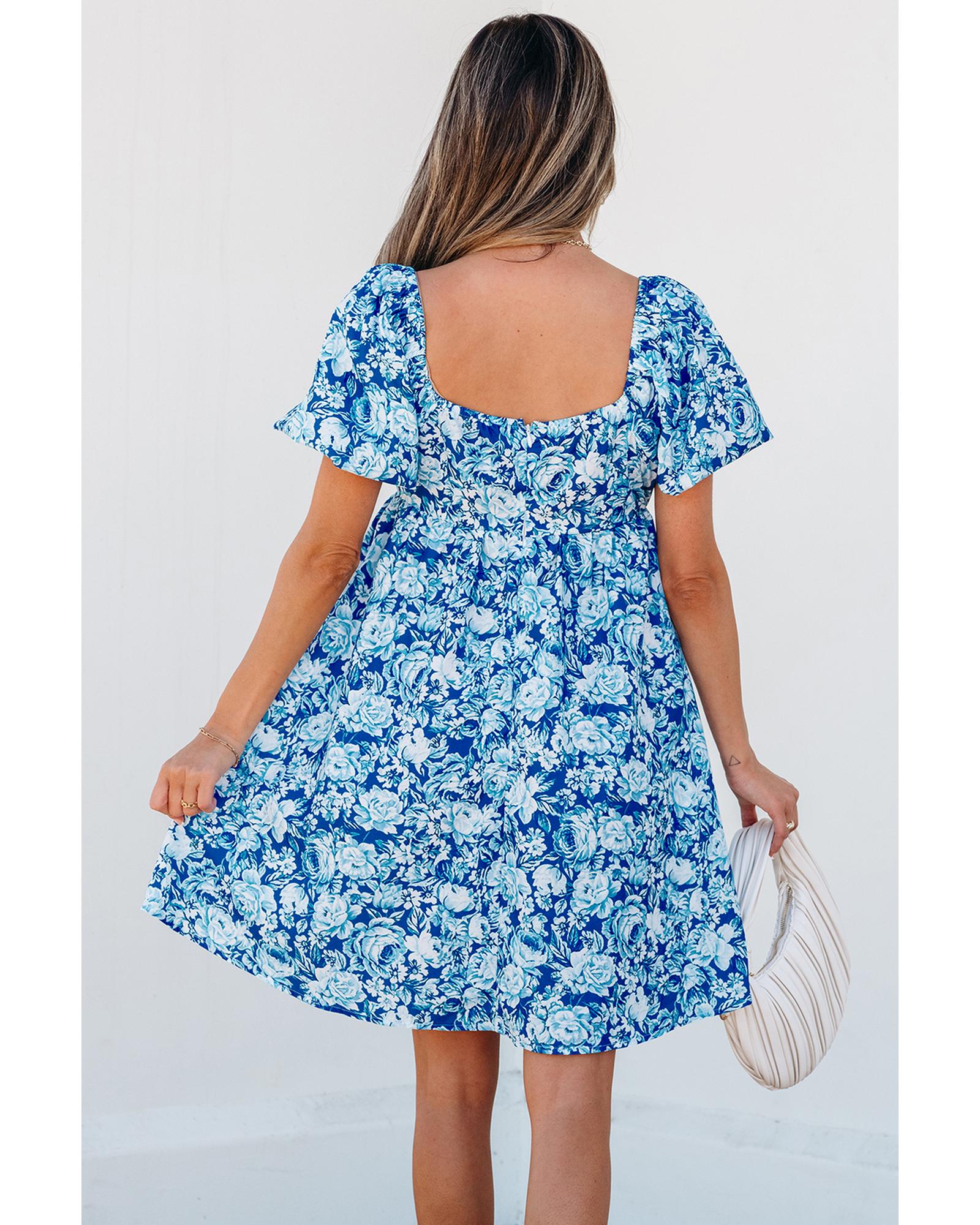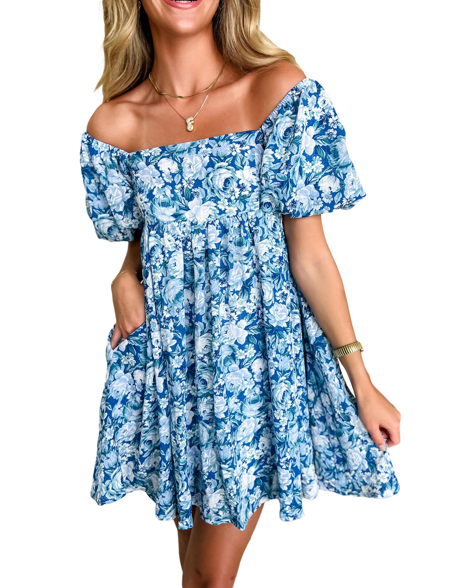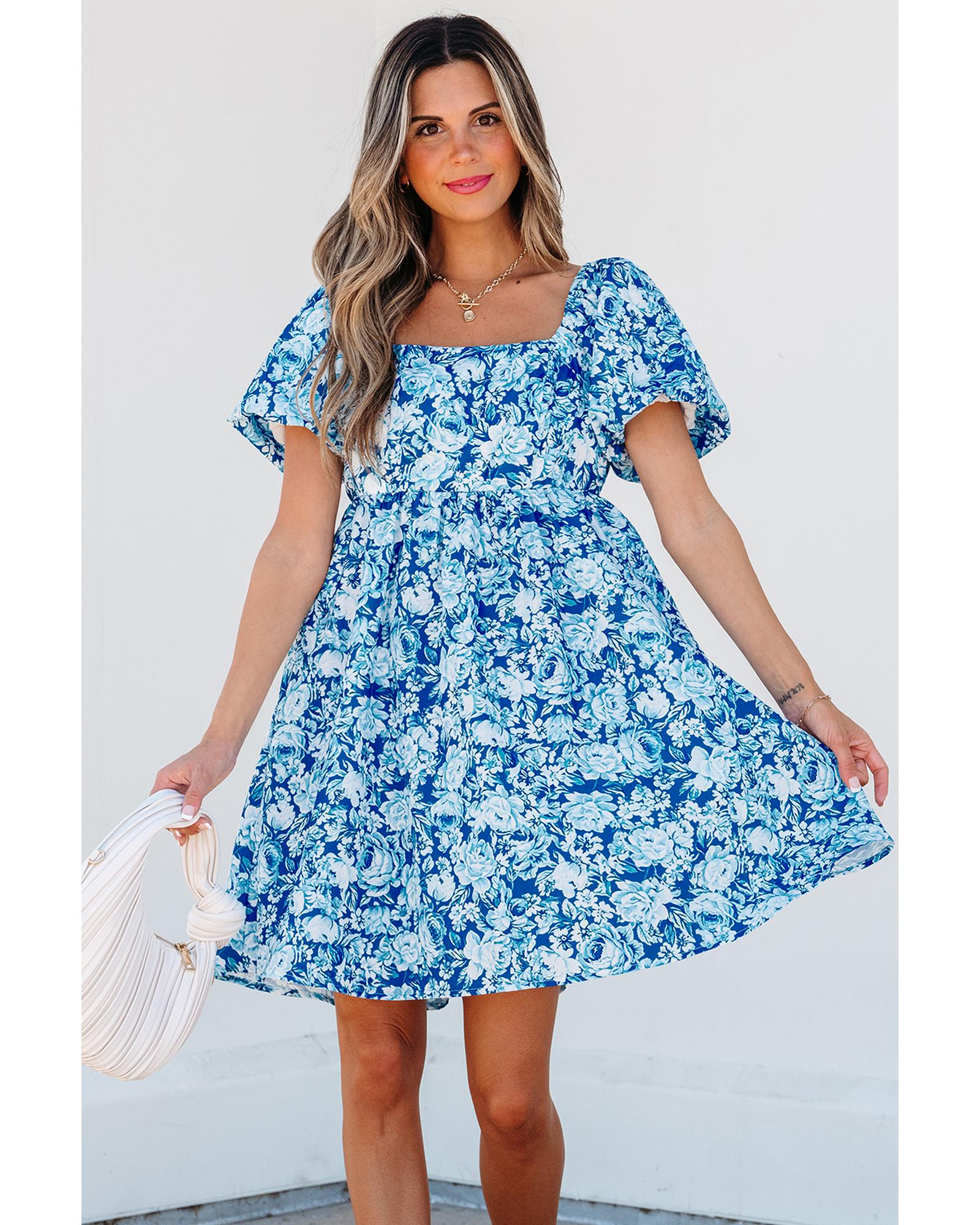 Blue Floral Puff Sleeve Babydoll Mini Dress – XL