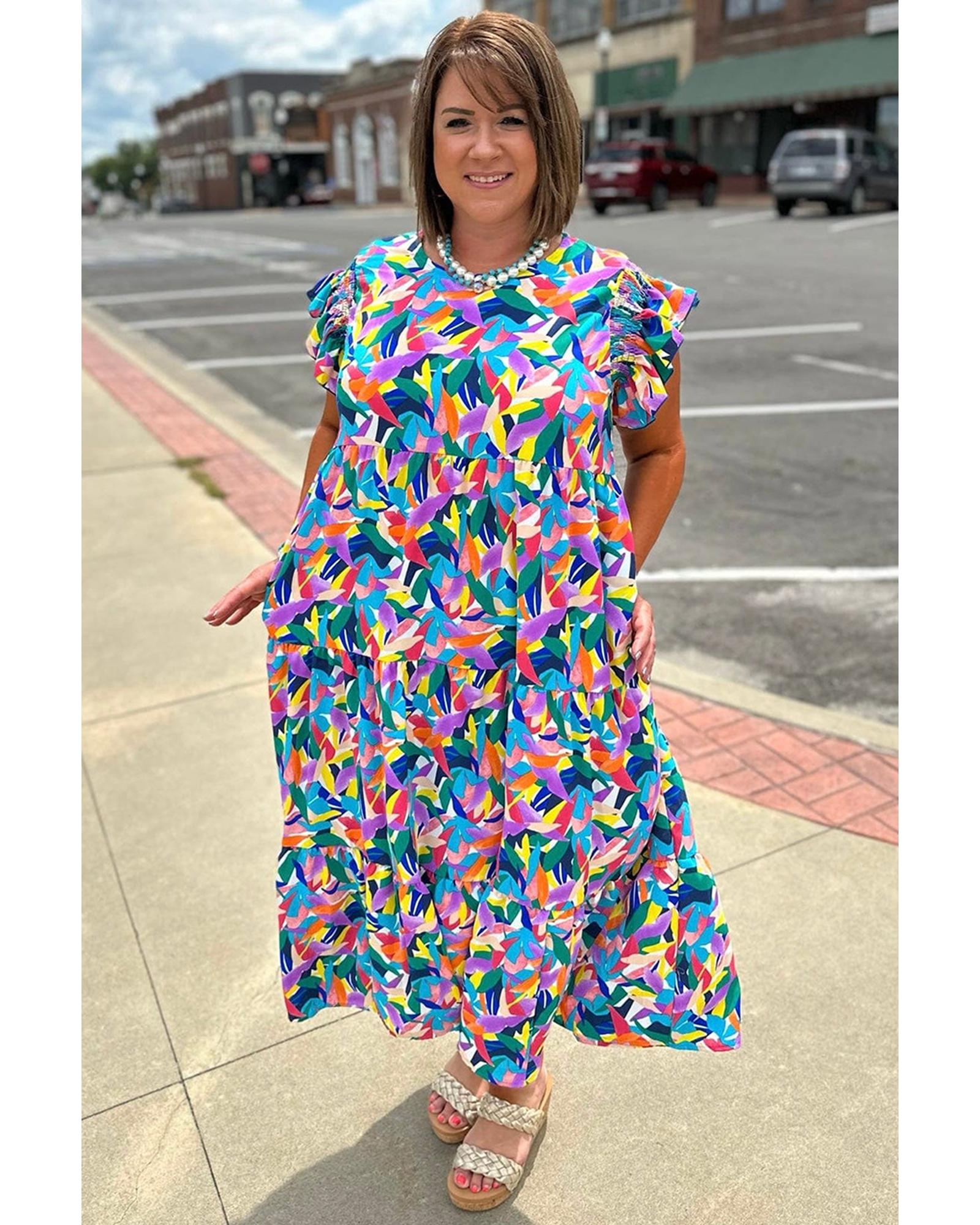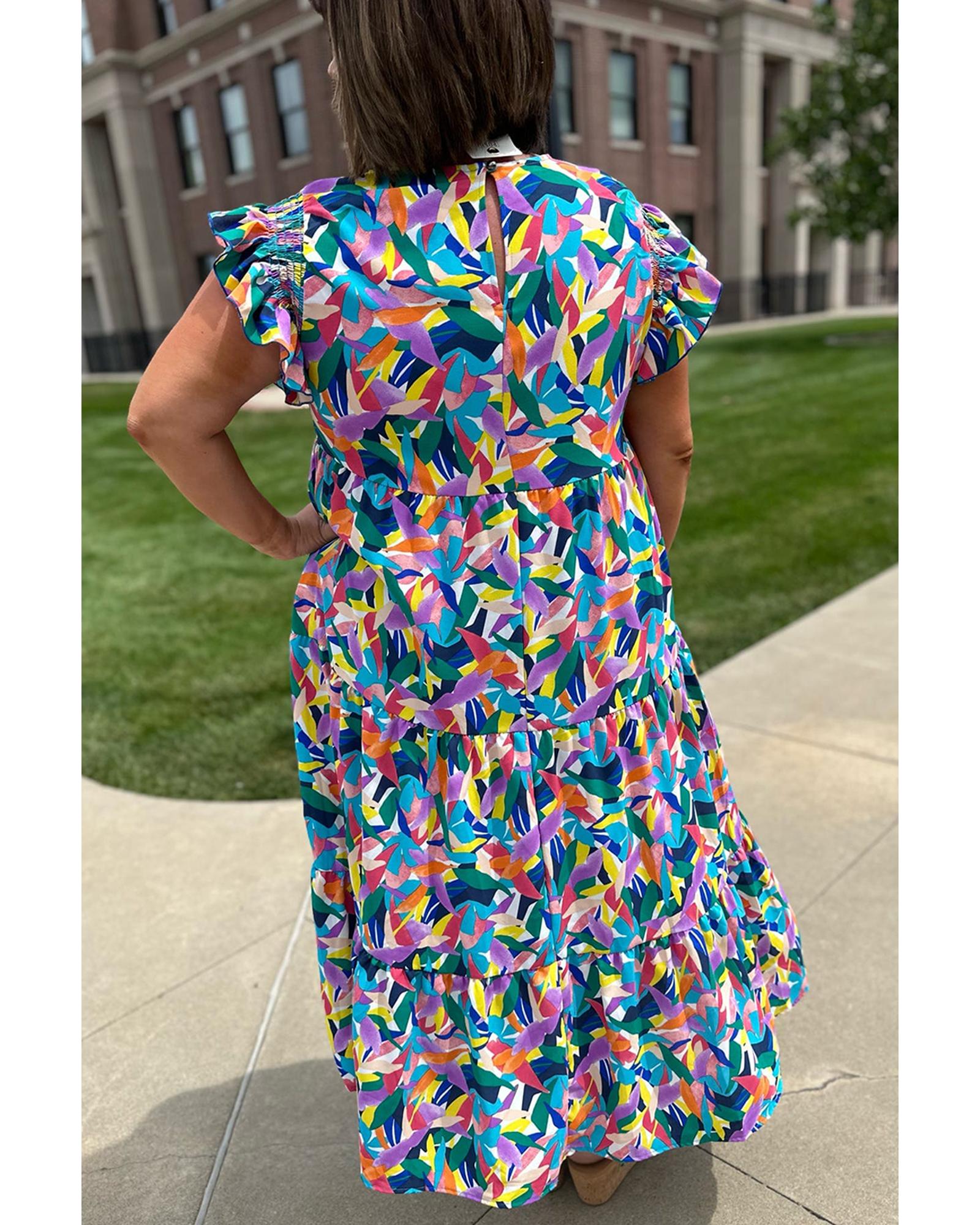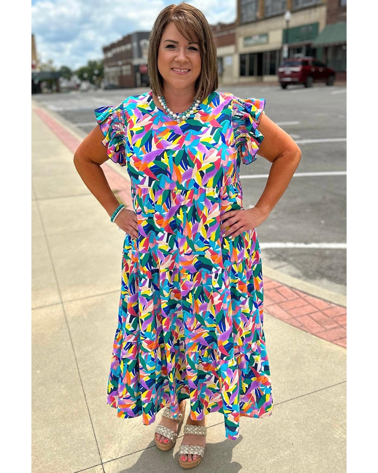 Blue Geometric Print Ruffled Short Sleeve Plus Size Tiered Maxi Dress – 4X