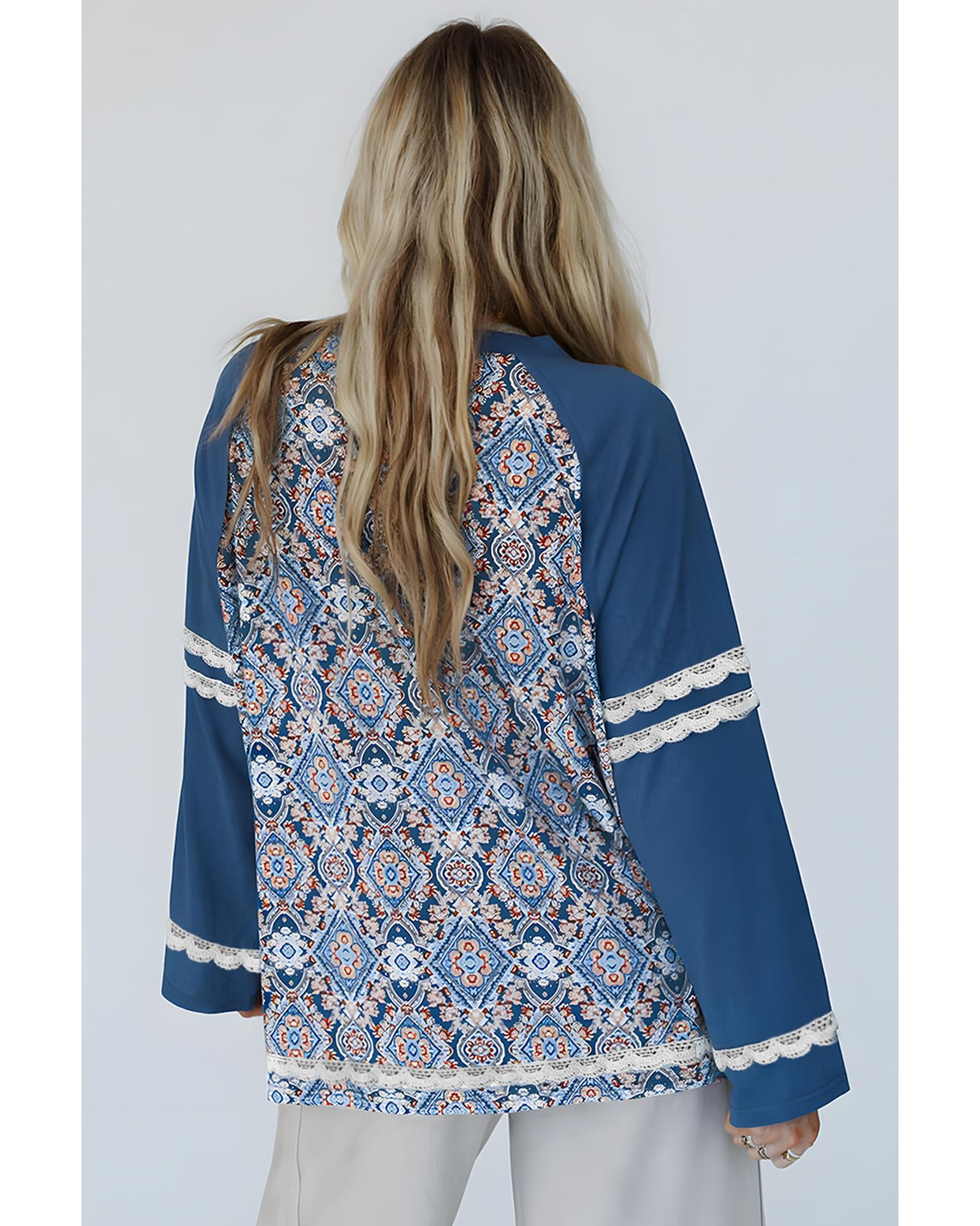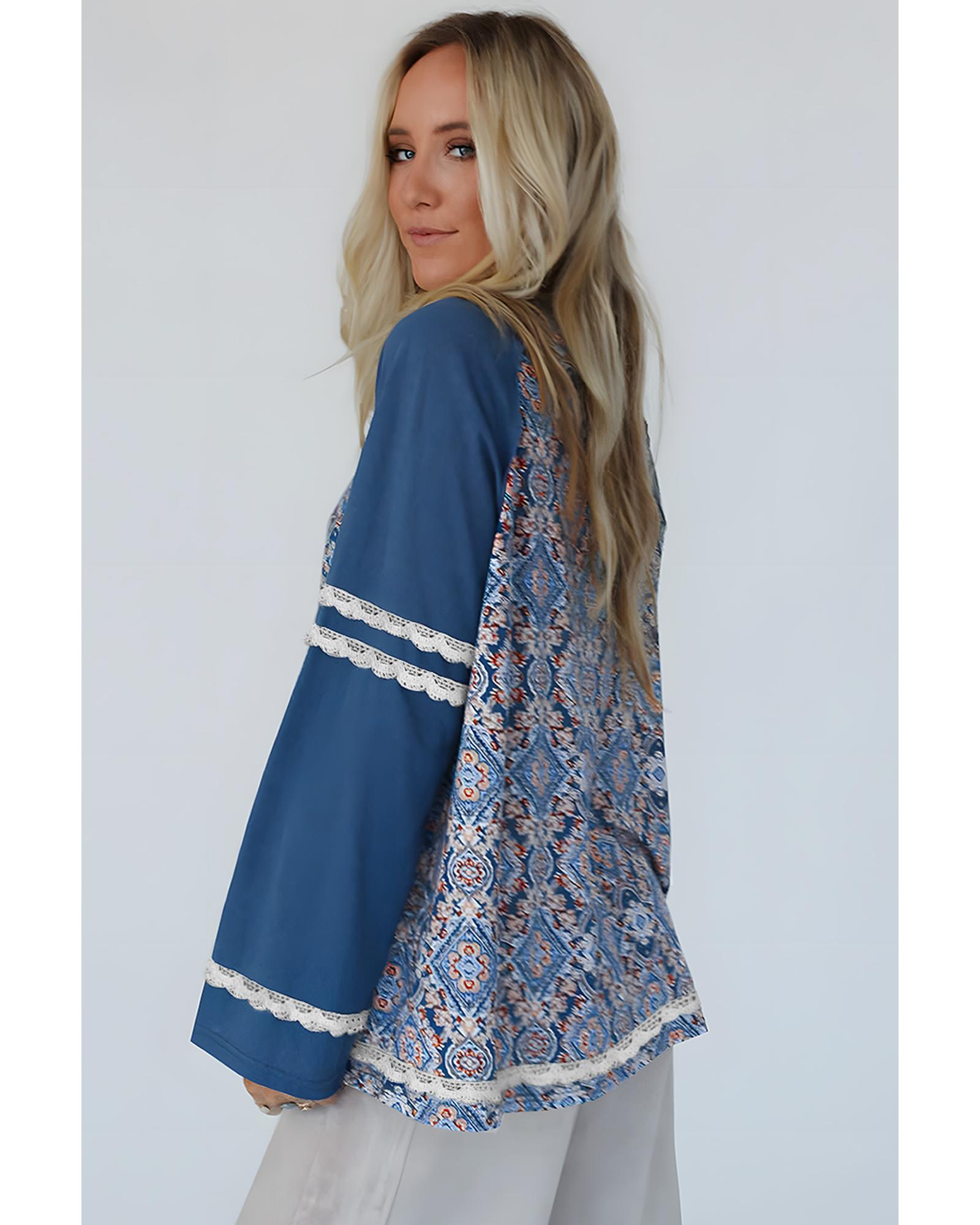 Blue Geometric Printed Lace Patchwork Ric Rac Raglan Long Sleeve Top – L