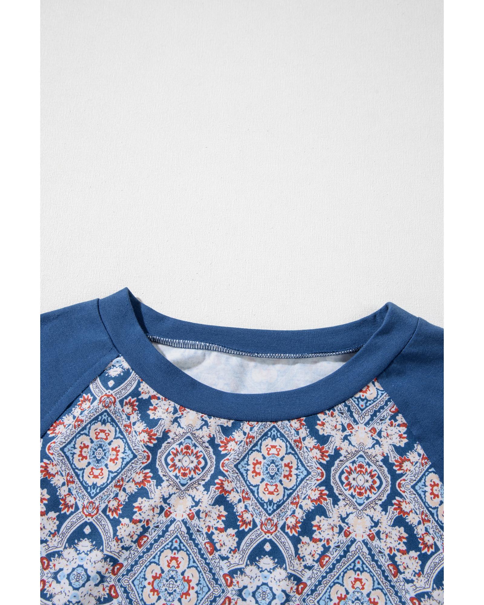 Blue Geometric Printed Lace Patchwork Ric Rac Raglan Long Sleeve Top – XL