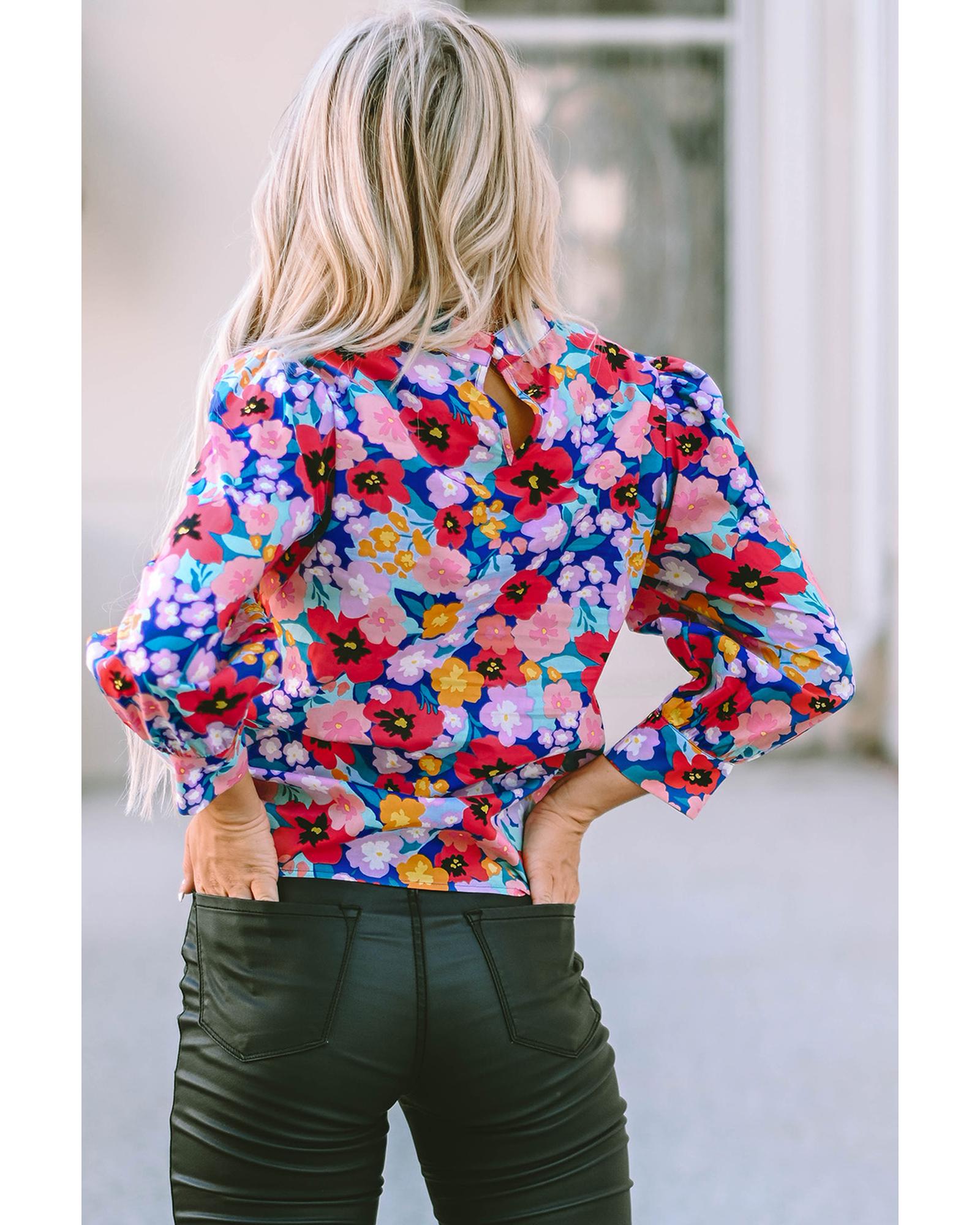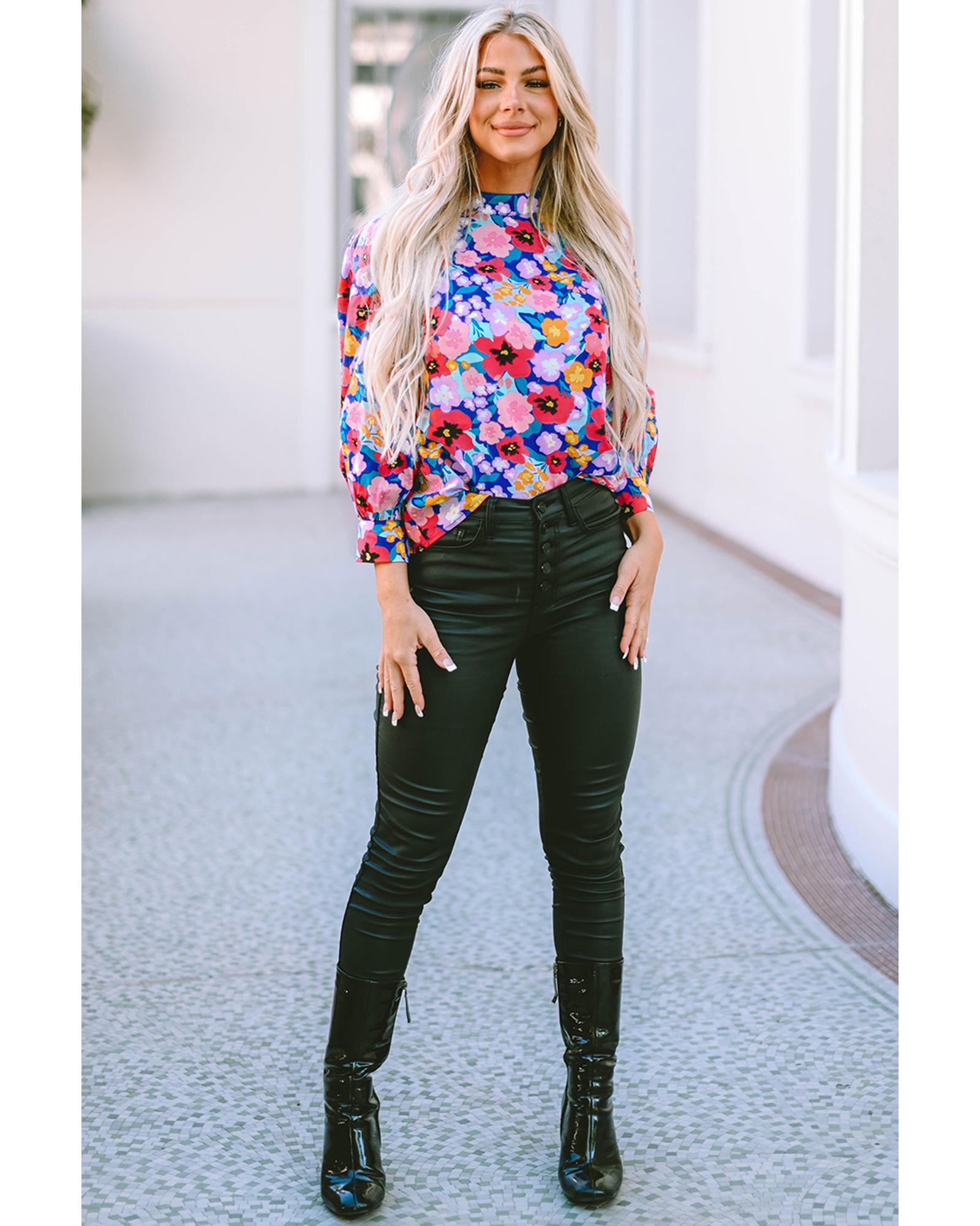 Blue Mock Neck Bubble Sleeve Floral Print Blouse – M