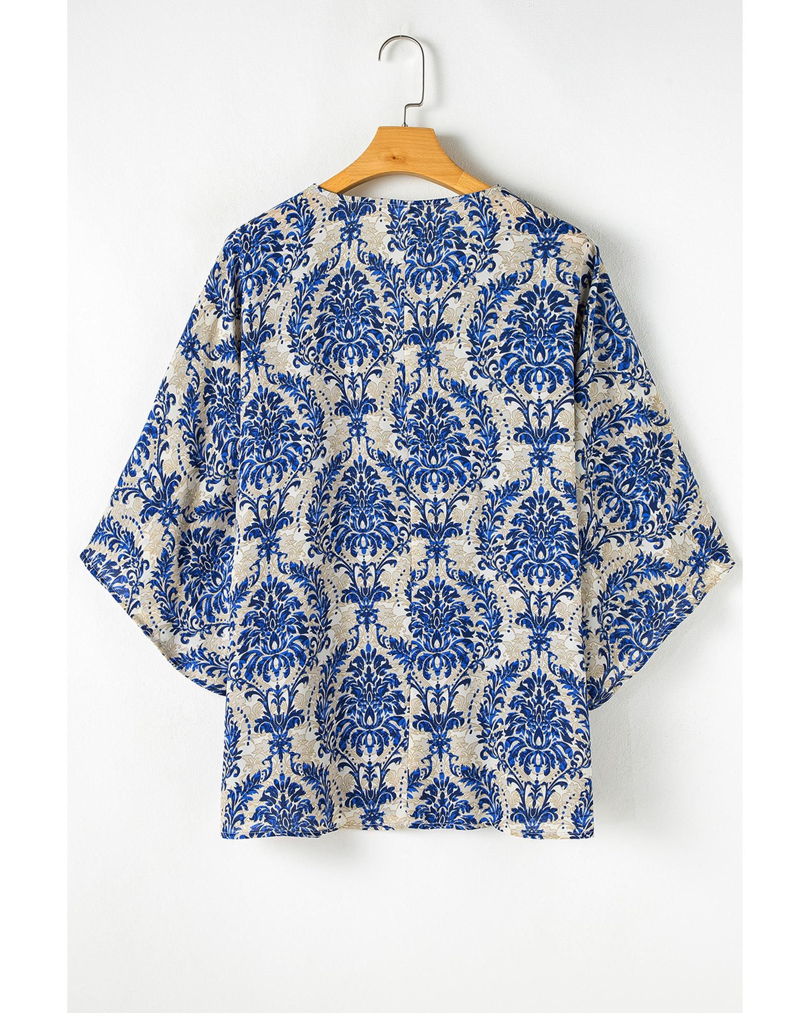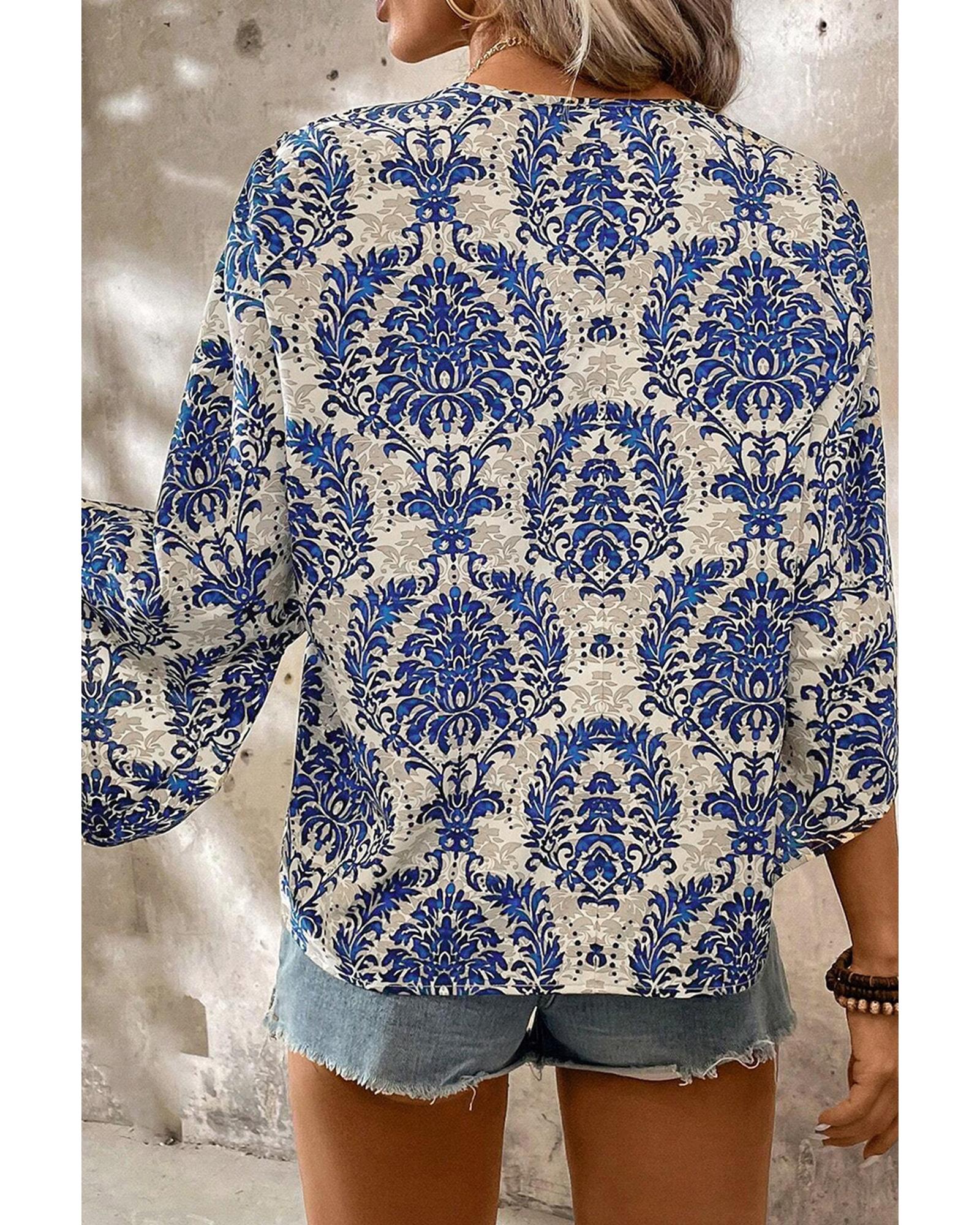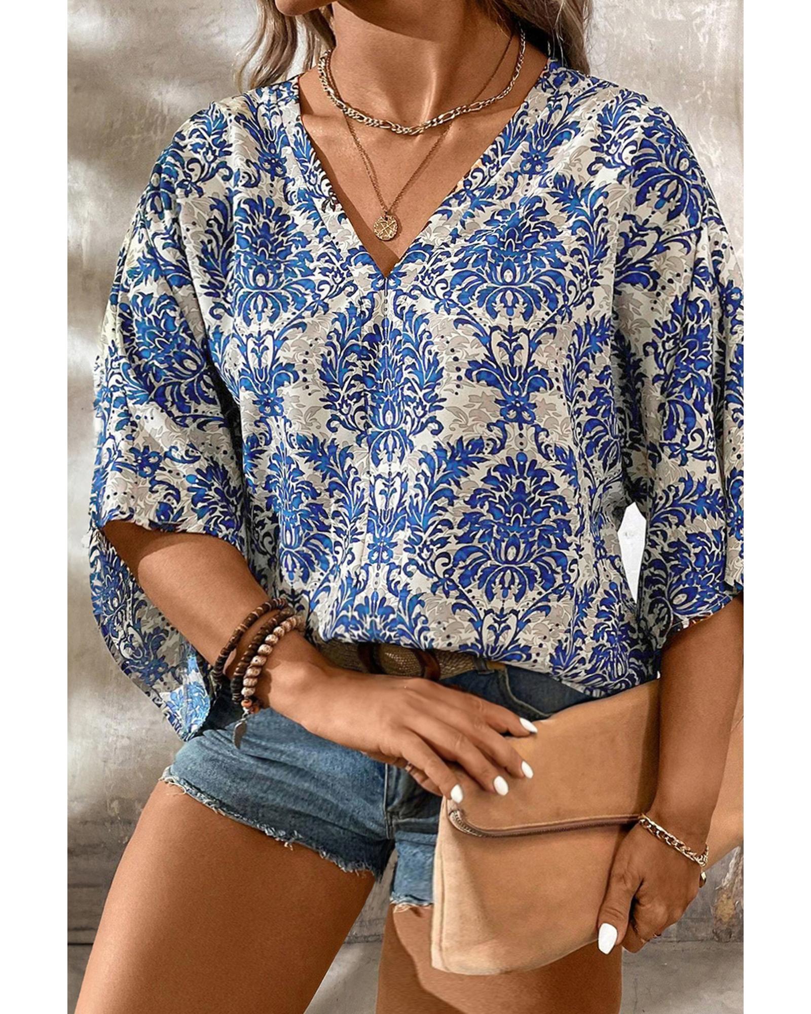Blue Plus Size Ethnic Printed 3/4 Sleeve V Neck Loose Blouse – 4X