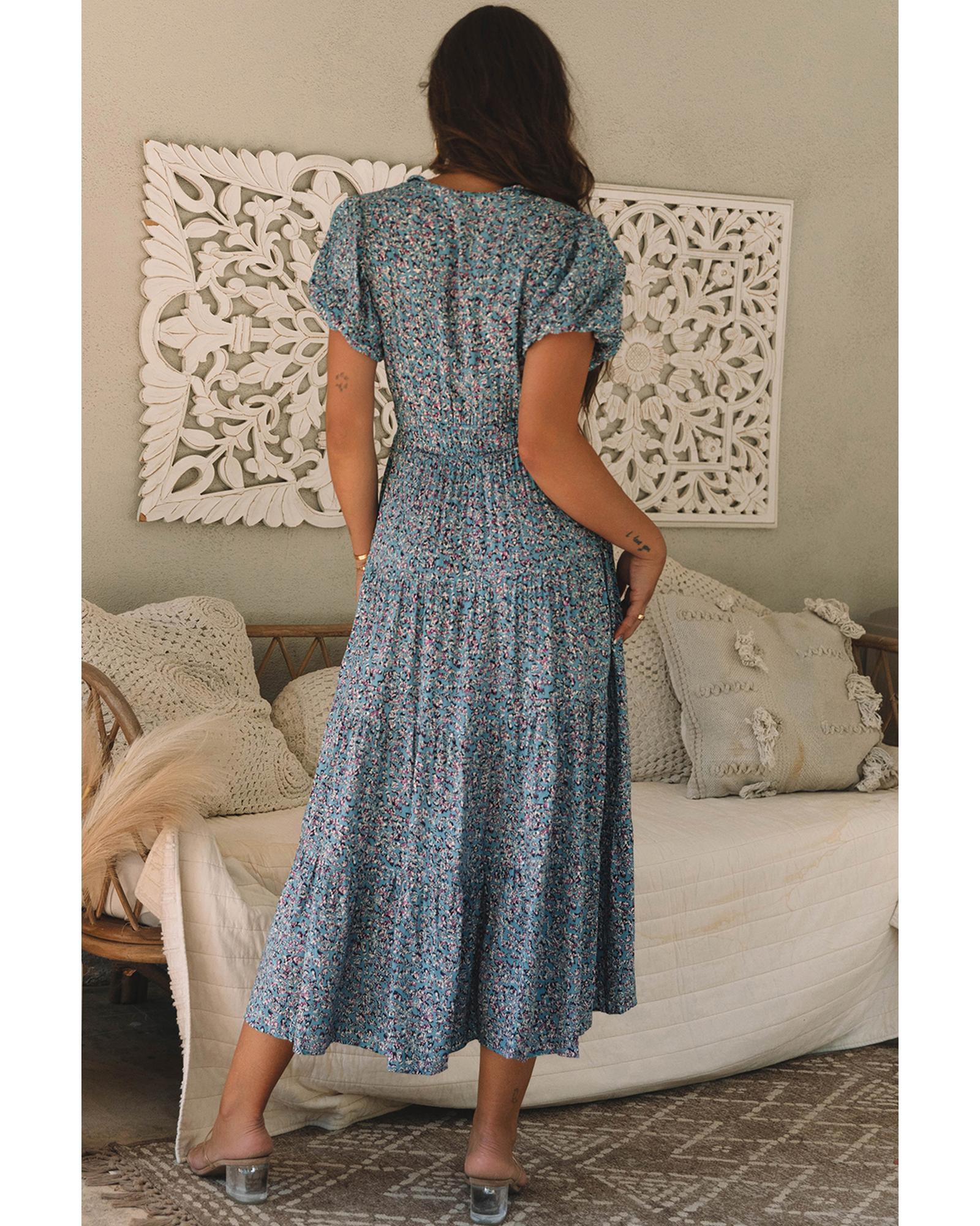 Blue Printed V Neck Shirred Short Puff Sleeve Maxi Dress – L