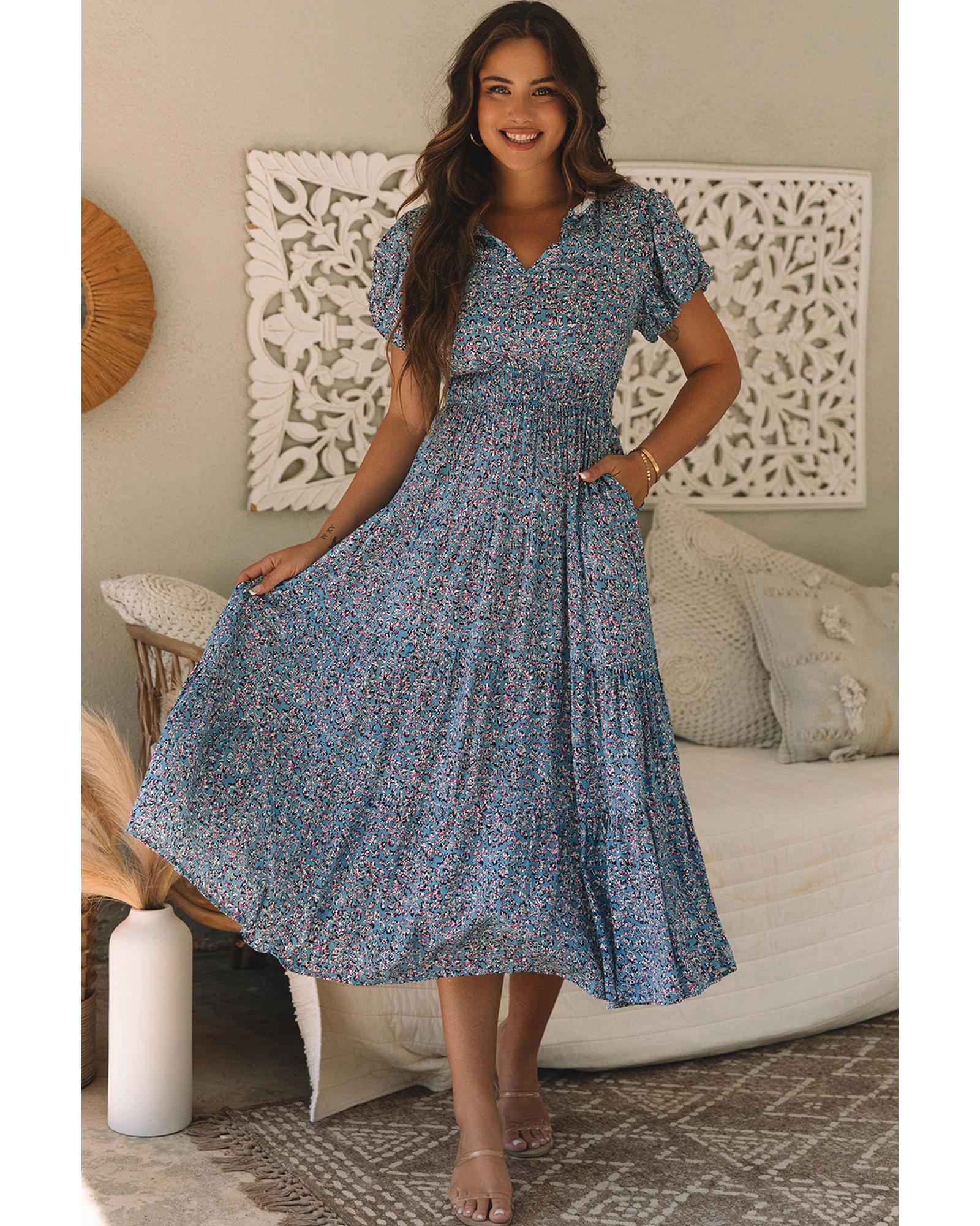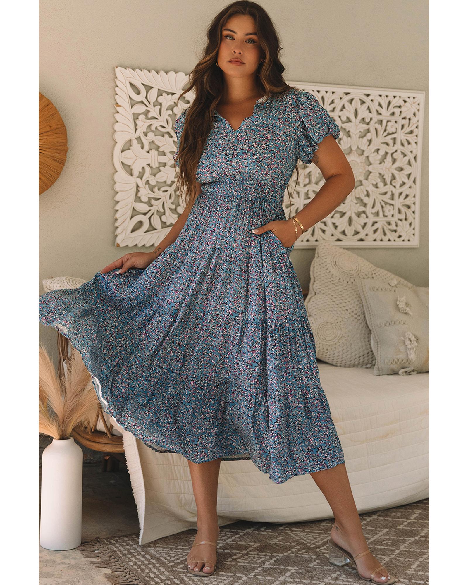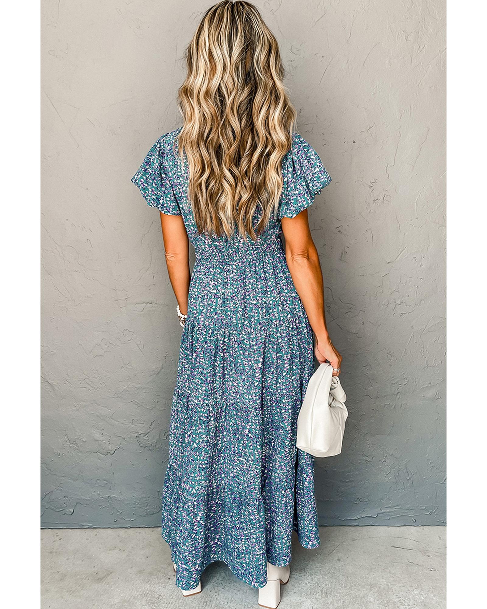 Blue Printed V Neck Shirred Short Puff Sleeve Maxi Dress – S