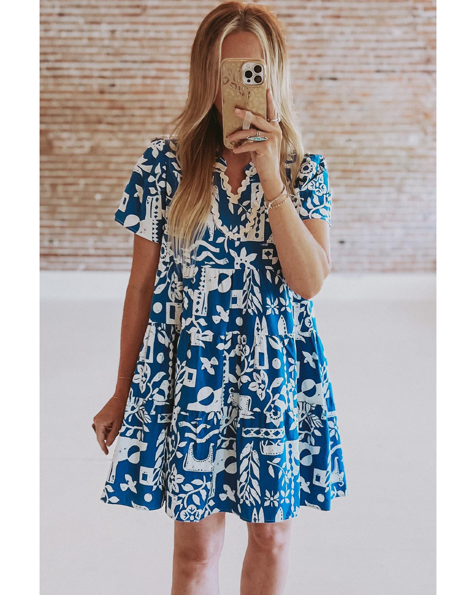 - Blue Ricrac Trim Split Neck Floral Loose Dress