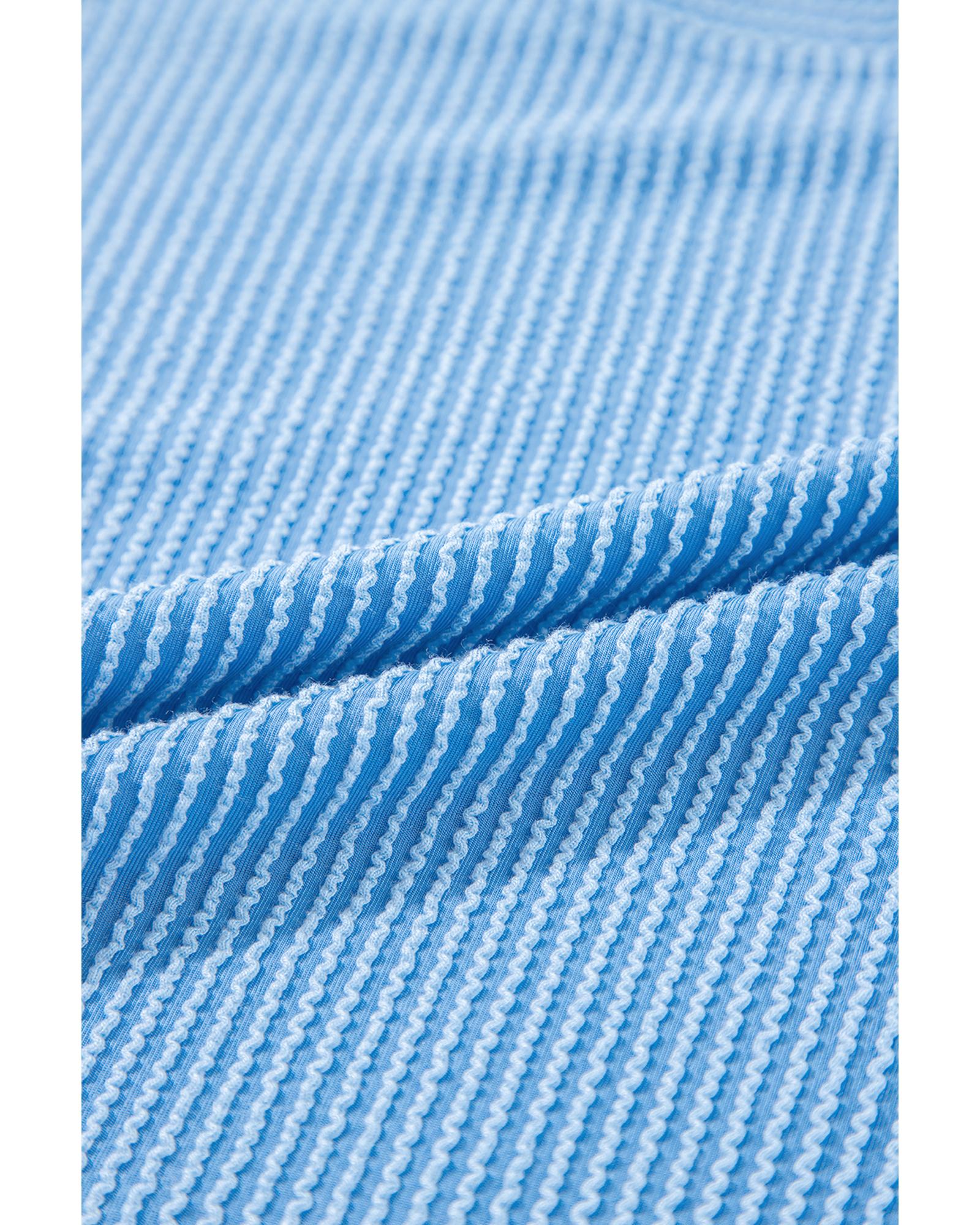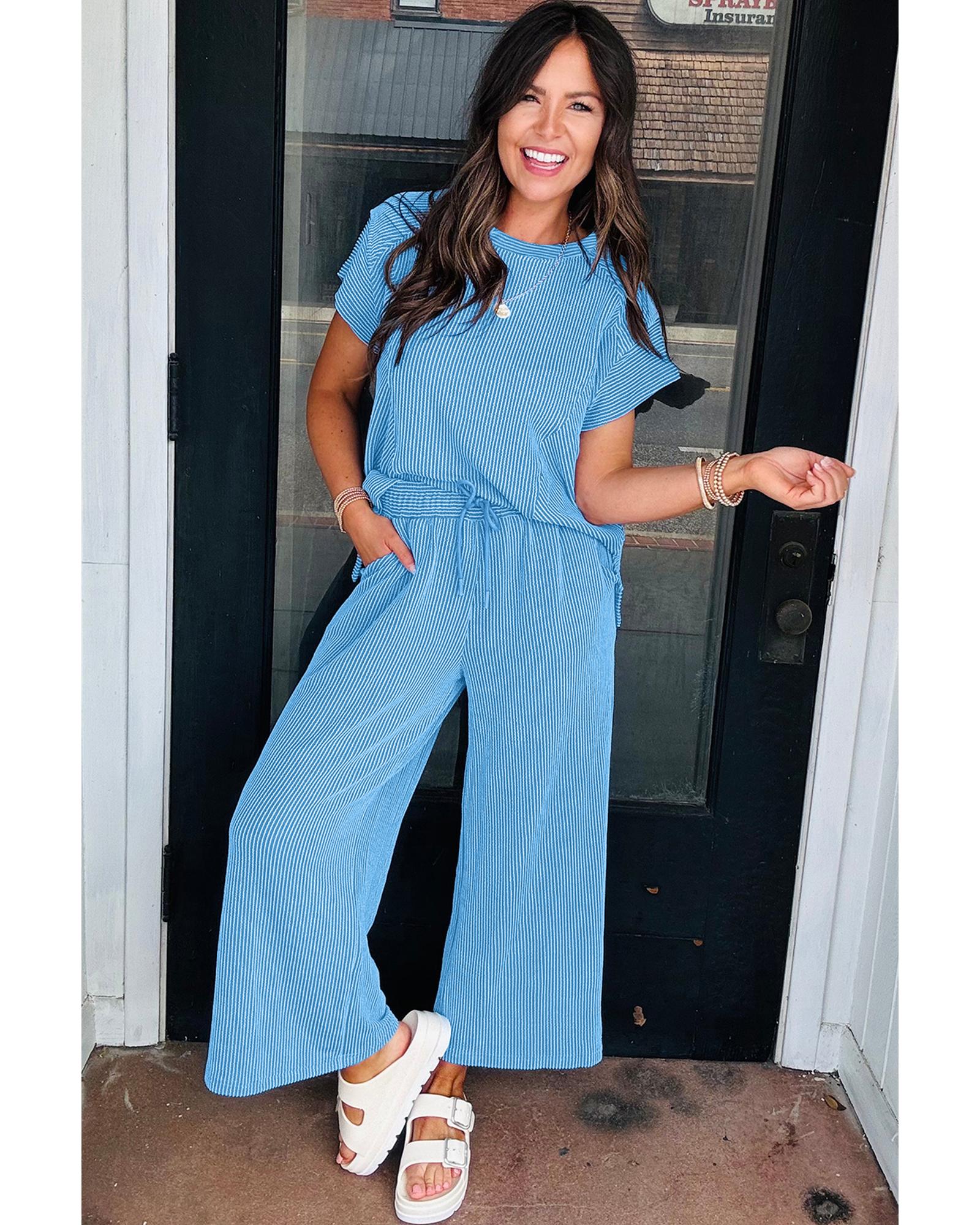 Blue Solid Corded Knit Short Sleeve T Shirt and Wide Leg Pants Set – L