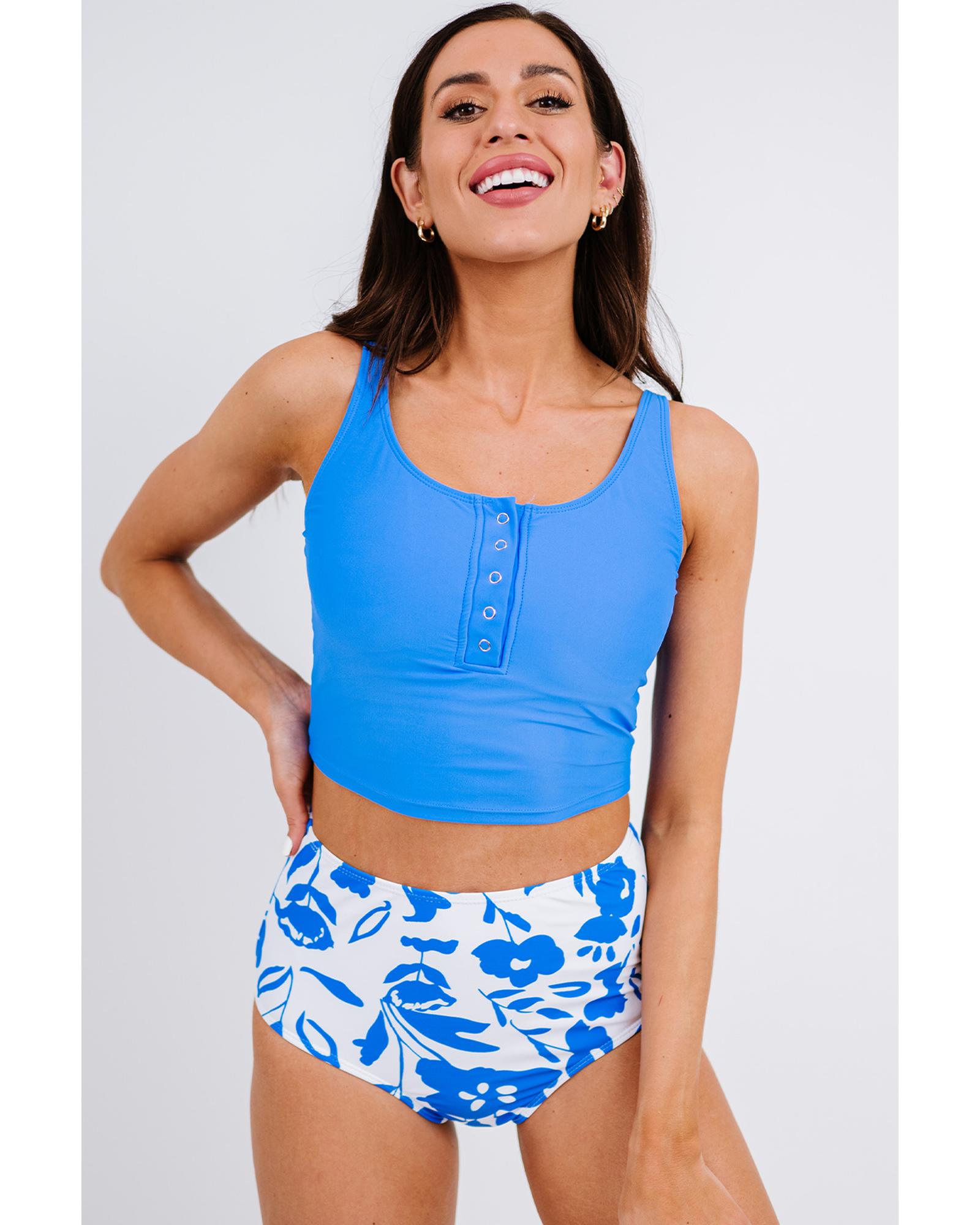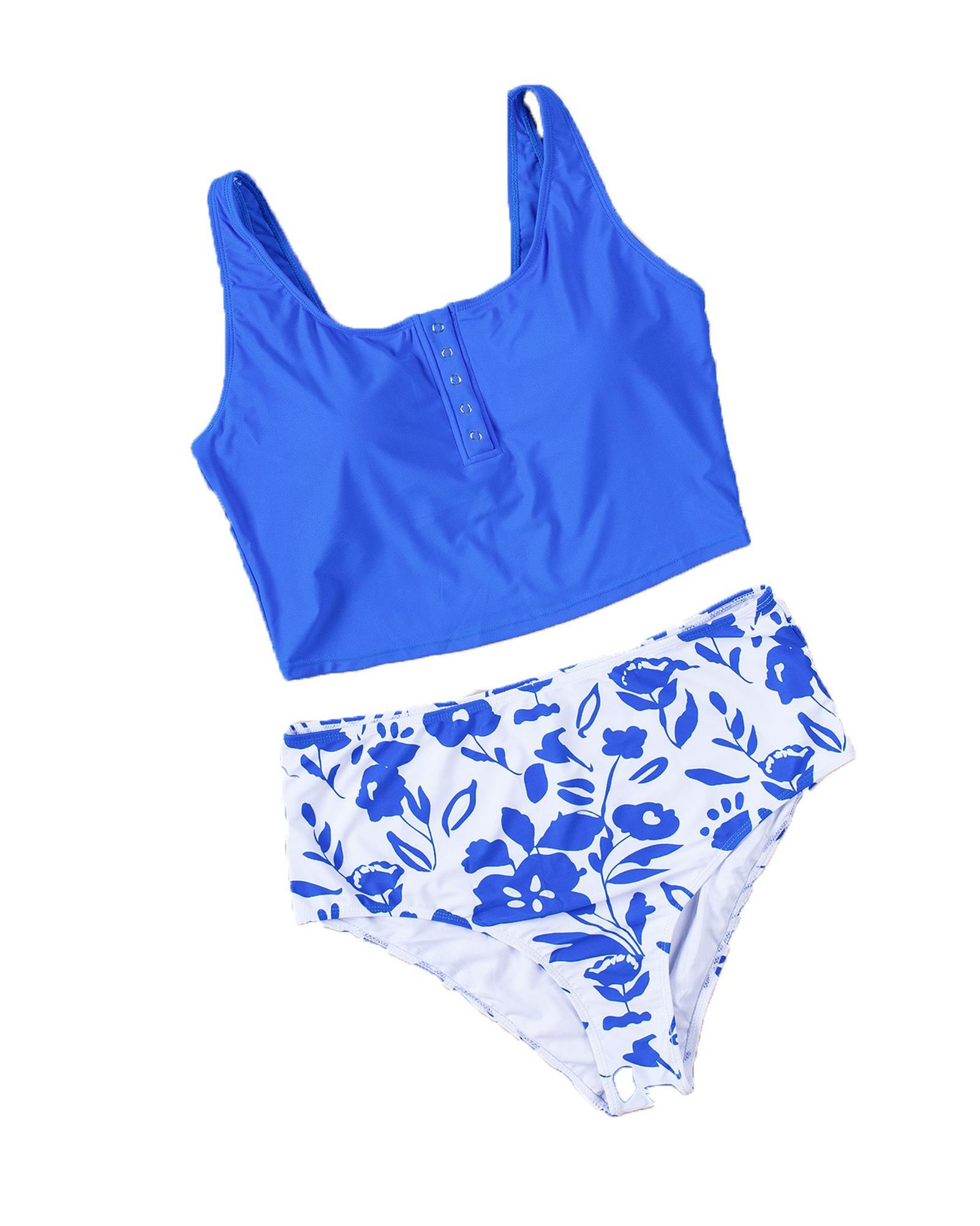Blue Square Neck Sleeveless Fashion Print Tankini Set – S