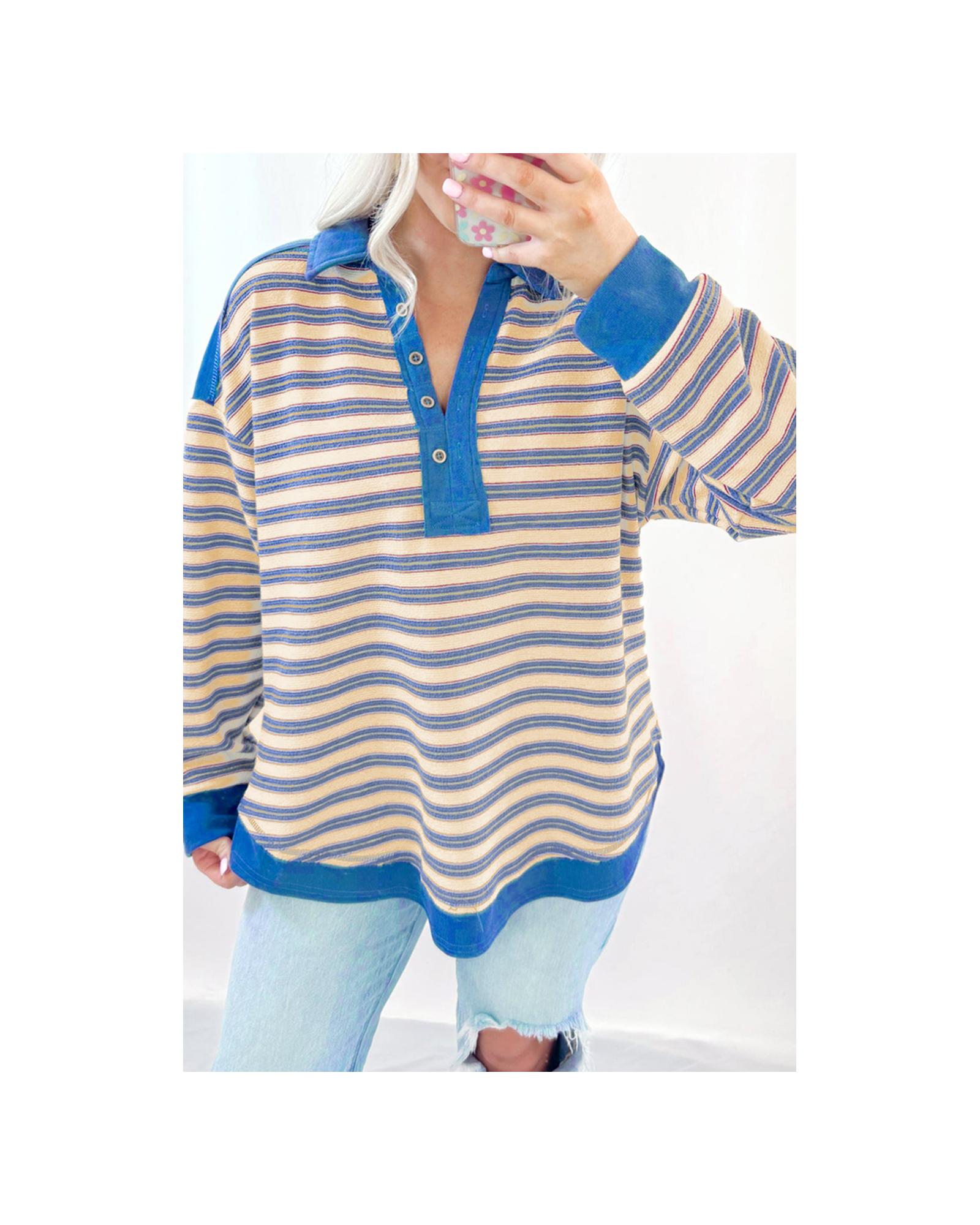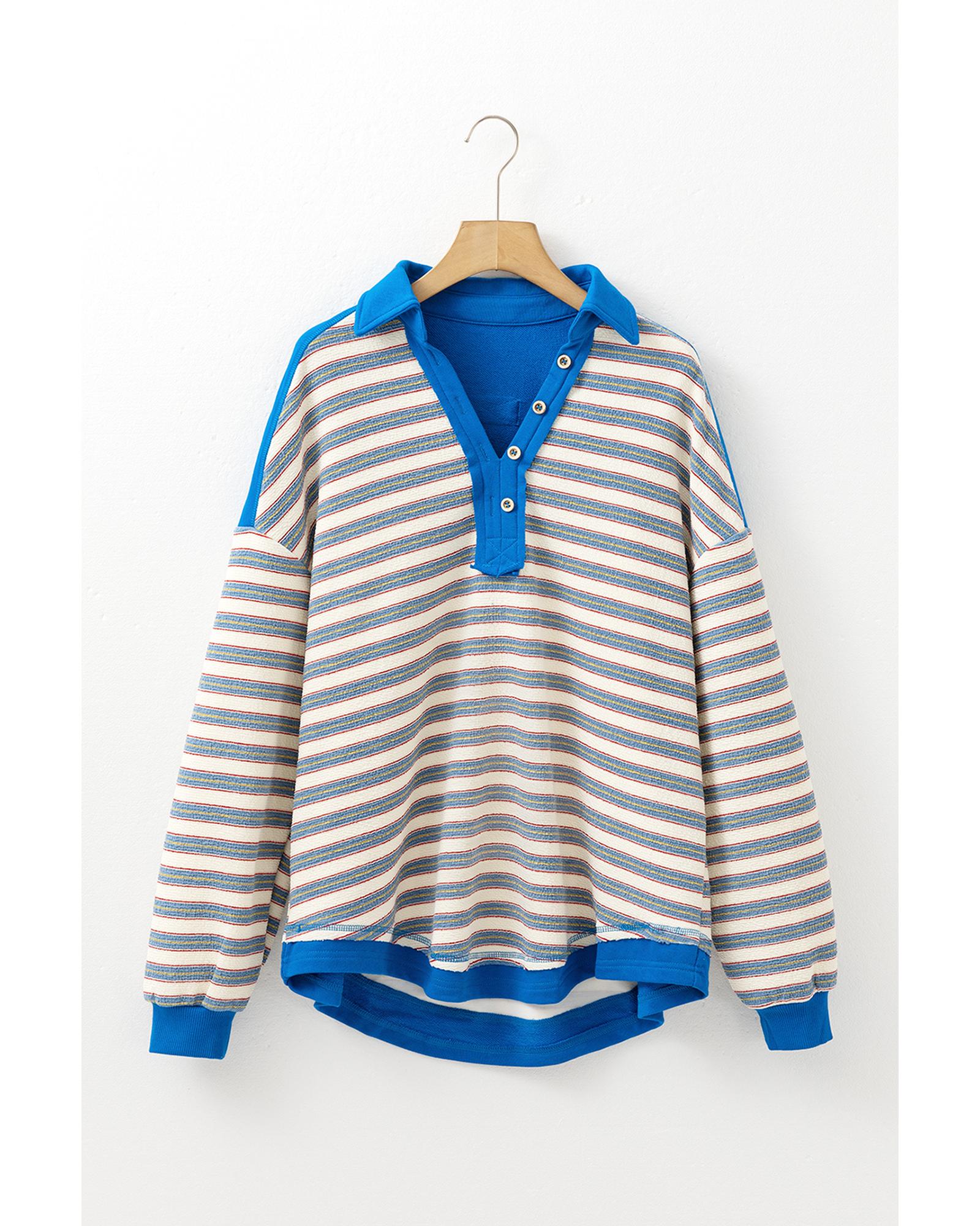 Blue Stripe Buttoned V Neck Collared Drop Shoulder Top – L