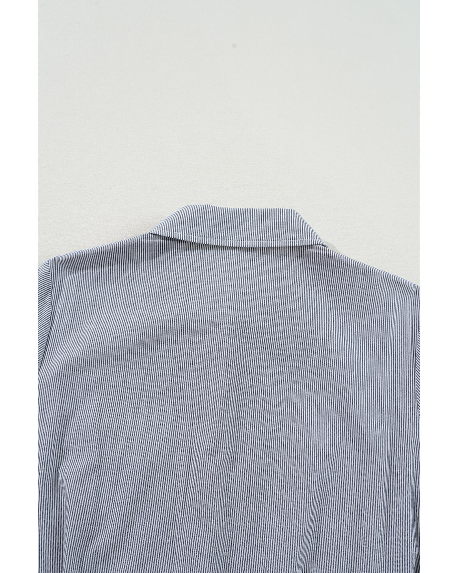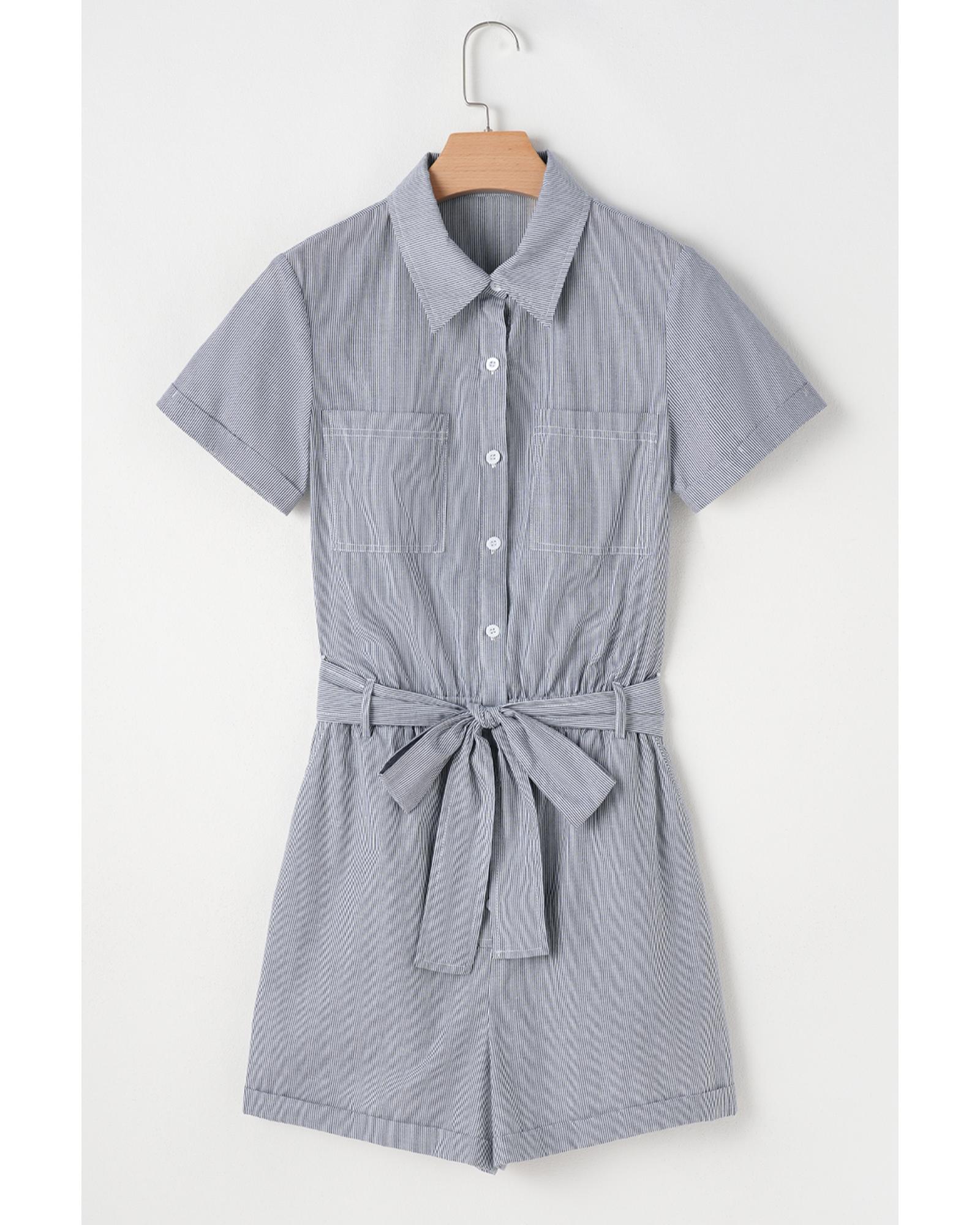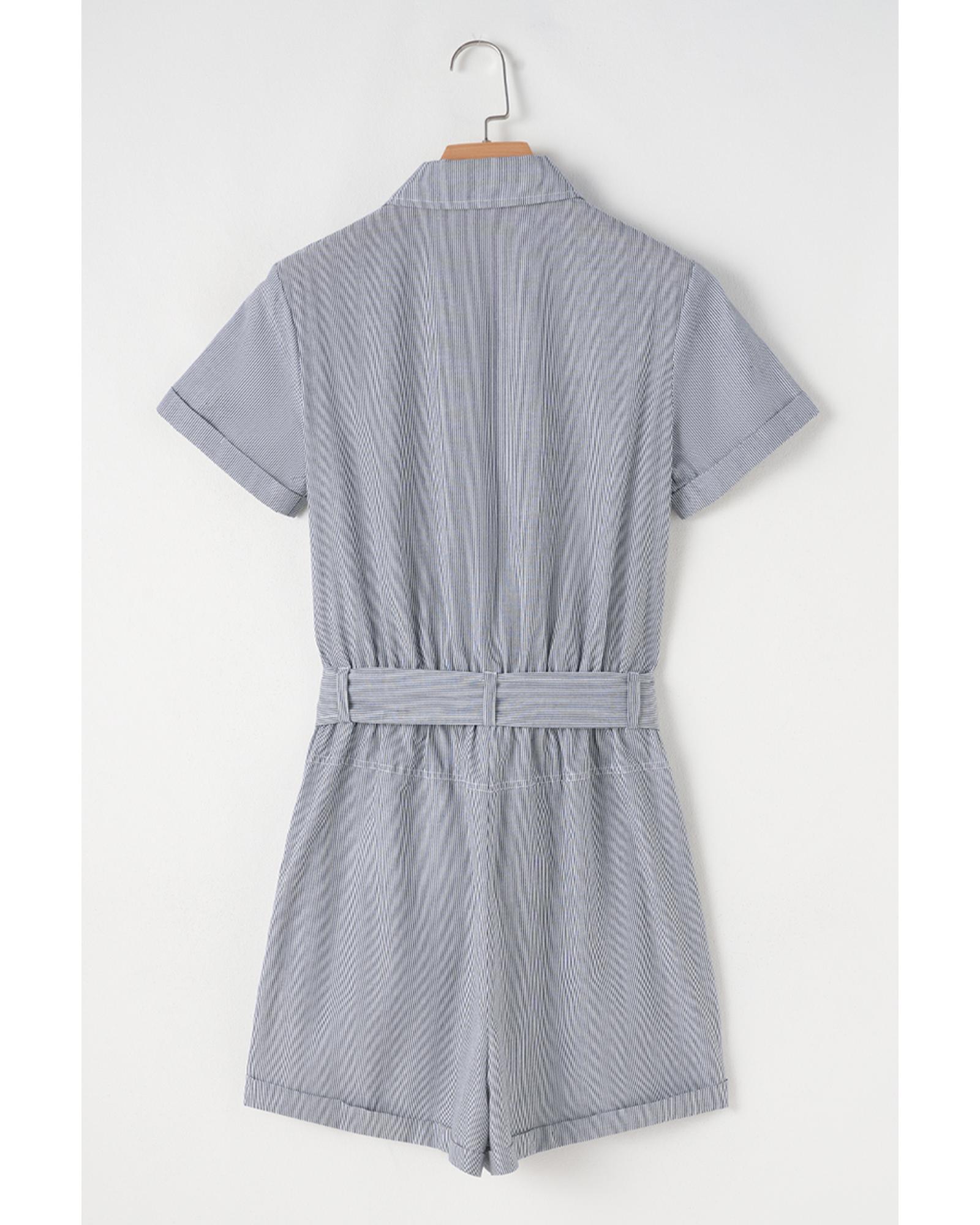 Blue Stripe Chest Pockets Buttoned Belted High Waist Romper – S