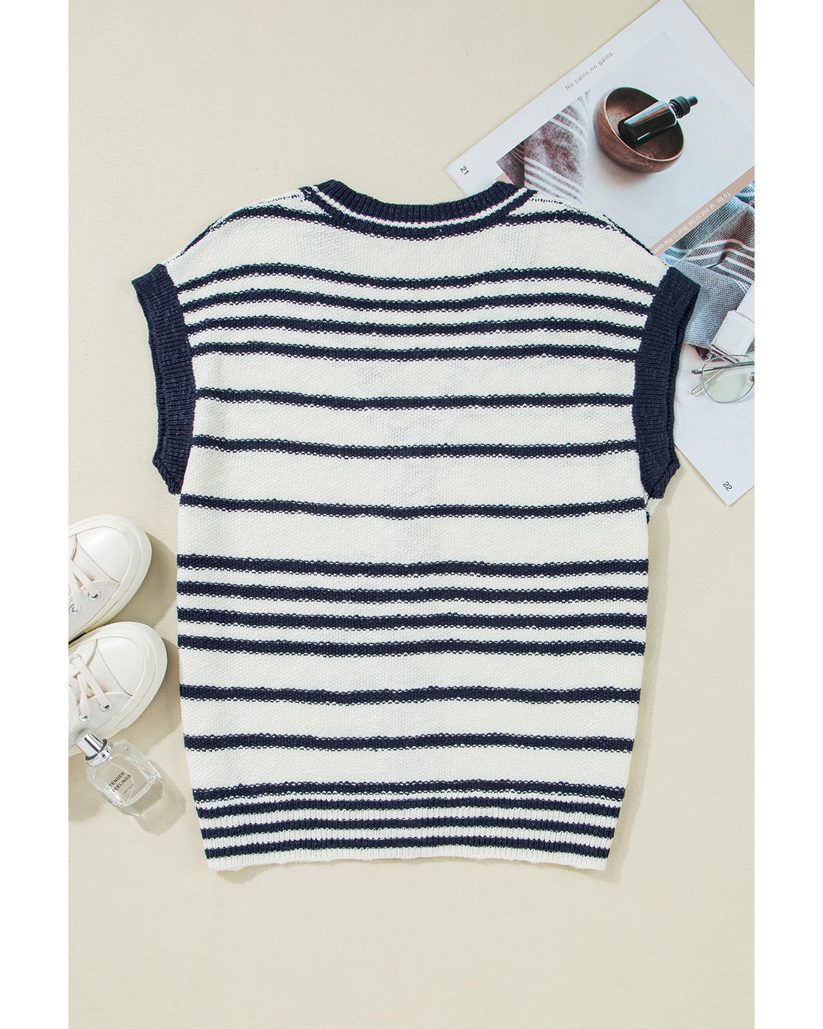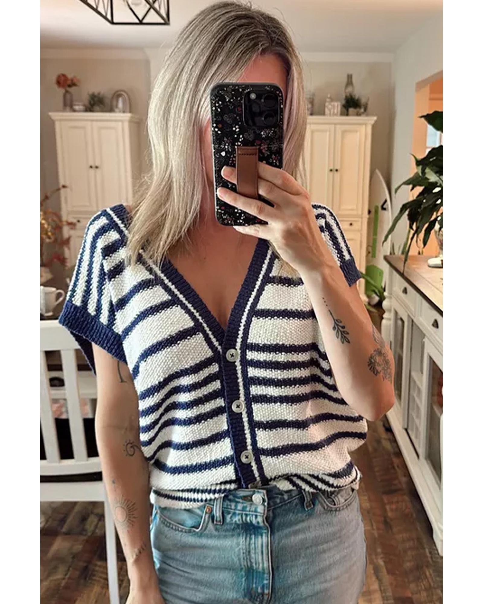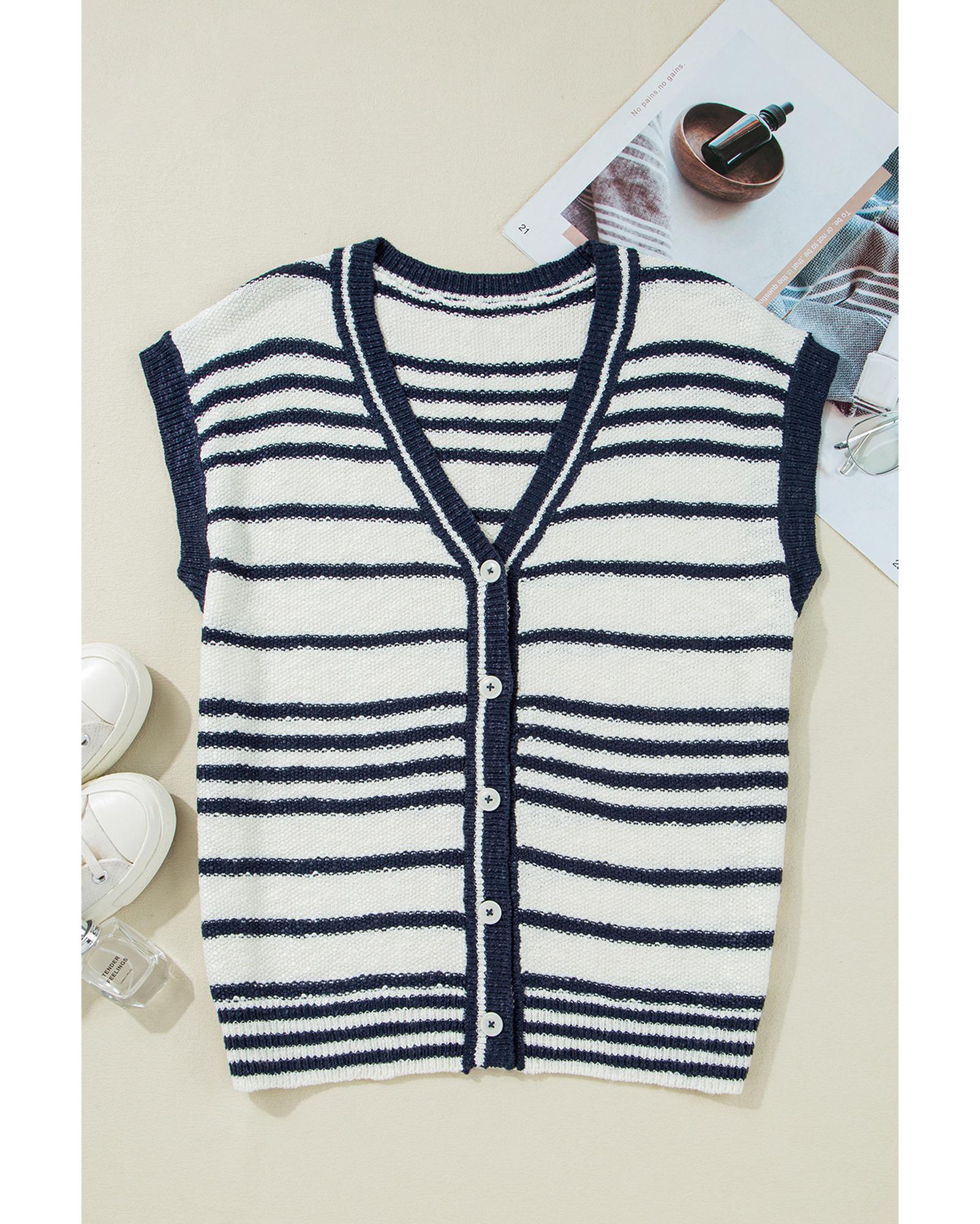 - Blue Stripe Loose Buttoned V Neck Sweater Vest